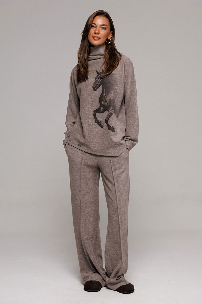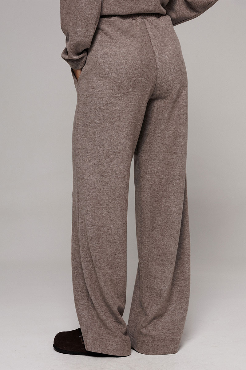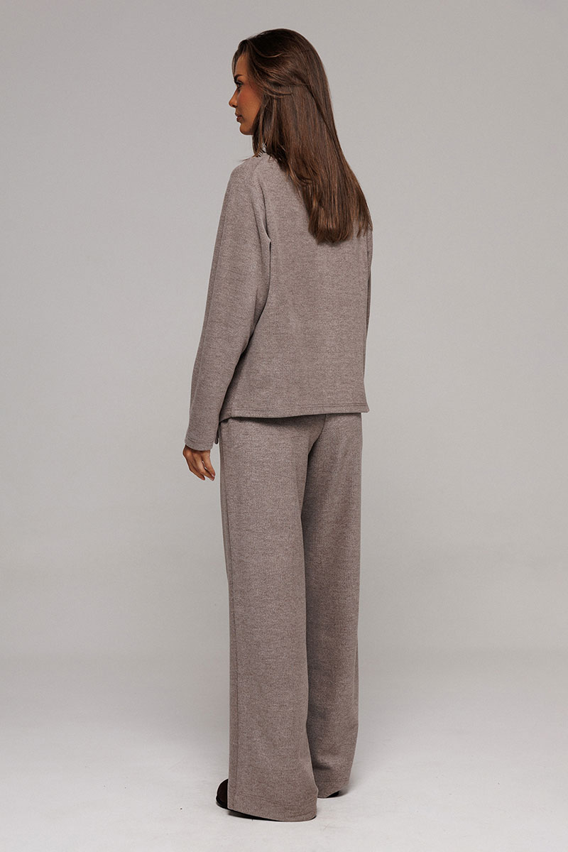 Брюки из трикотажного полотна с велюровым эффектом прямого силуэта на притачном, отстроченном поясе со вставленной в него резинкой. Полочка с защипами от пояса до низа брюк. Брюки с карманами в боковых швах.