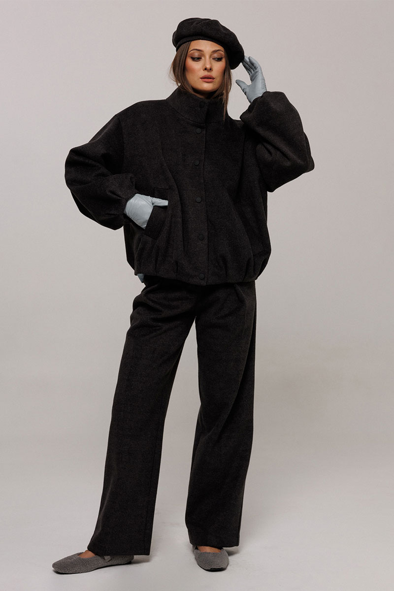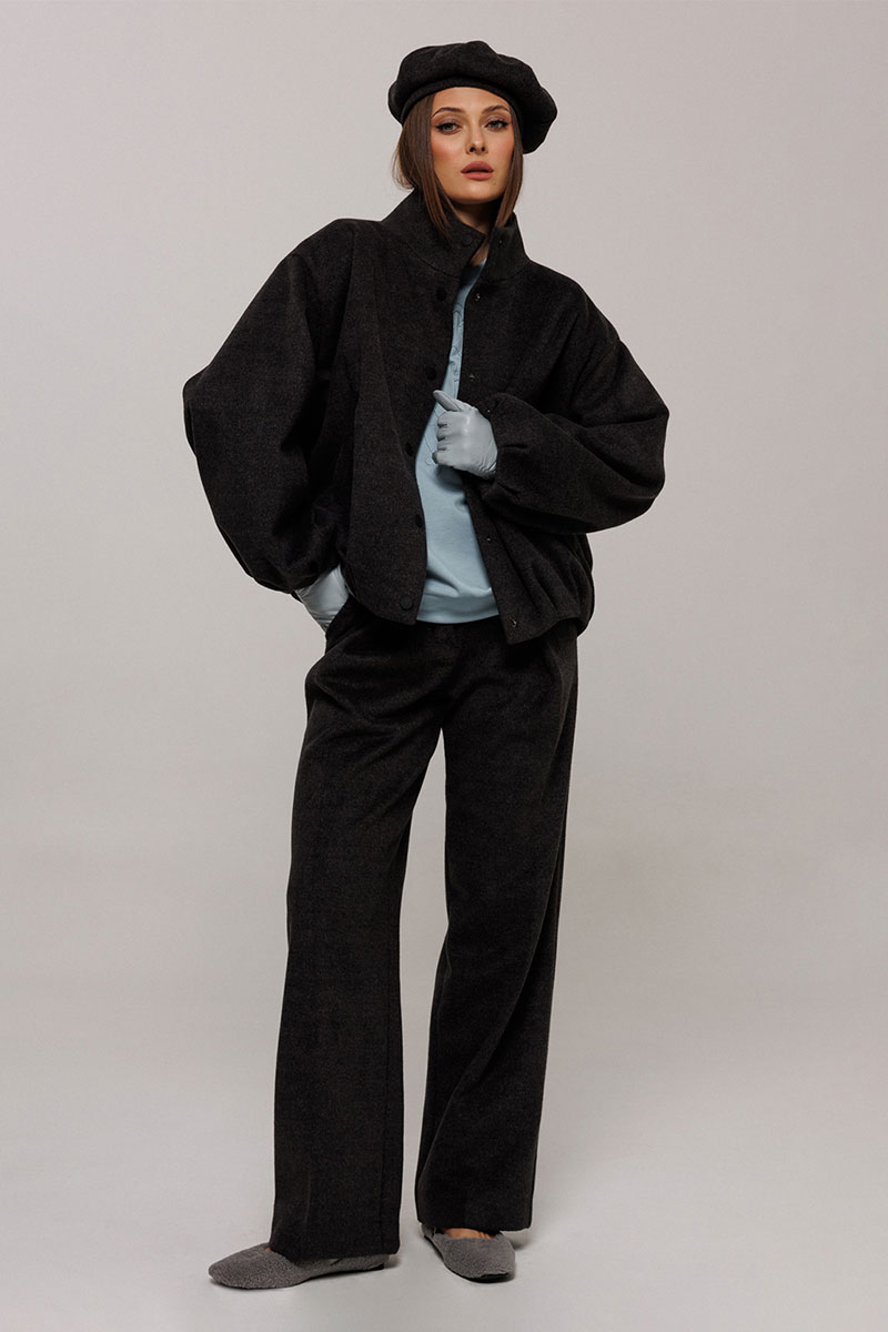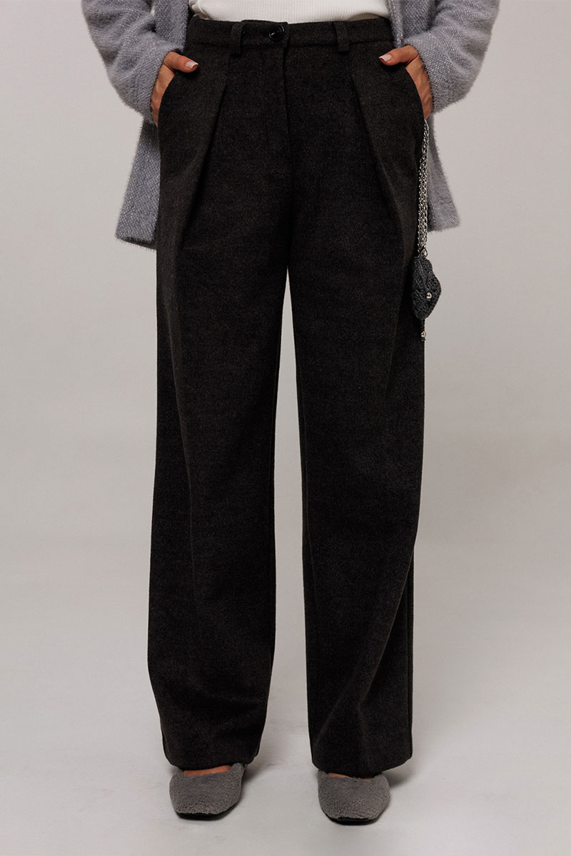 Брюки из пальтовой ткани прямого силуэта на притачном поясе со шлевками и застежкой-гульфик. Пояс застегивается на крючок и потайную петлю-пуговицу. Перед со складкой и заутюженной стрелкой от складки по всей длине брюк и карманами в боковых швах с наклонным входом. Спинка с вытачкой от пояса и заутюженной стрелкой по все длине брюк.