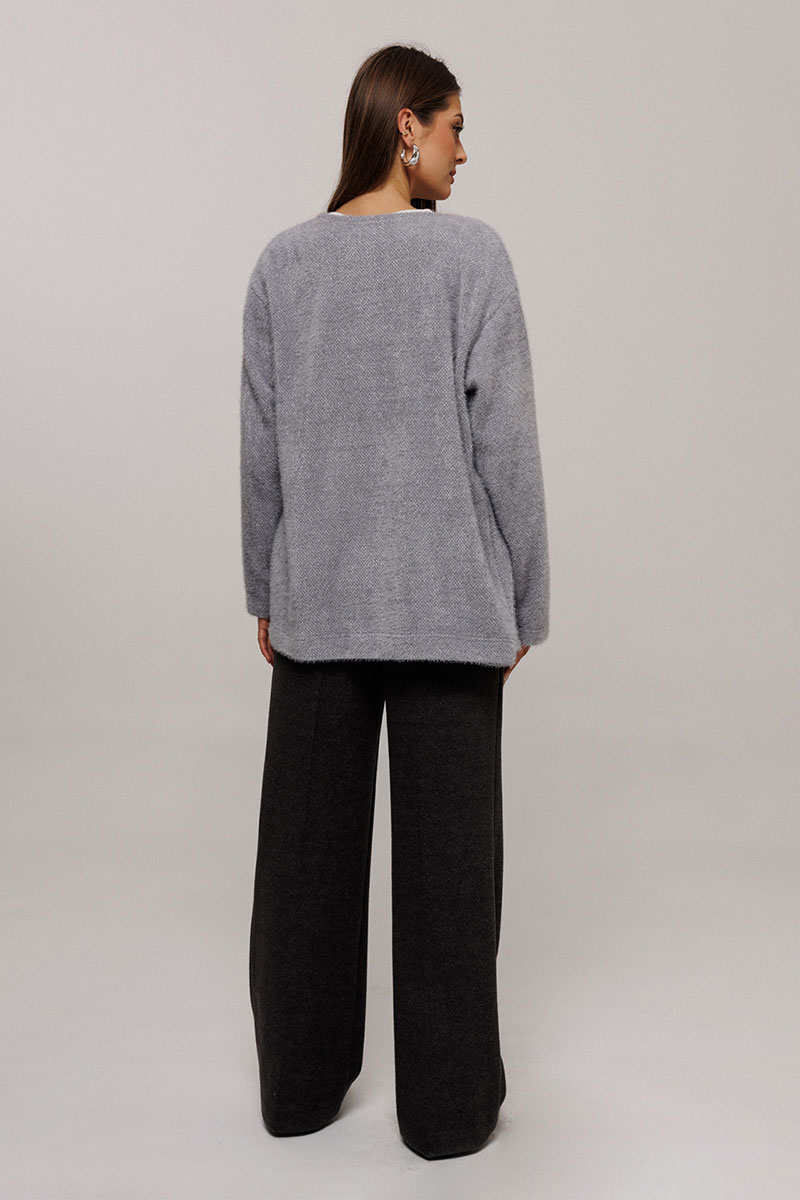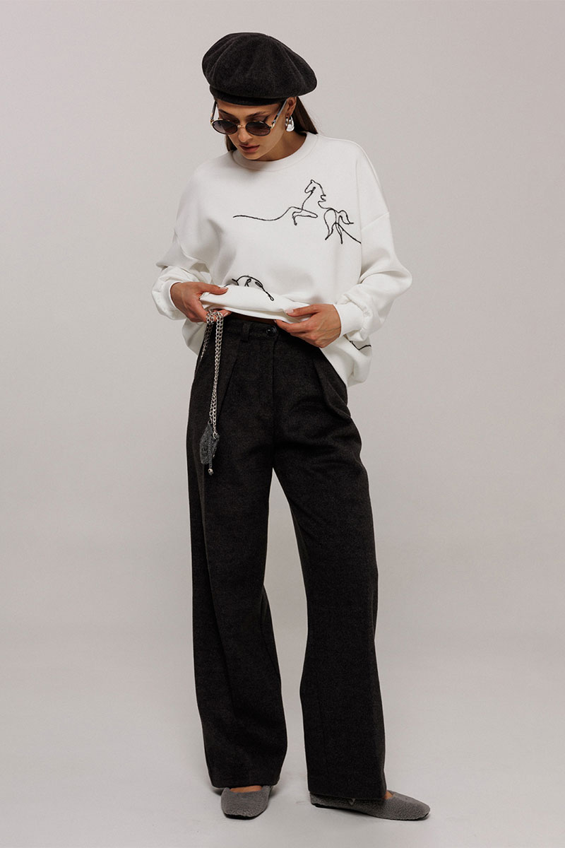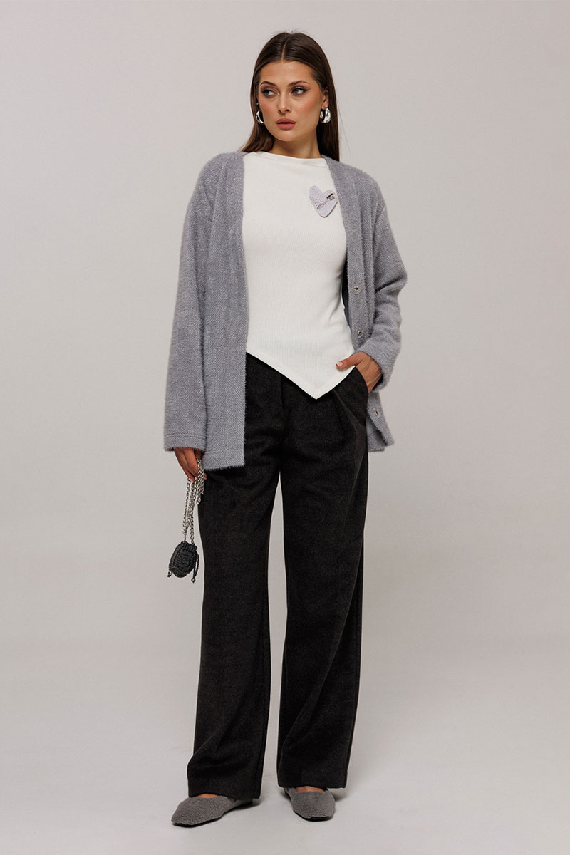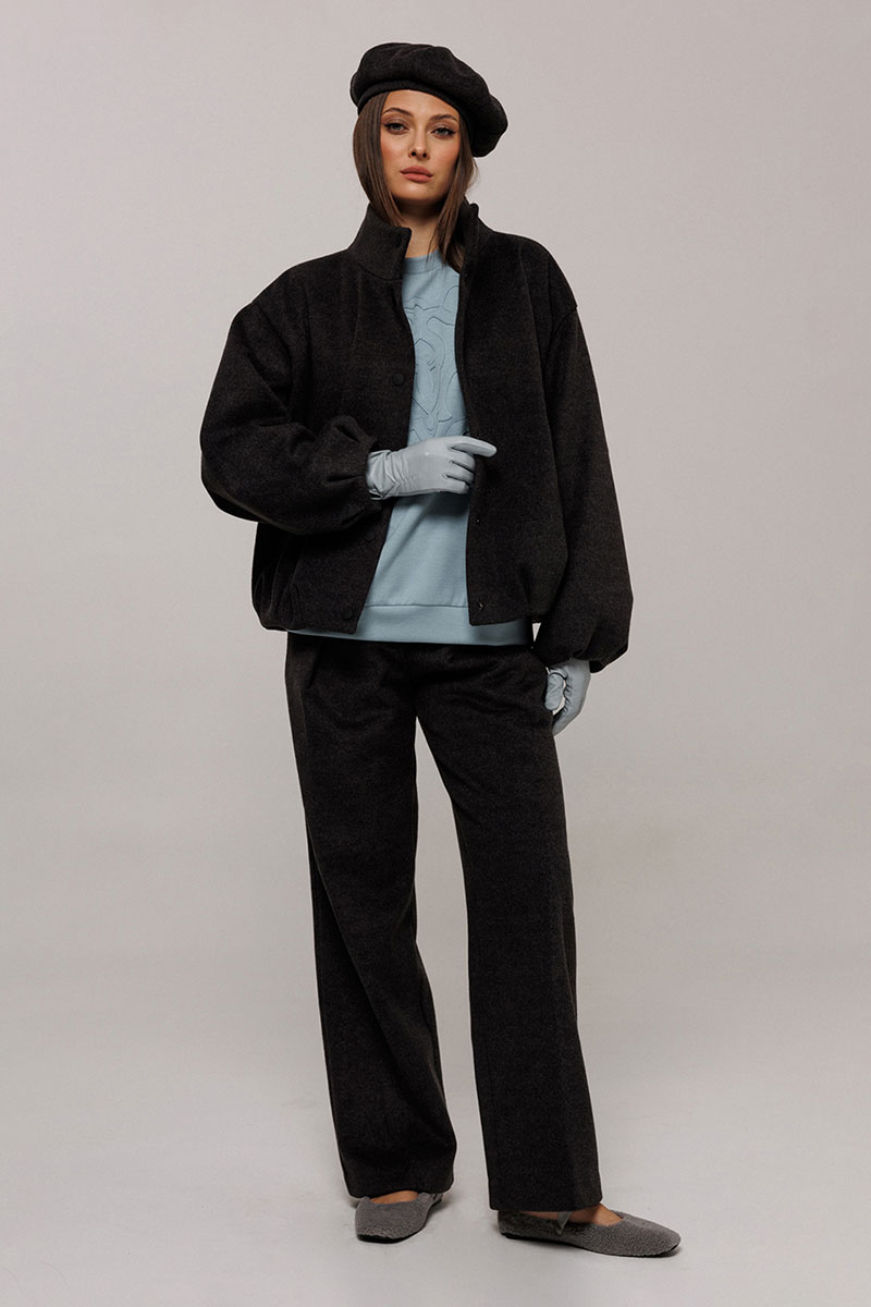 Брюки из пальтовой ткани прямого силуэта на притачном поясе со шлевками и застежкой-гульфик. Пояс застегивается на крючок и потайную петлю-пуговицу. Перед со складкой и заутюженной стрелкой от складки по всей длине брюк и карманами в боковых швах с наклонным входом. Спинка с вытачкой от пояса и заутюженной стрелкой по все длине брюк.