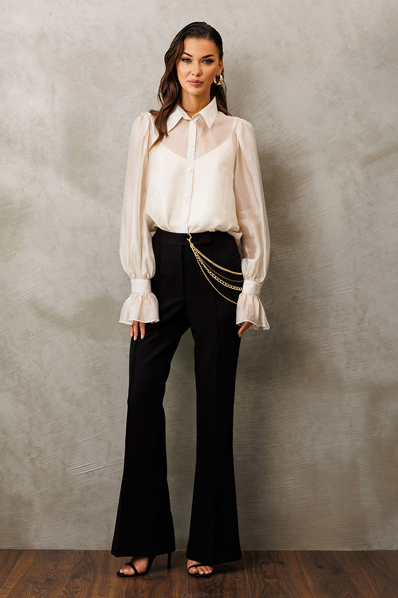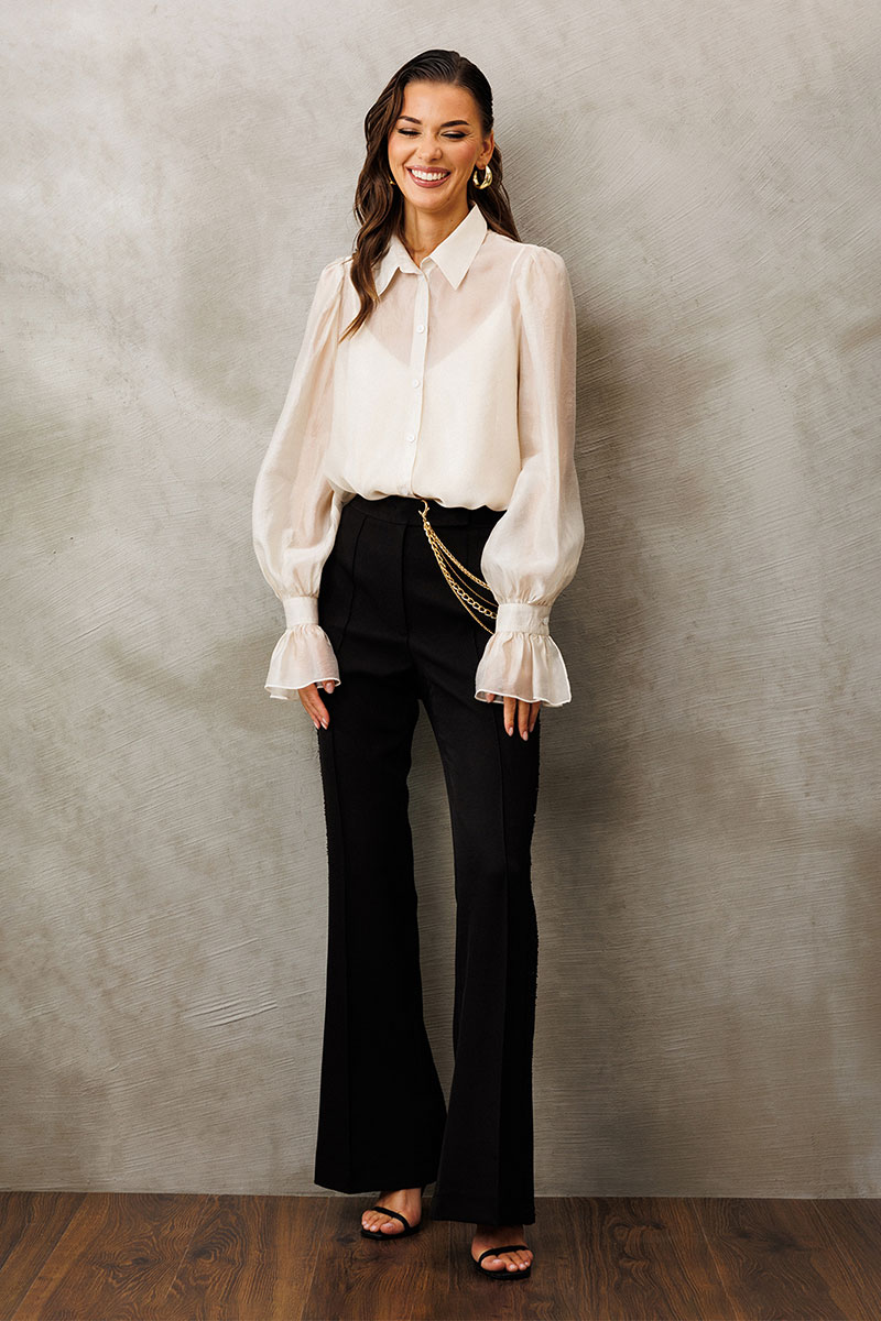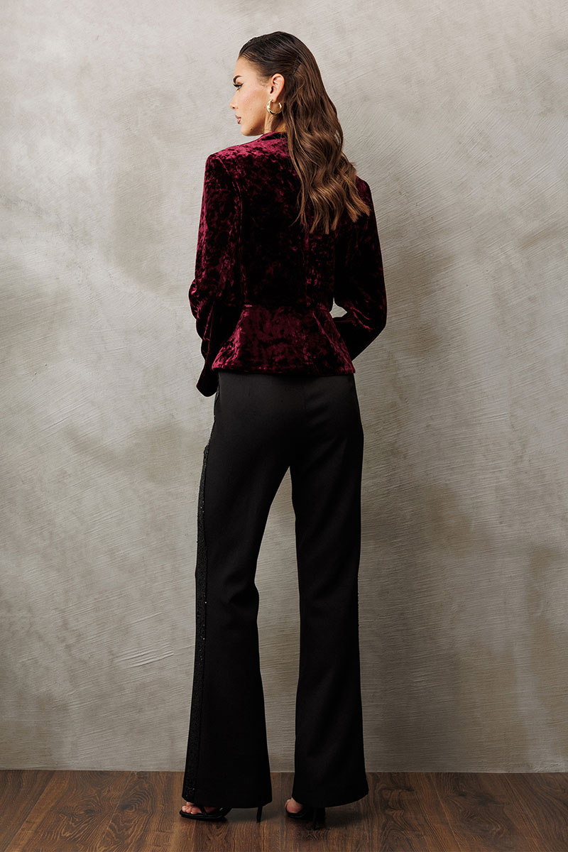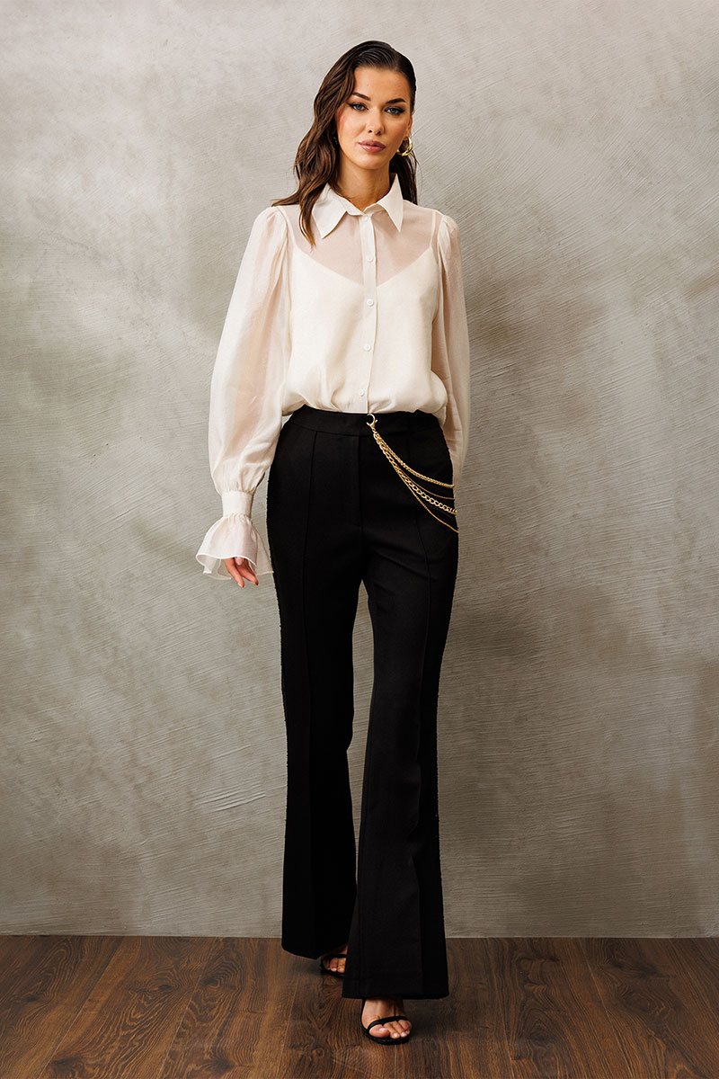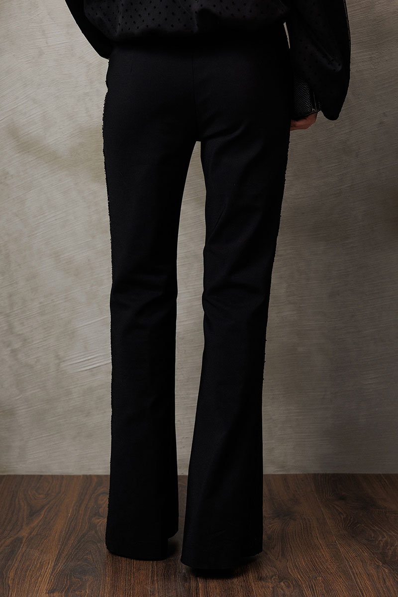 Брюки-клеш из костюмной ткани с лампасом из пайеток. Брюки на притачном поясе с уступом и застежкой-гульфик. Пояс застегивается на крючок и потайную петлю-пуговицу. По переду защип по всей длине брюк и карманами в шве притачивания к лампасу. По спинке вытачка от пояса.
