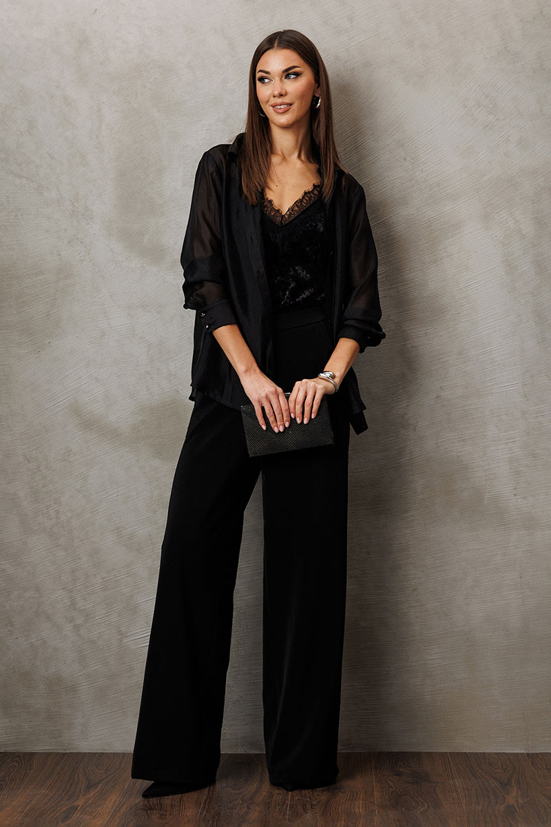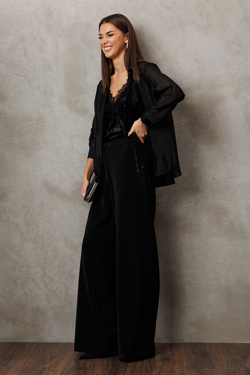 Брюки-палаццо из костюмной ткани с лампасом из пайеток. Брюки на притачном поясе и застежкой-гульфик. Пояс застегивается на петлю-пуговицу. По переду карман в шве притачивания к лампасу. По спинке пояс на резинке и вытачка от пояса.