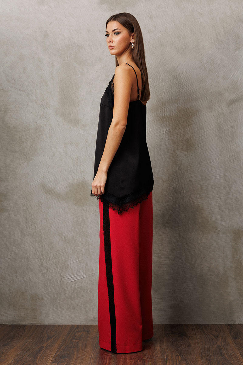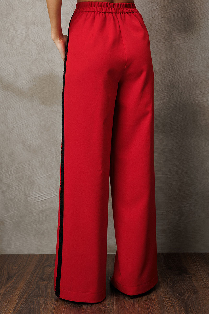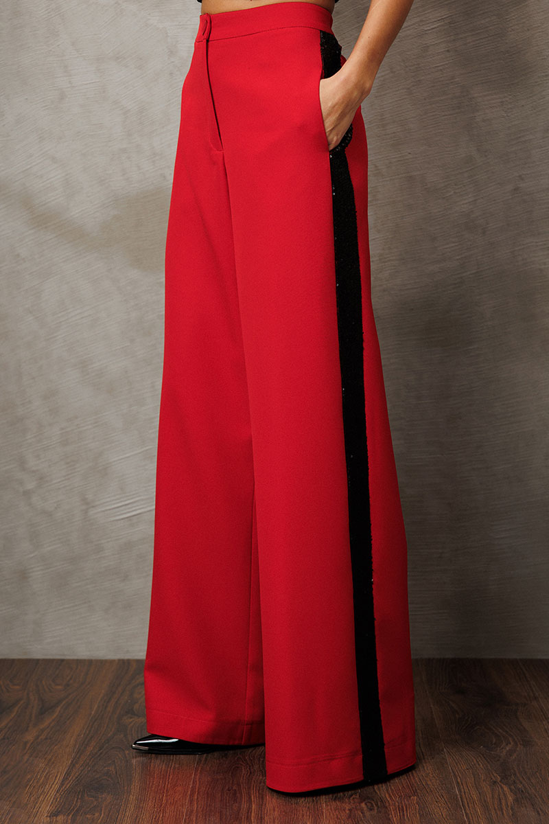 Брюки-палаццо из костюмной ткани с лампасом из пайеток. Брюки на притачном поясе и застежкой-гульфик. Пояс застегивается на петлю-пуговицу. По переду карман в шве притачивания к лампасу. По спинке пояс на резинке и вытачка от пояса.