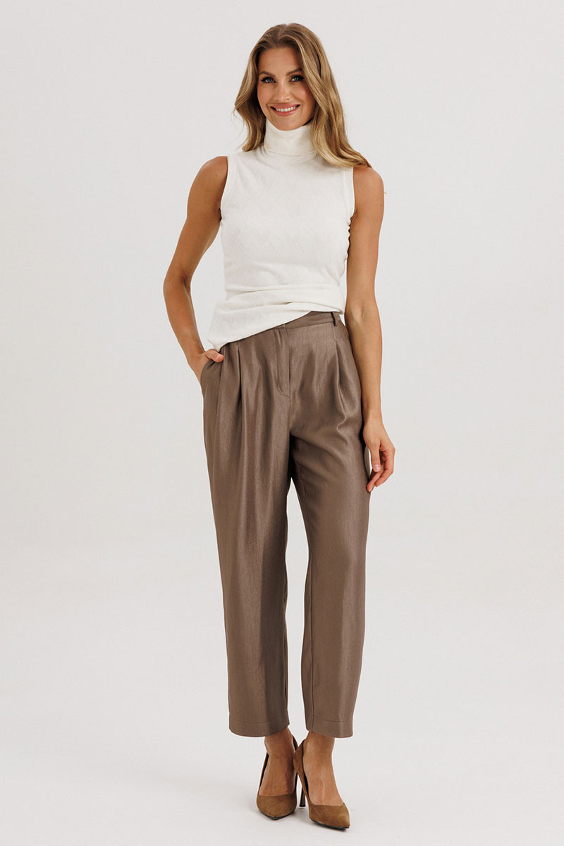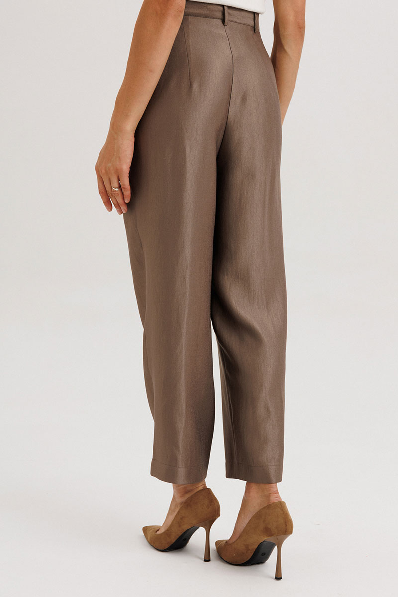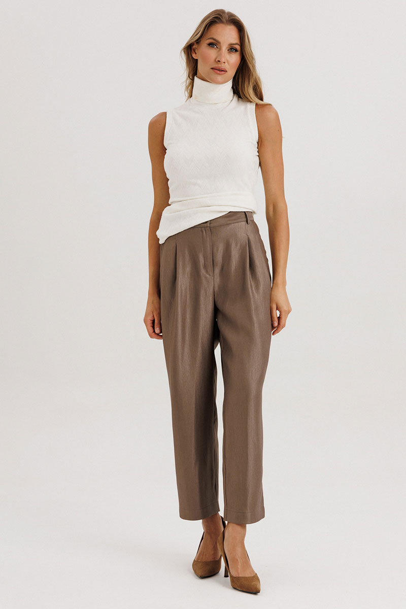 Брюки женские слегка зауженные книзу, с притачным поясом со шлевками, с застежкой на тесьму-молнию с гульфиком и откоском. Пояс застегивается на одну прорезную петлю и пуговицу. Передняя половинка брюк с 2-мя складками, застроченными сверху, с боковыми карманами. На задней половинке брюк – 2 талиевых вытачки.
