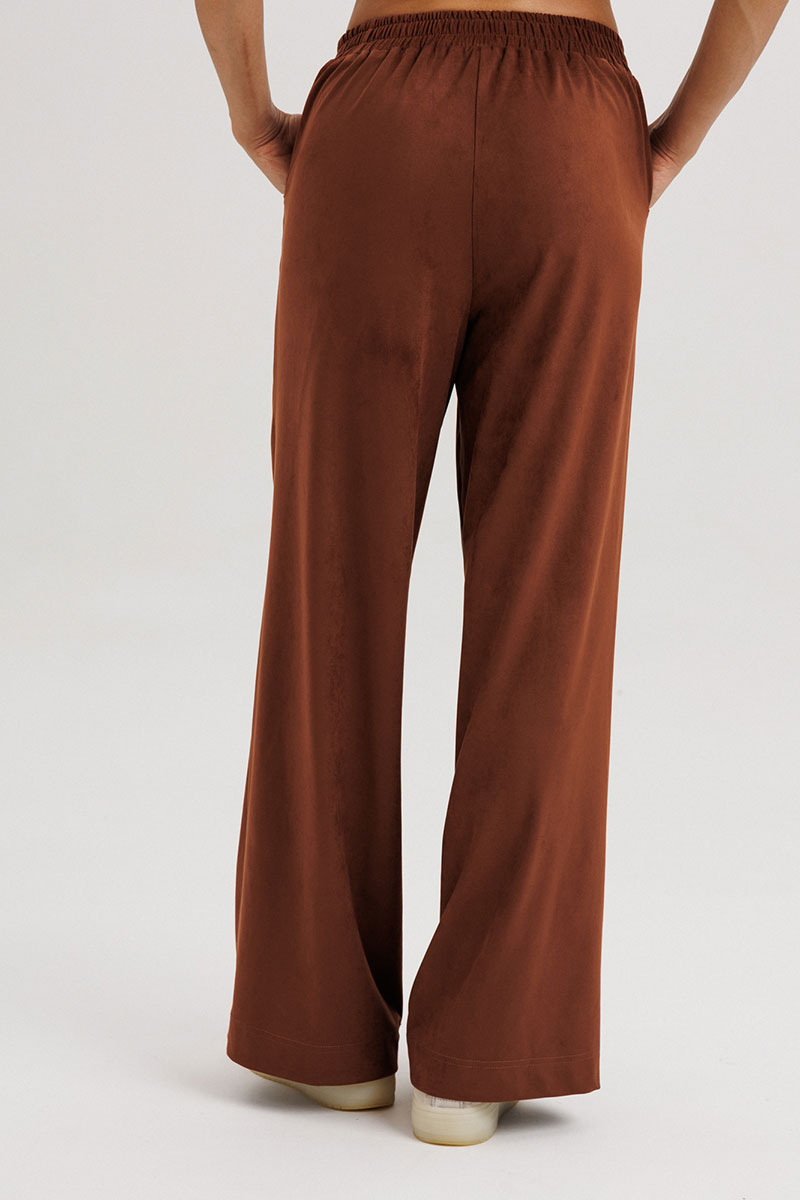Брюки-палаццо с притачным поясом с резинкой. По поясу проложены 2 параллельных строчки. Брюки выполнены из искусственной замши. На передних половинках брюк обработаны боковые карманы. Задние половинки брюк без конструктивных особенностей.