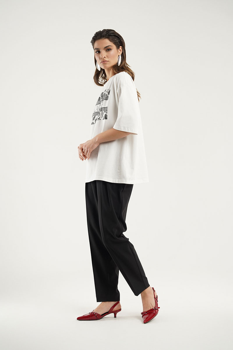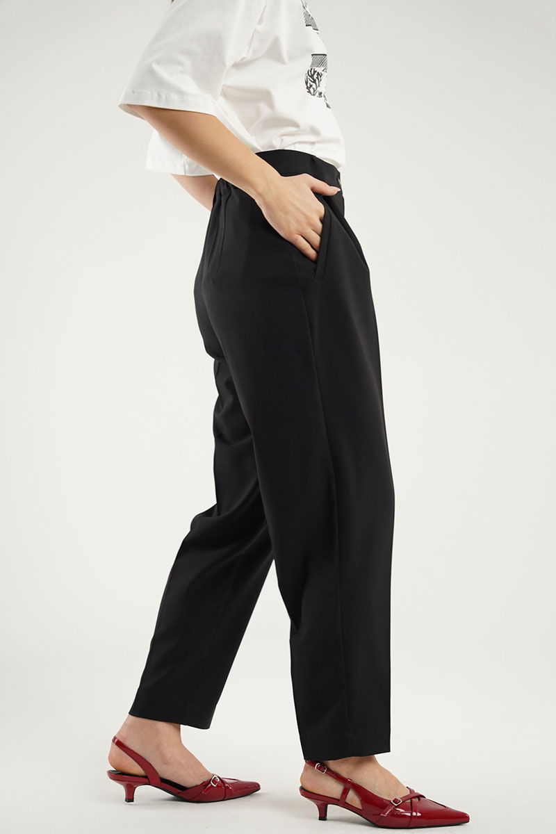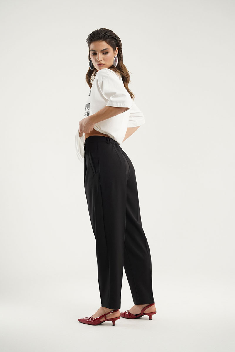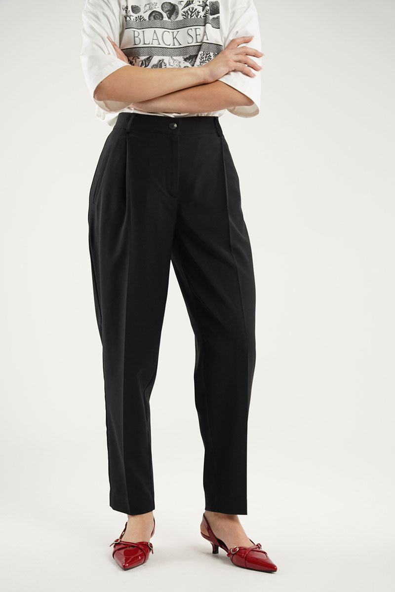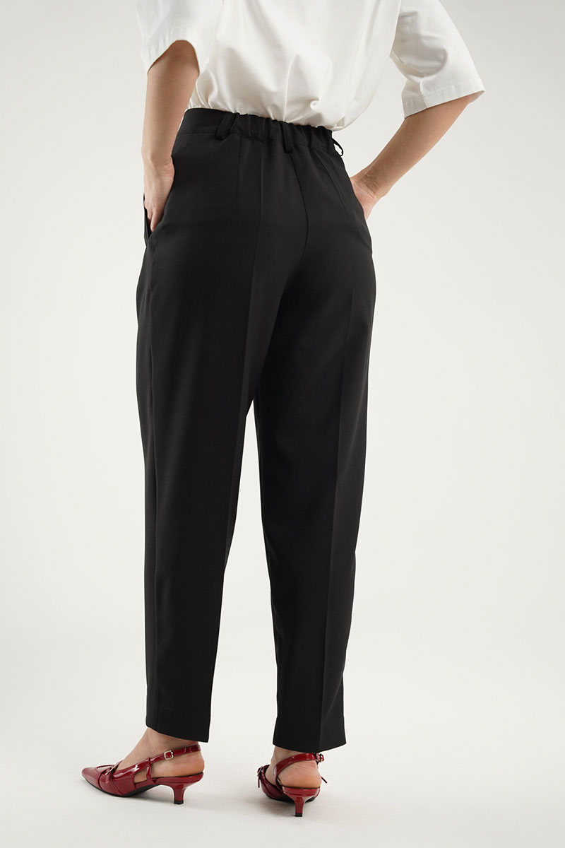 Брюки классические с стрелками, складками по переду, слегка зауженные к низу. По переду прорезные карманы с листочкой. Застежка на молнию и петлю с пуговицей. Пояс отрезной с вставкой эластичной тесьмы по спинке.