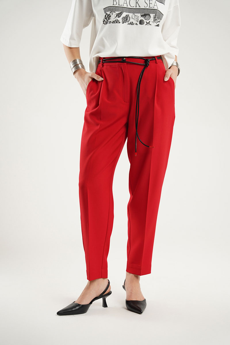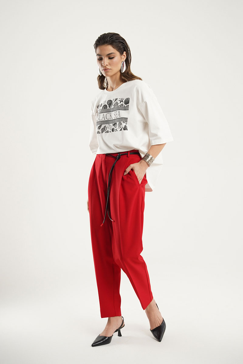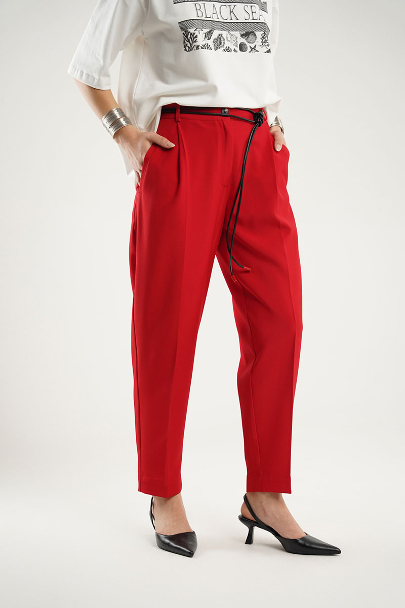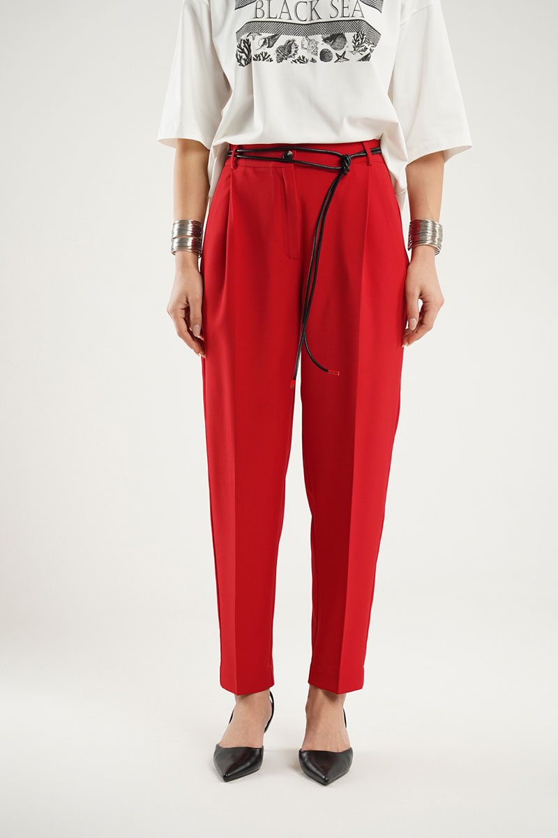 Брюки классические с стрелками, складками по переду, слегка зауженные к низу. По переду прорезные карманы с листочкой. Застежка на молнию и петлю с пуговицей. Пояс отрезной с вставкой эластичной тесьмы по спинке.