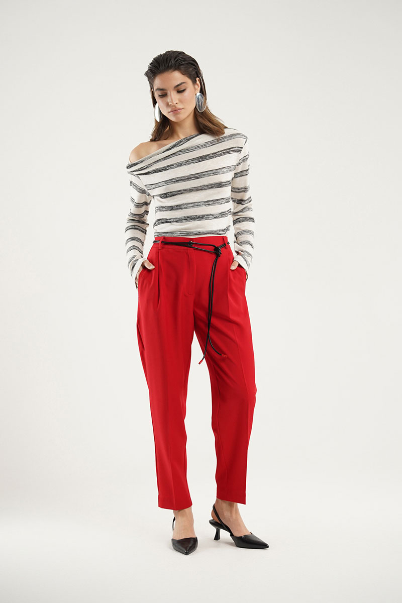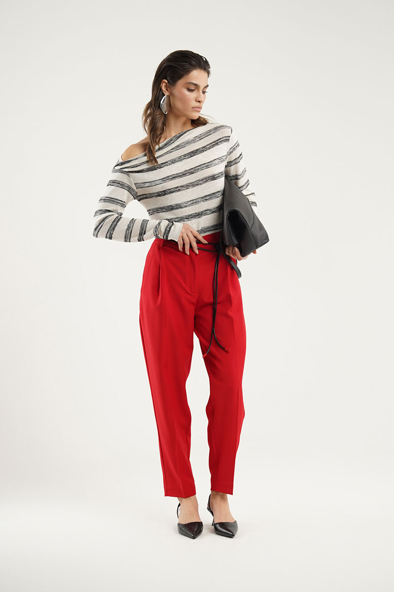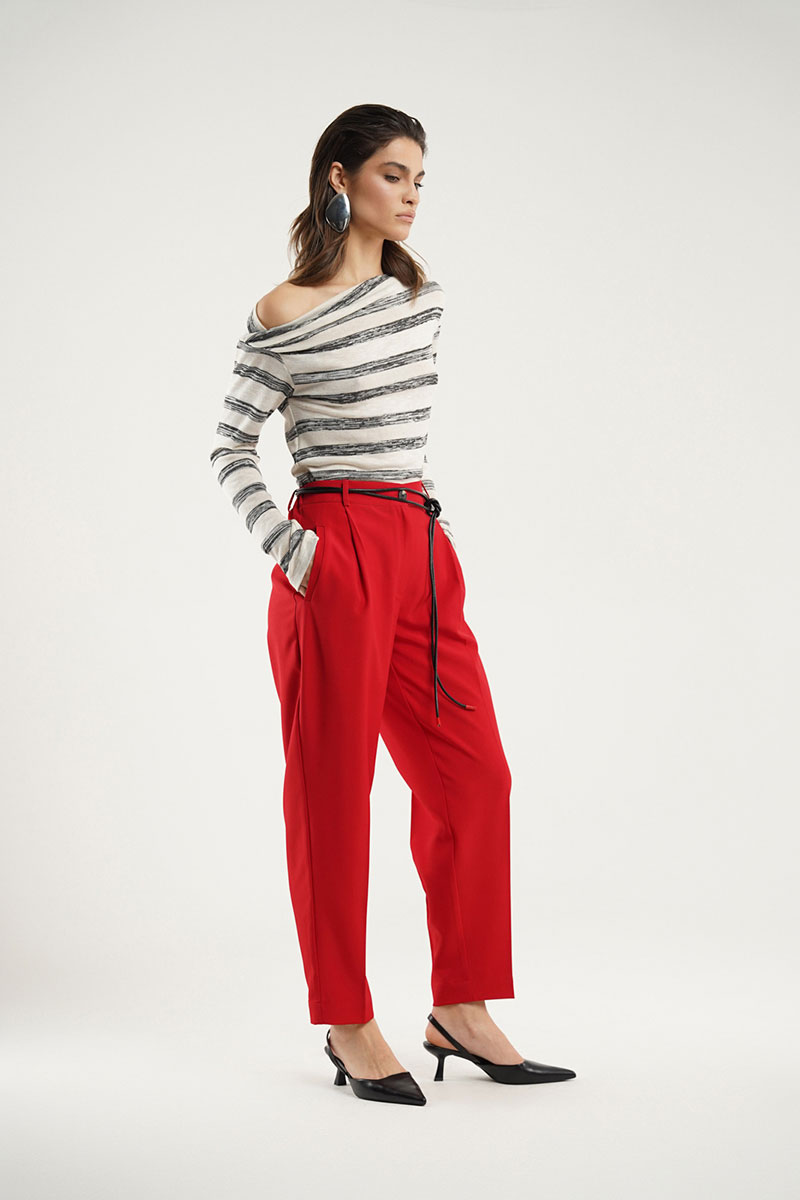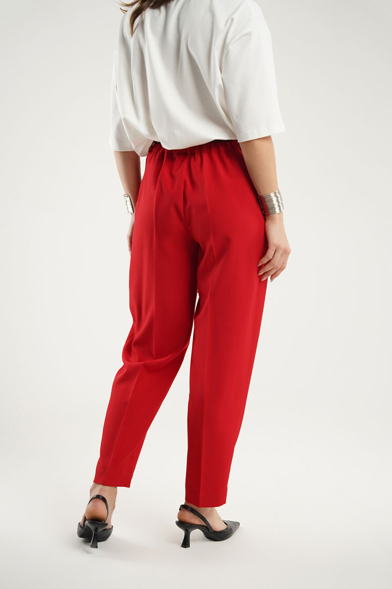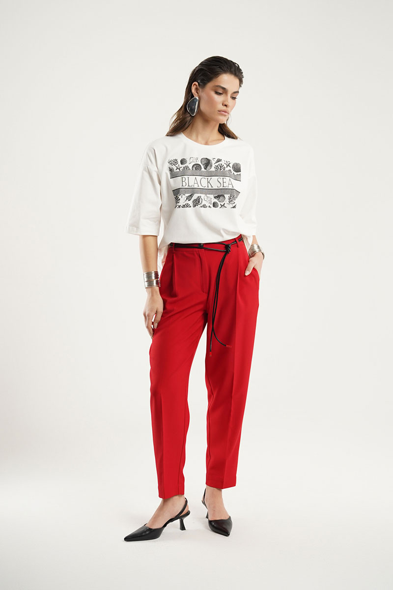 Брюки классические с стрелками, складками по переду, слегка зауженные к низу. По переду прорезные карманы с листочкой. Застежка на молнию и петлю с пуговицей. Пояс отрезной с вставкой эластичной тесьмы по спинке.