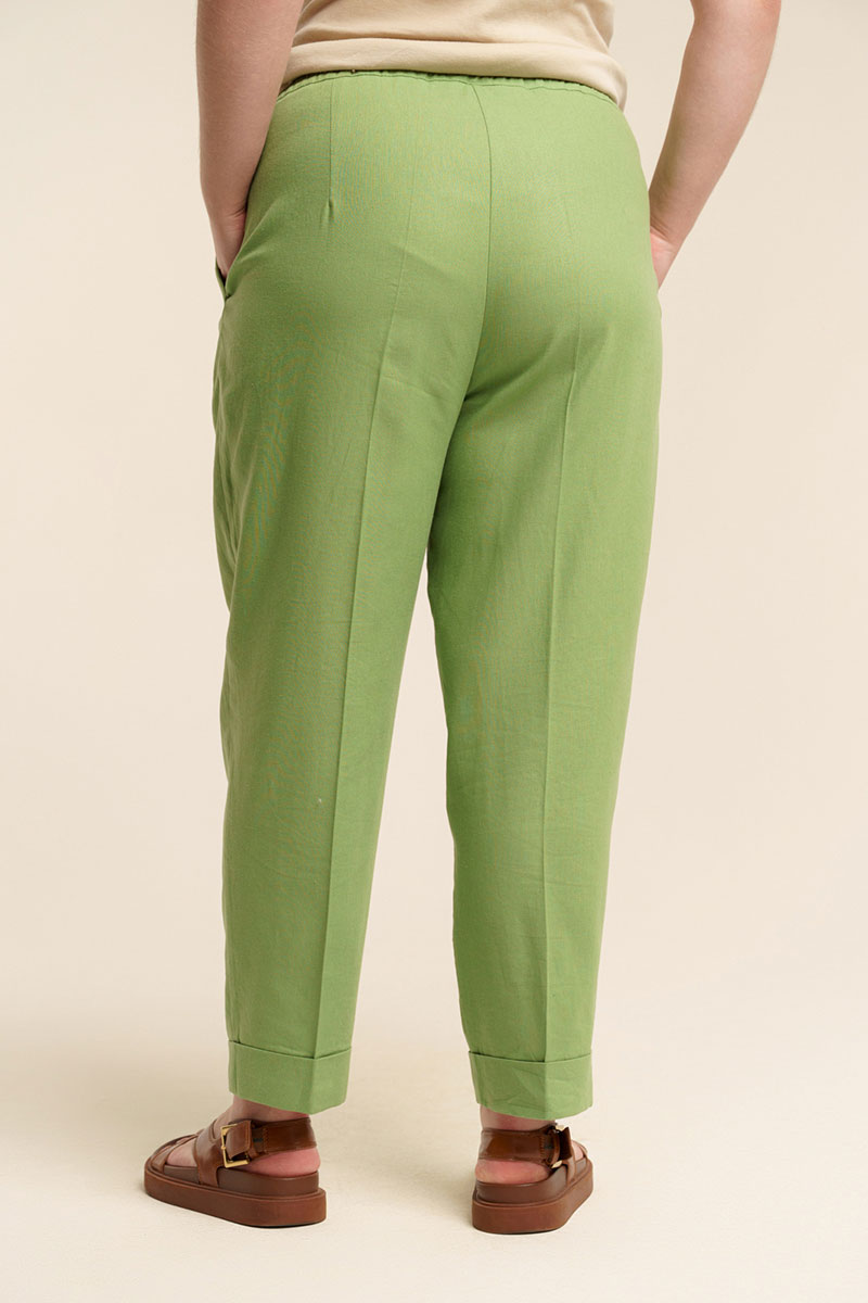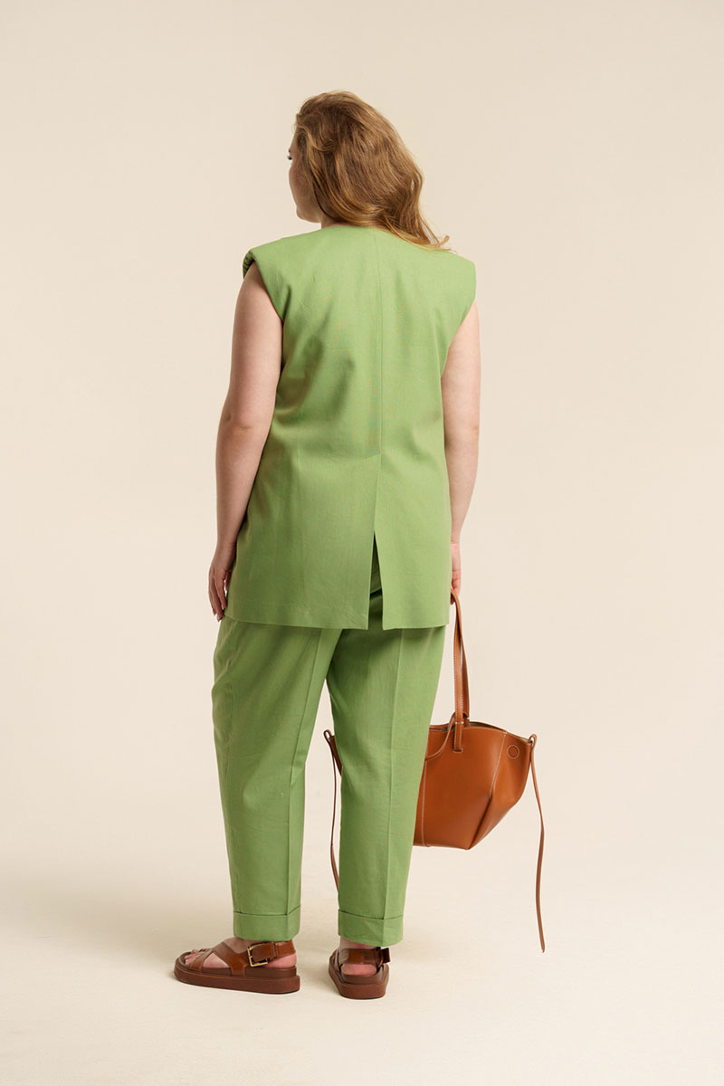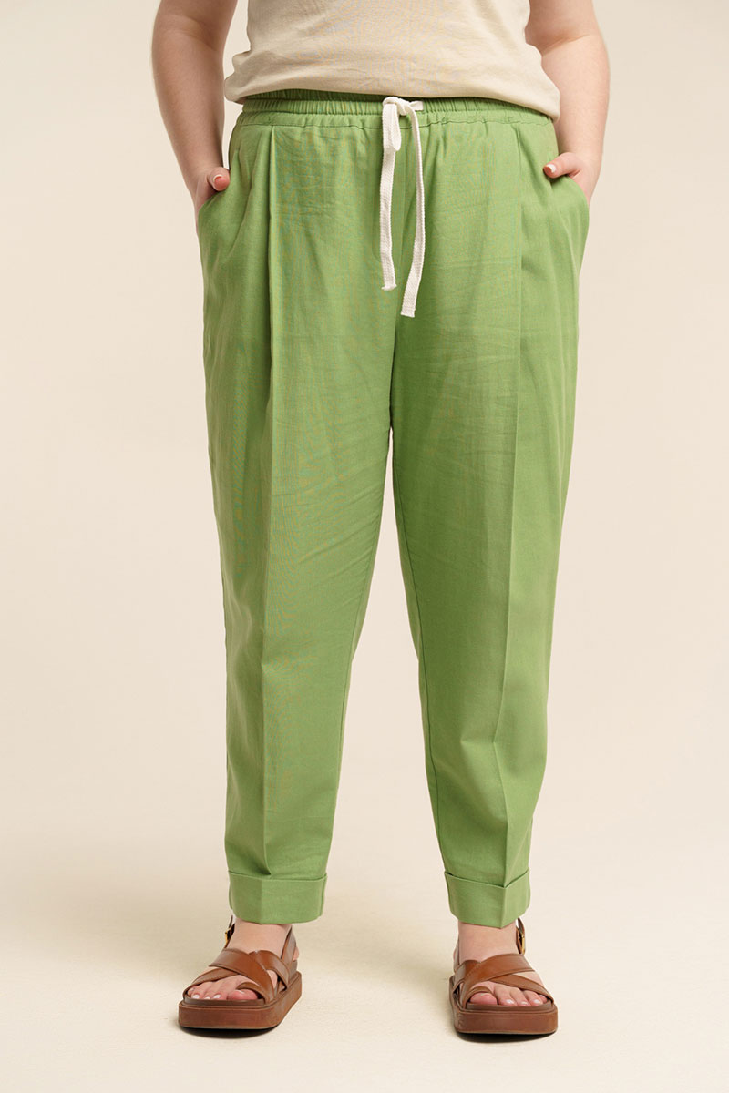 Брюки женские с средней посадкой слегка зауженные к низу. В боковых швах карманы с отрезным бочком. Пояс отрезной с эластичной тесьмой и регулируемыми шнурками. По низу манжет.