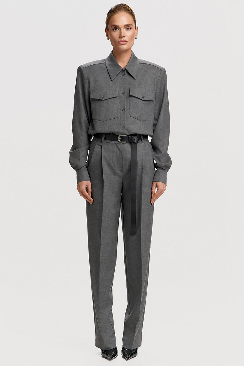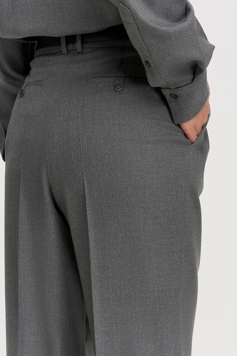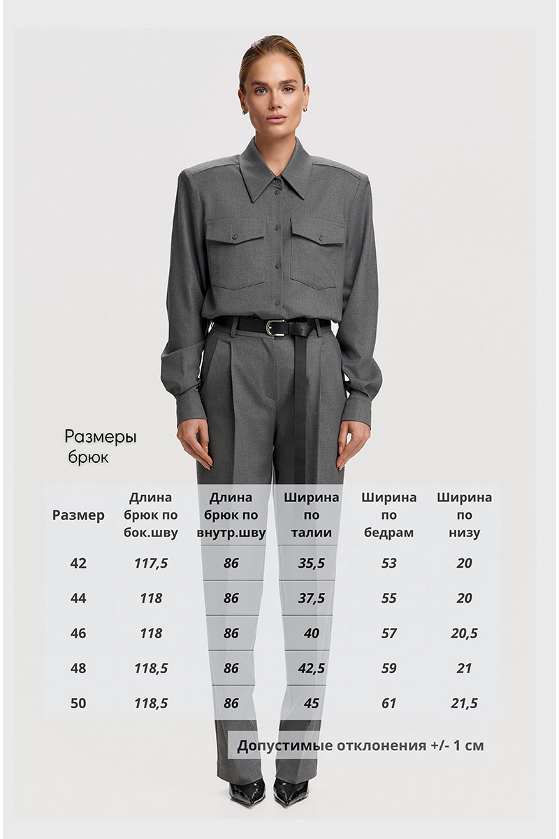 Классические прямые брюки, слегка зауженные книзу, из плотного полотна с добавлением вискозы. Брюки на поясе со шлевками. Посадка на талии, спереди заложены складки для дополнительного объема. По переду брюк наклонные карманы, на задних частях прорезные карманы с листочкой и навесной петлей. Универсальная модель и длина брюк позволяет создавать разнообразные образы — от строгого офисного до повседневного городского. Брюки идеальный компаньон для рубашки арт. 6060. Измерения готового изделия расположены в табличке с фотографиями. Параметры модели на фото (см): 90/65/95, размер: 44/S, рост: 175 см.