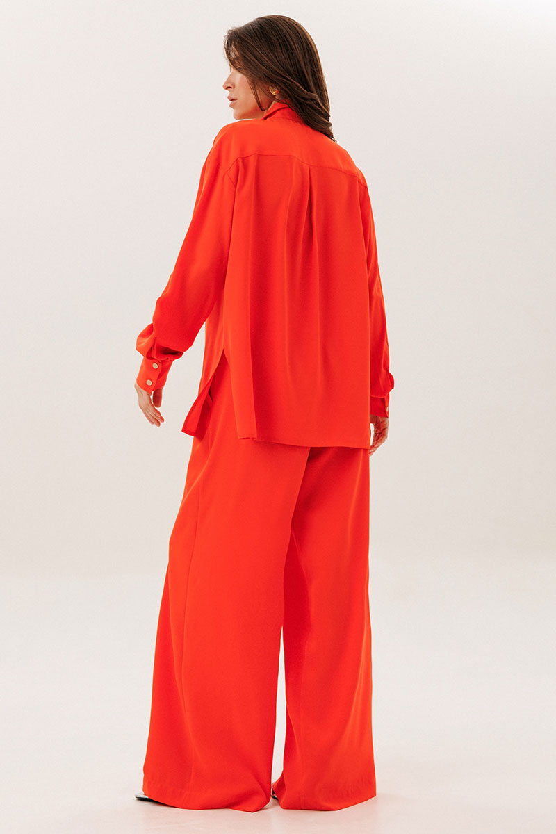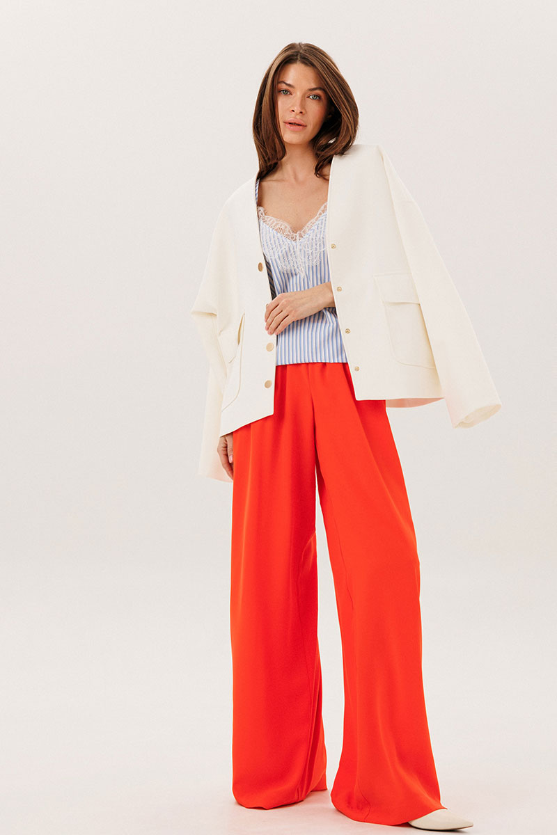 Брюки широкие с притачным поясом на резинке и карманами по боковым швам.