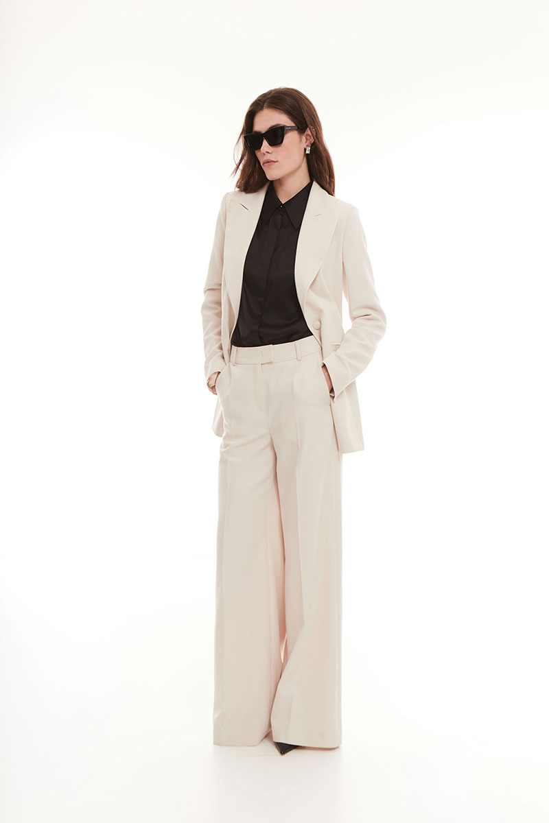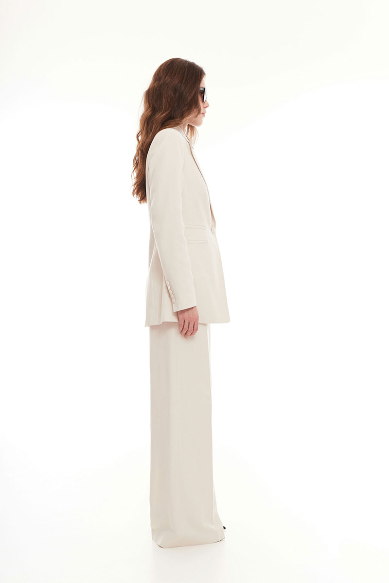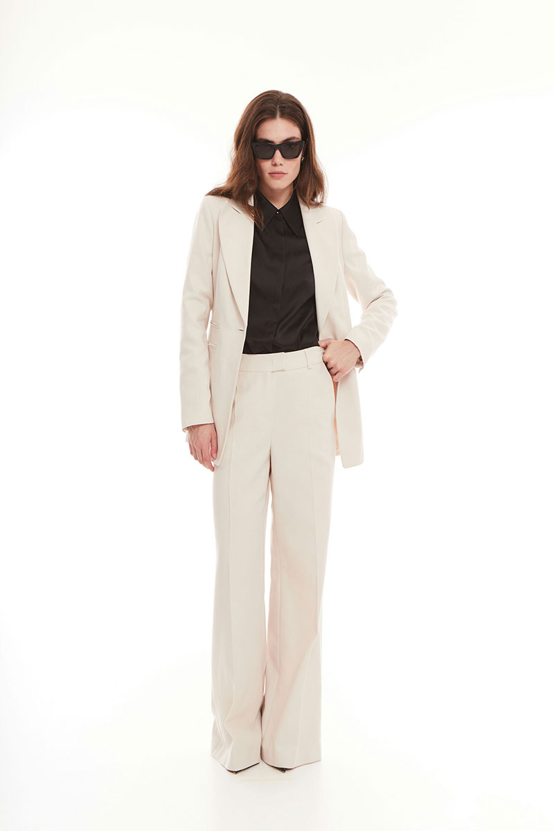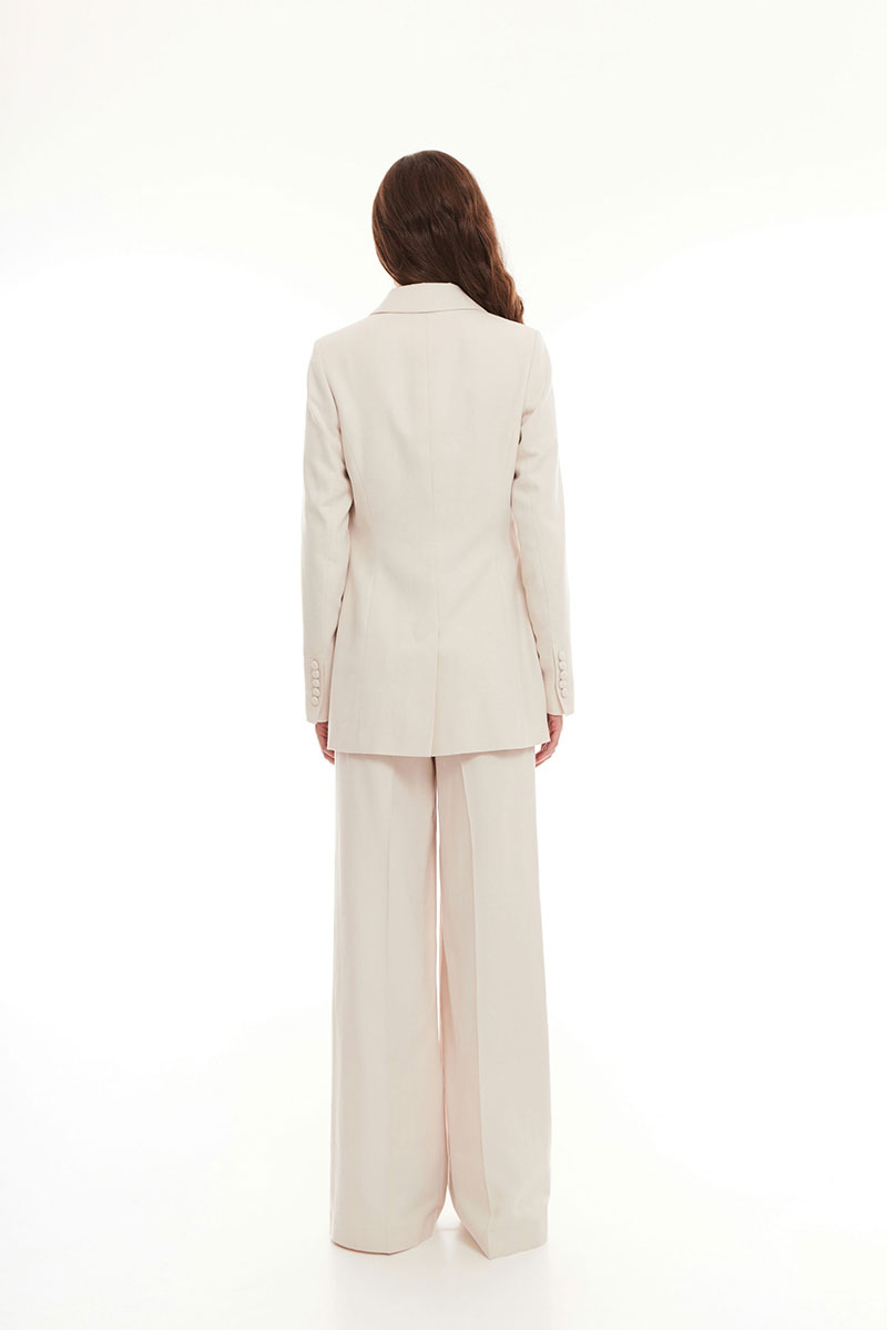 Брюки женские, прямого силуэта. По передним половинкам боковые карманы. На задних половинках фиктивные карманы с клапаном и 2 обтачками. Застежка на молнию, крючок и пуговицу.