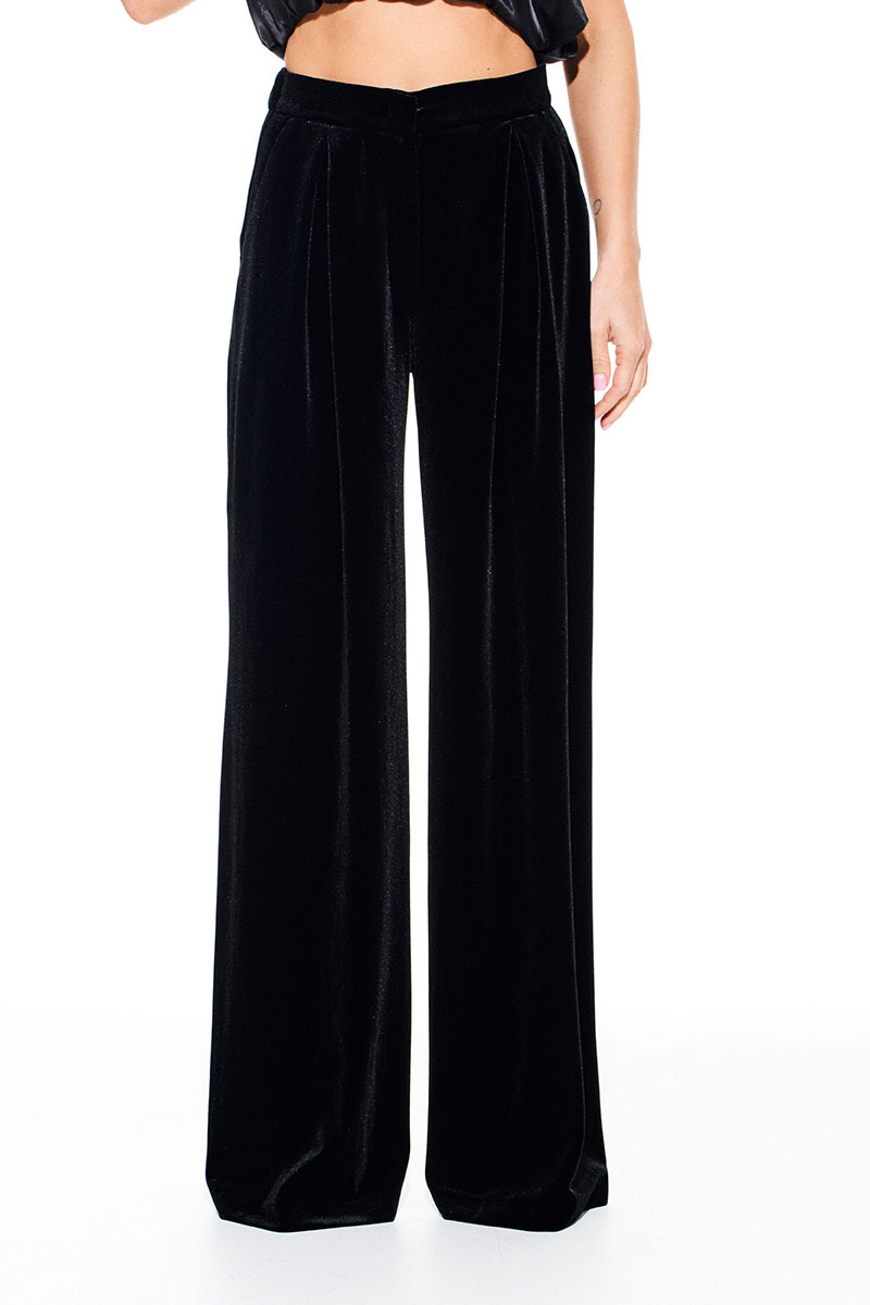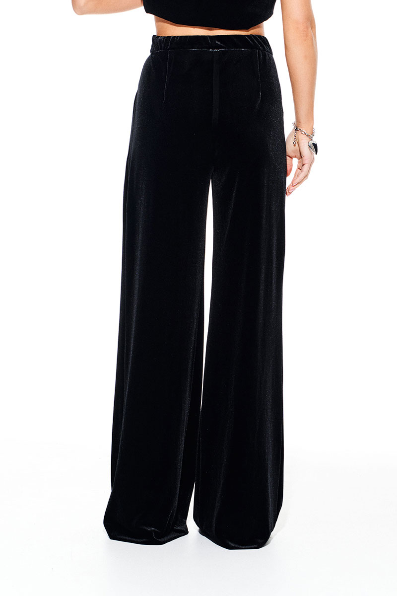 Брюки из бархата на трикотажной основе, свободного объема, расширенные к низу. На передних половинках выполнены боковые карманы с отрезным бочком и встречные складки. На задних половинках талиевые вытачки. Застежка – гульфик на молнии. Пояс притачной, с резинкой по спинке, застежкой на крючок и потайную пуговицу.