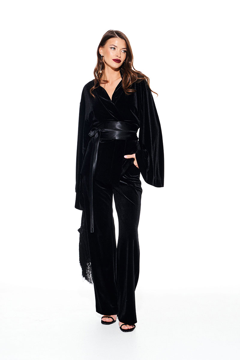 Брюки из бархата на трикотажной основе, умеренного объема, прямого силуэта. На передних половинках выполнены боковые карманы с отрезным бочком. Задние половинки с талиевыми вытачками. Застежка – гульфик на молнии. Пояс притачной, с резинкой по спинке, шлевками, застежкой на крючок и потайную пуговицу.