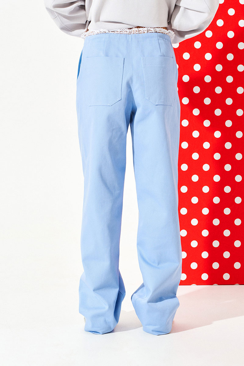 Брюки свободного объема, прямые. Застежка-гульфик на молнии. На передних половинках карманы с отрезным бочком и вытачки на уровне колена. На задних половинках брюк талиевые вытачки и накладные карманы. Пояс обработан обтачкой с отделочной строчкой, образующей кулиску, в которую продет декоративный шнур-завязка с наконечниками. Верхний срез пояса с вставкой из кружева. Пояс с застежкой на 1 петлю и 1 пуговицу.