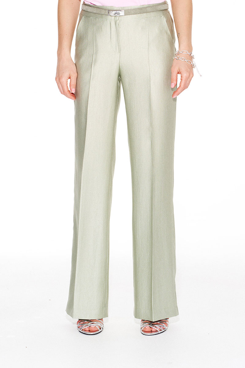 Брюки умеренного объема, прямого силуэта. На передних и задних половинках заутюжены стрелки. На передних половинках выполнены боковые карманы с отрезным бочком. Задние половинки с талиевыми вытачками. Застежка - гульфик на молнии. Пояс притачной, с резинкой по спинке, застежкой на 1 петлю и 1 пуговицу.