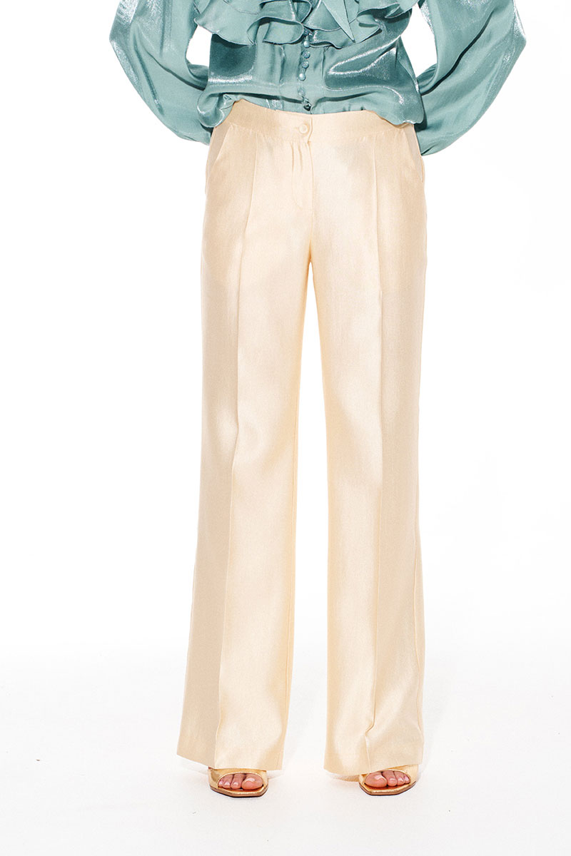 Брюки умеренного объема, прямого силуэта. На передних и задних половинках заутюжены стрелки. На передних половинках выполнены боковые карманы с отрезным бочком. Задние половинки с талиевыми вытачками. Застежка - гульфик на молнии. Пояс притачной, с резинкой по спинке, застежкой на 1 петлю и 1 пуговицу.