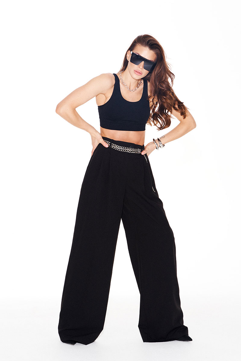 Брюки свободного объема, прямого силуэта. На передних половинках выполнены боковые карманы с отрезным бочком и односторонние складки. На задних половинках талиевые вытачки. Застежка – гульфик на молнии. Пояс притачной, с резинкой по спинке, застежка на петлю и пуговицу.