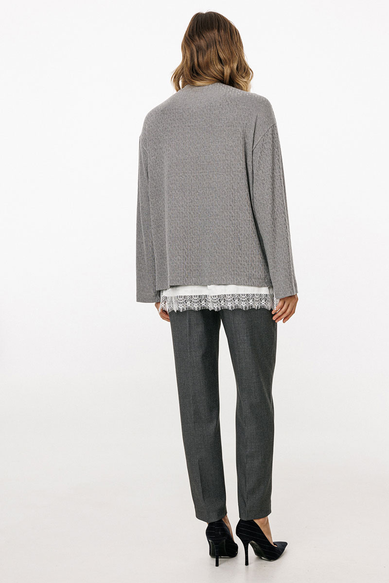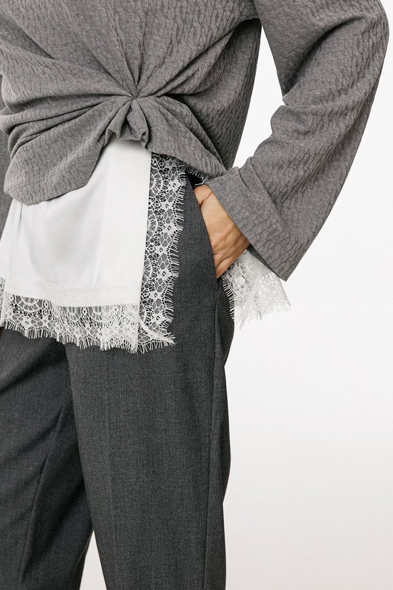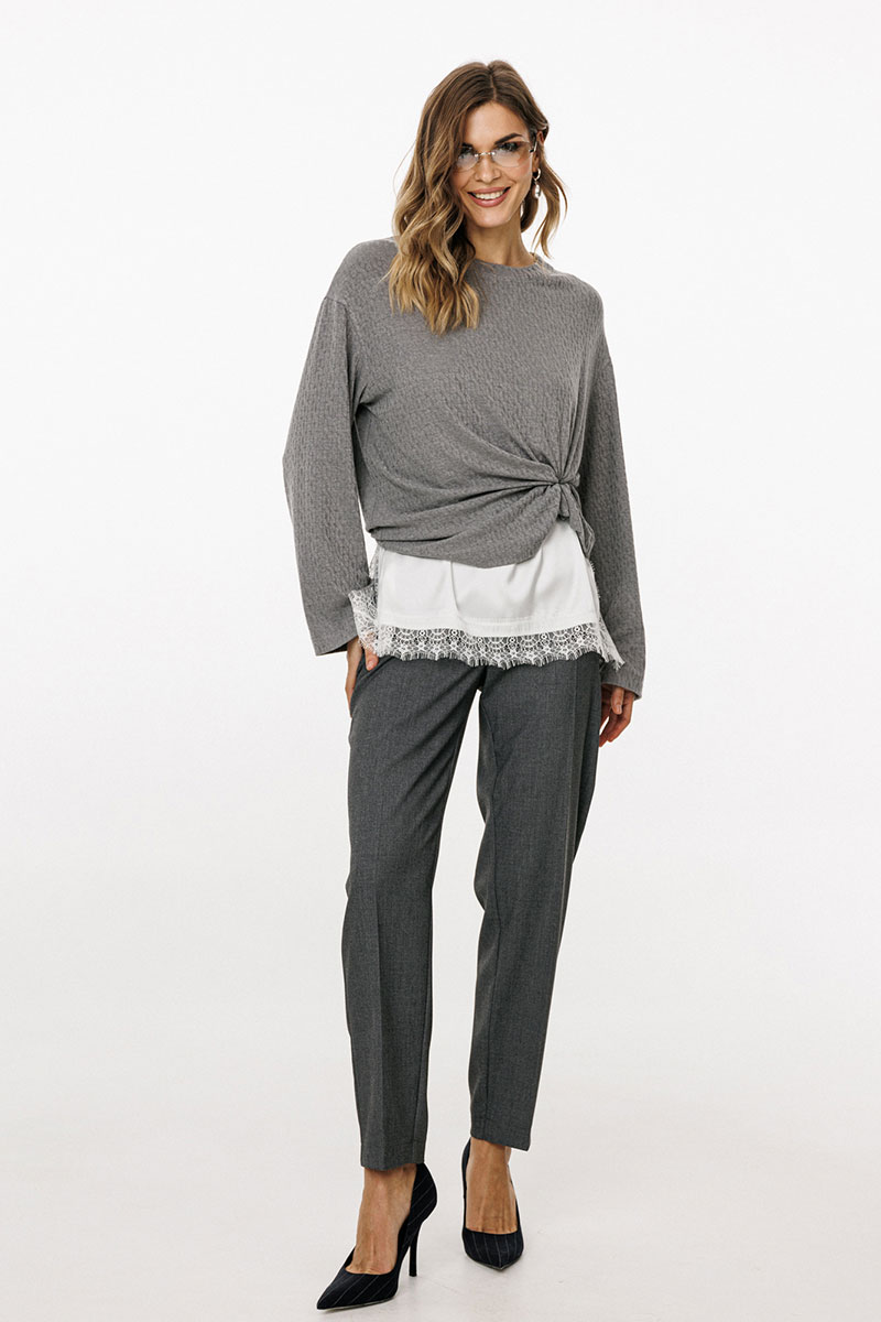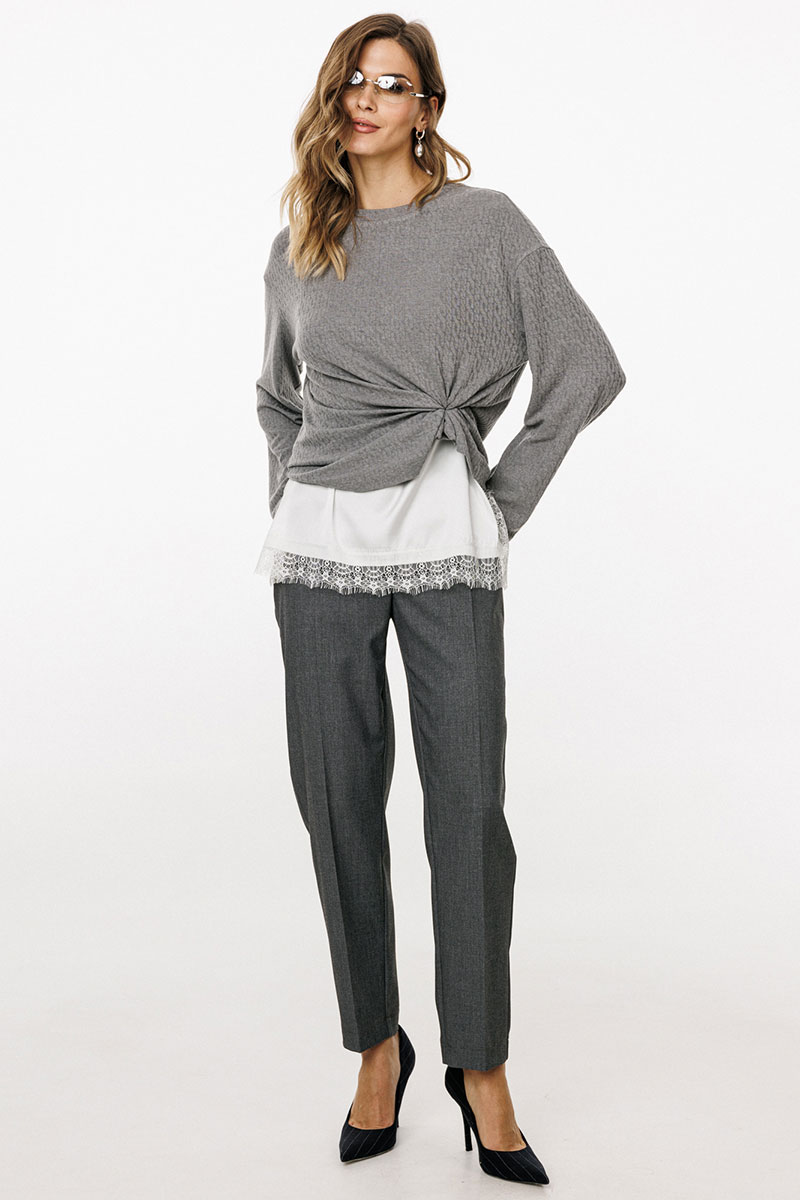 Брюки выполнены из костюмной ткани. Брюки зауженны к низу, длиной 7/8, на притачном поясе. Спереди боковые карманы с наклонным входом и застежка на пуговицу и молнию. Сзади талиевые вытачки и декоративные прорезные карманы. По задней части пояса эластичная тесьма.
