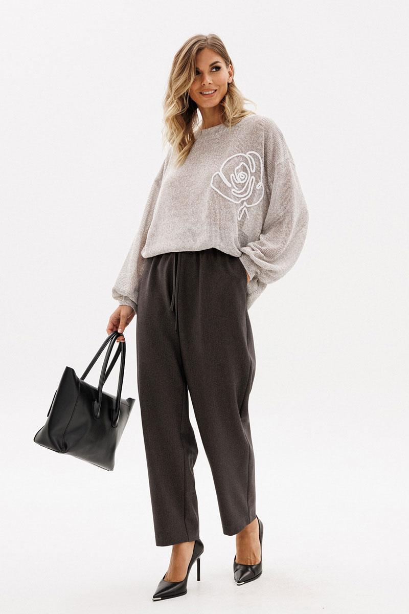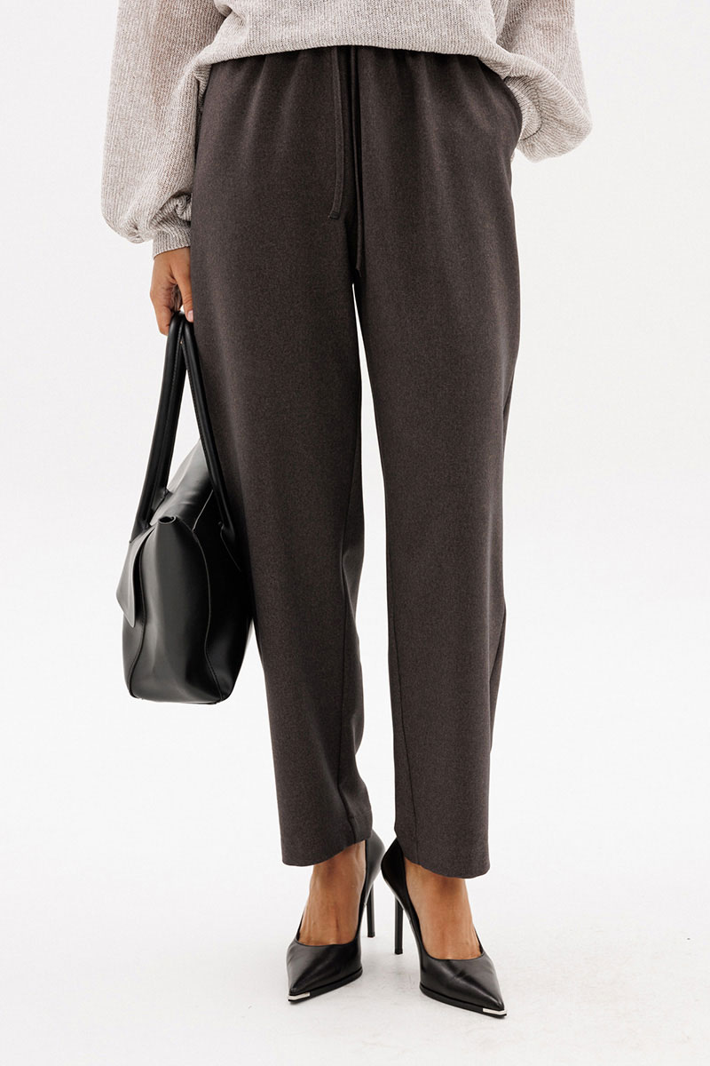 Брюки выполнены из костюмной ткани. Брюки зауженные к низу, длиной 7/8, на притачном поясе с эластичной тесьмой. Спереди боковые карманы с наклонным входом, петли в поясе, в которые втянут шнур из основной ткани.