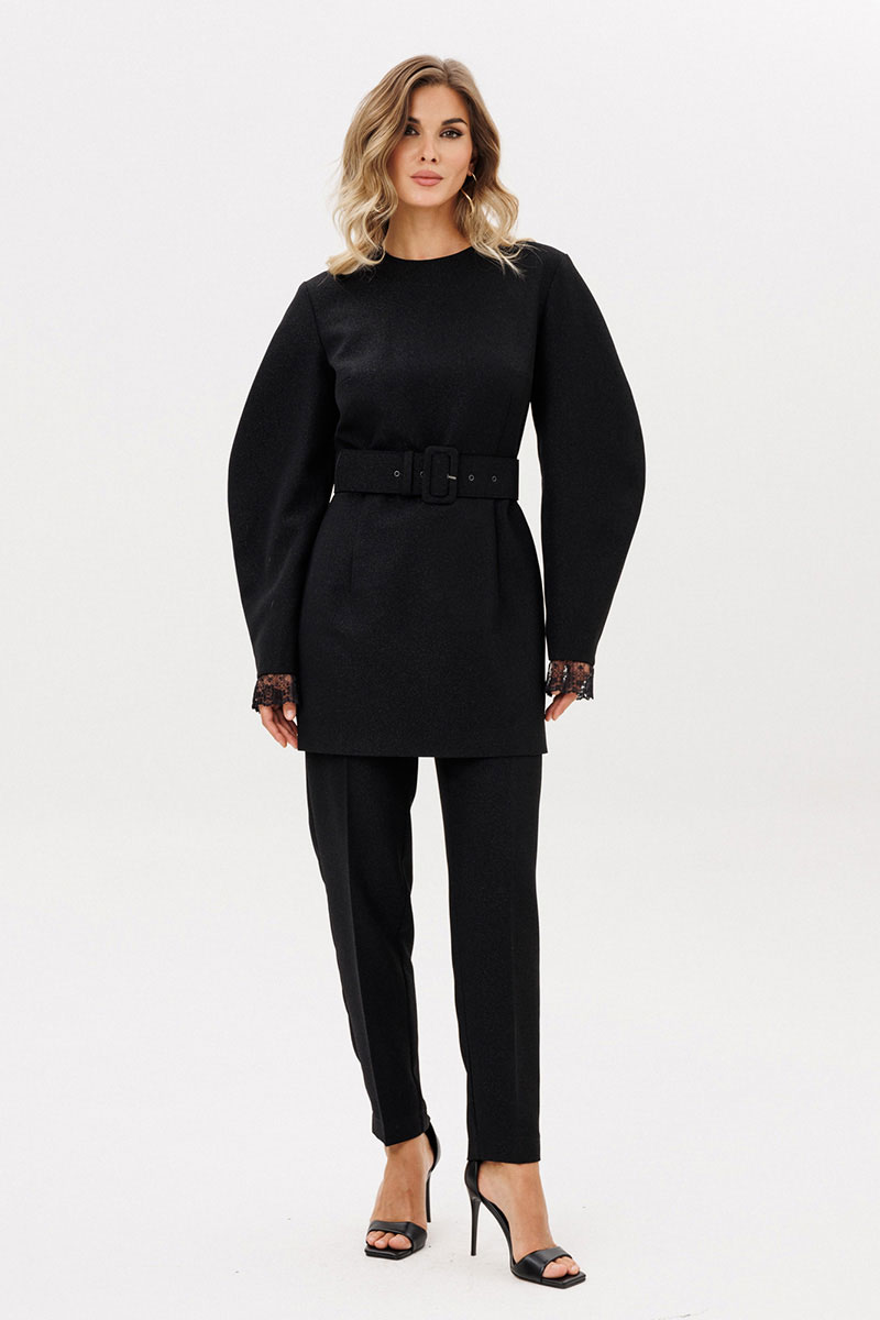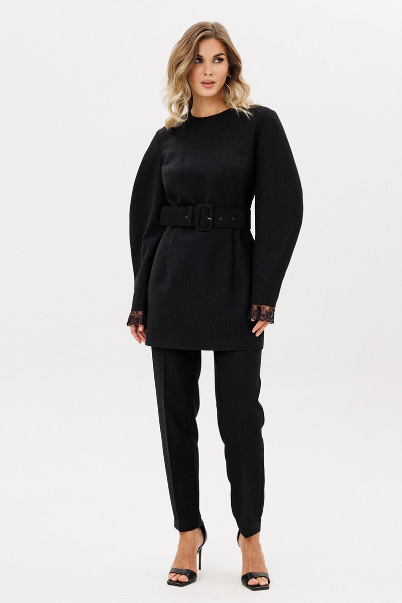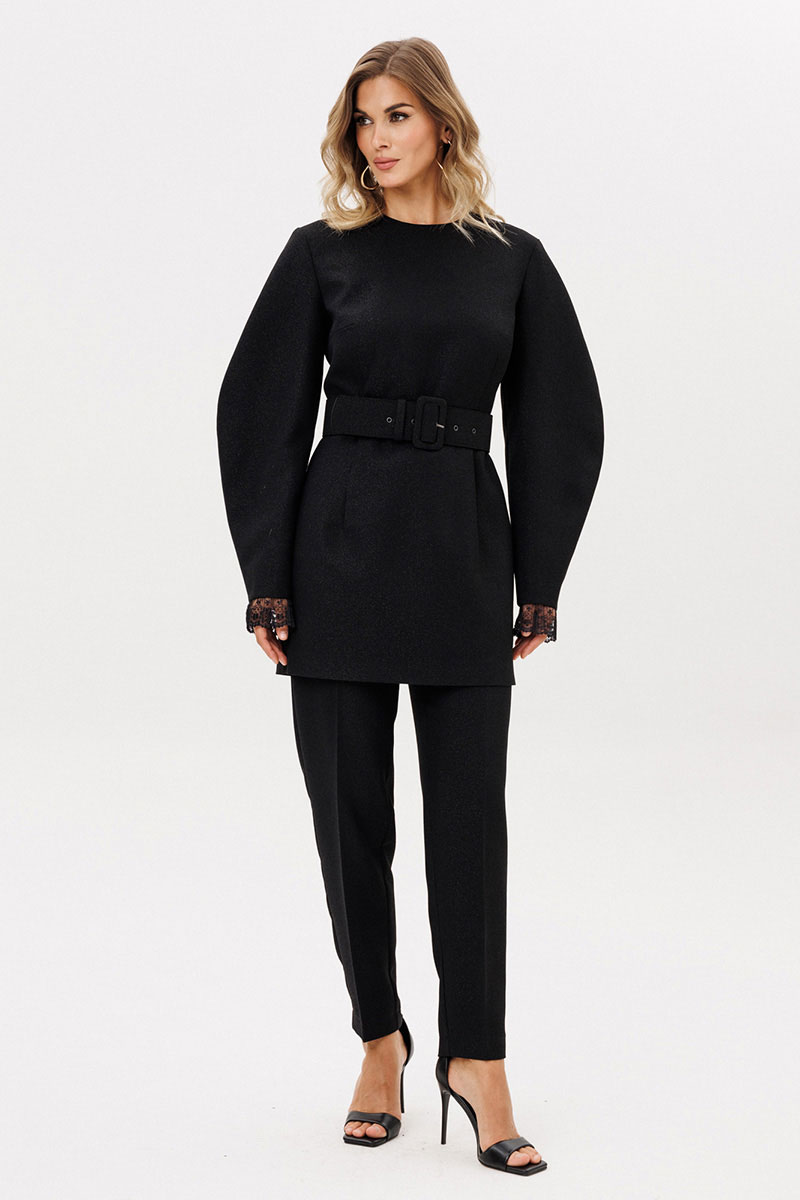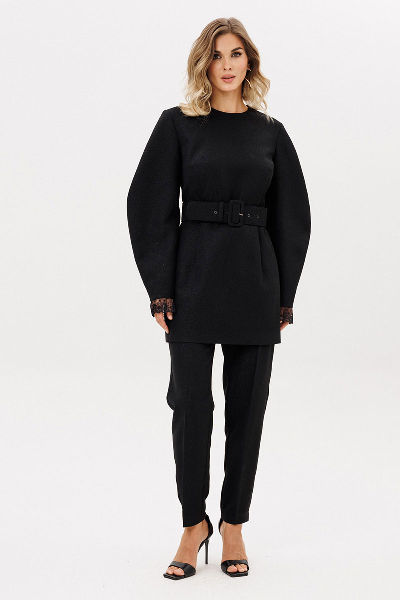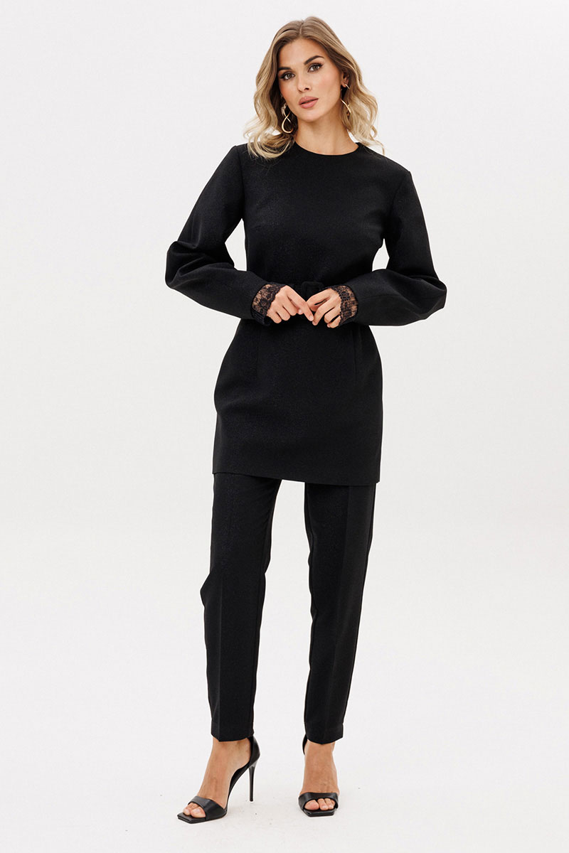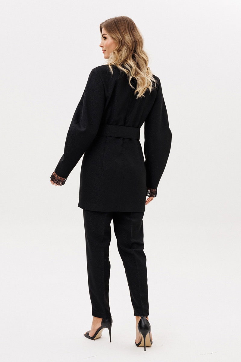 Брюки выполнены из костюмно-плательной ткани с блеском. Брюки заужены к низу, длиной 7/8, на притачном поясе. Спереди боковые карманы с наклонным входом и застежка на пуговицу и молнию. Сзади талиевые вытачки. По задней части пояса эластичная тесьма.