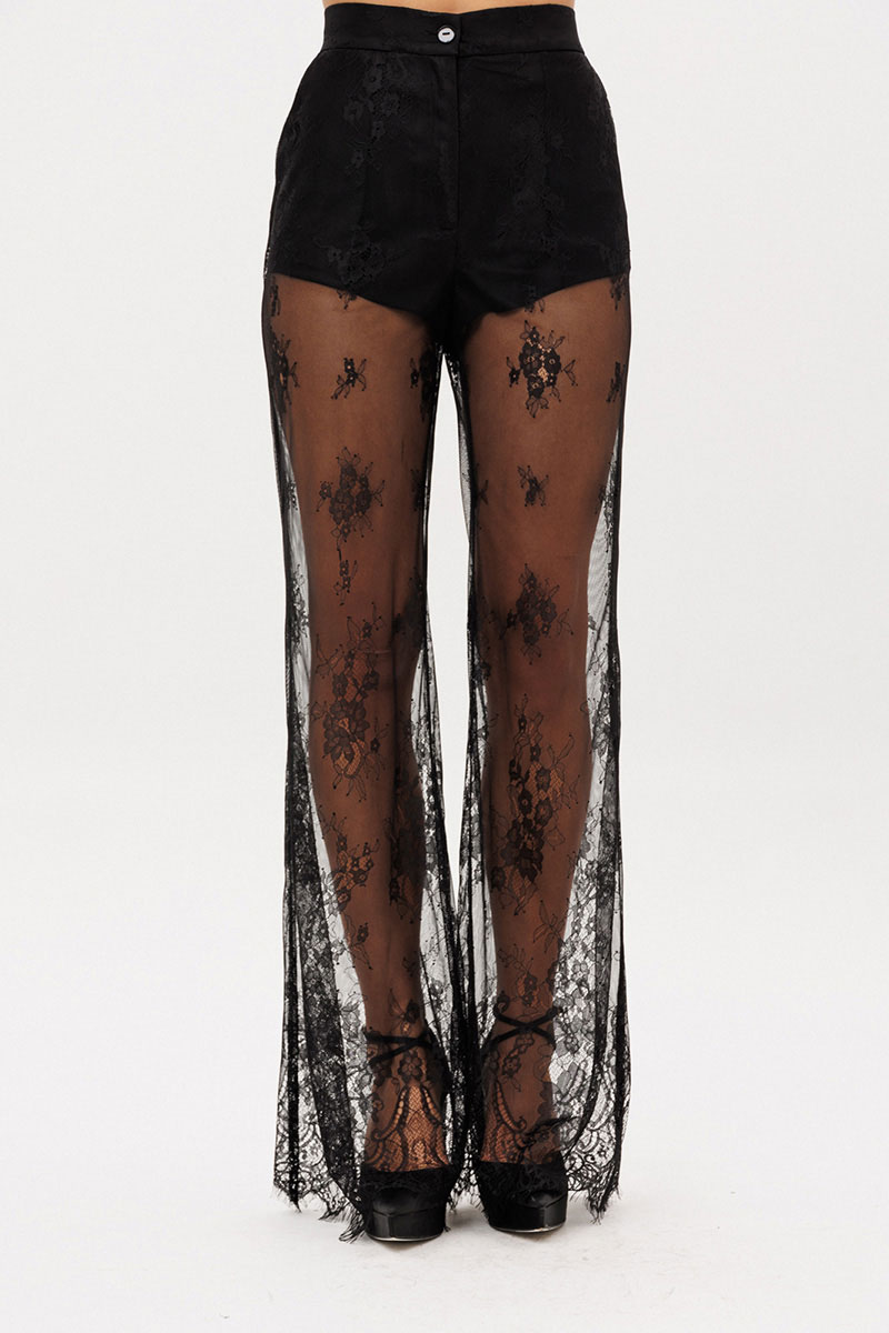 Брюки выполнены из гипюра. Брюки покроя " клеш", длиной в пол, на притачном поясе. Спереди застежка на пуговицу и молнию. По задней части пояса эластичная тесьма. По низу брюк фестоны. Брюки на отлетной по низу подкладке в виде мини-шорт из атласа.