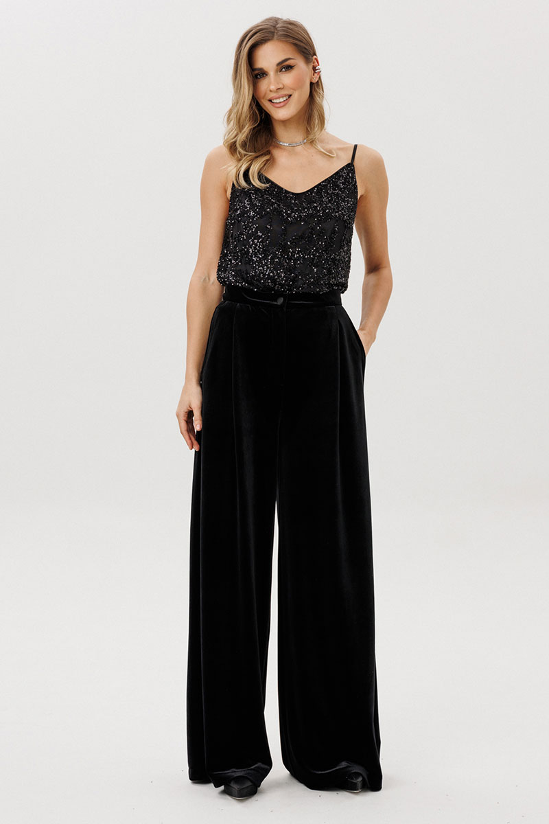 Брюки-палаццо выполнены из бархата. Брюки на притачном поясе, длиной в пол, расширенные к низу. Спереди складки и боковые карманы с наклонным входом. Застежка спереди на молнию с гульфиком и пуговицу. На задних частях обработаны талиевые вытачки.