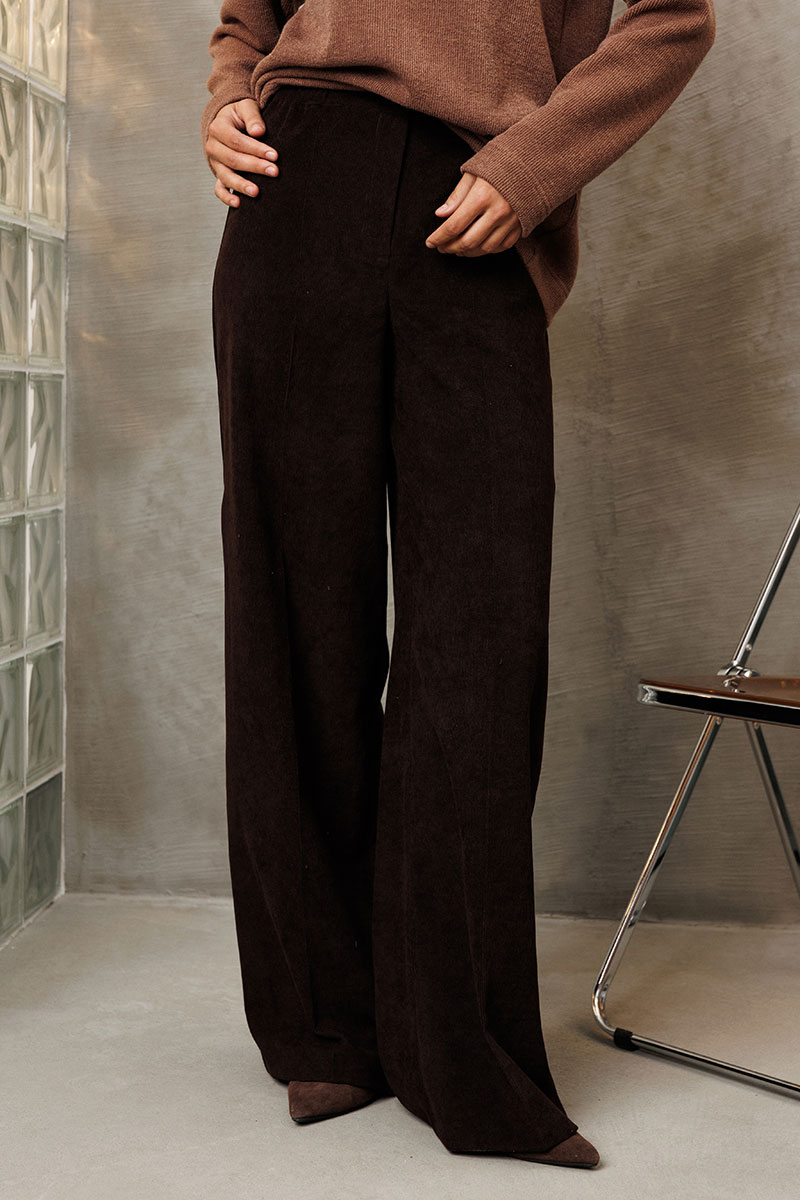 Брюки палаццо с притачным поясом из мягкой вельветовой ткани. Спереди застежка гульфик на молнии и петлей и пуговицей по поясу. По задней частям брюк вытачки. Пояс с резинкой в боковых частях. Брюки с заутюженными стрелками.
