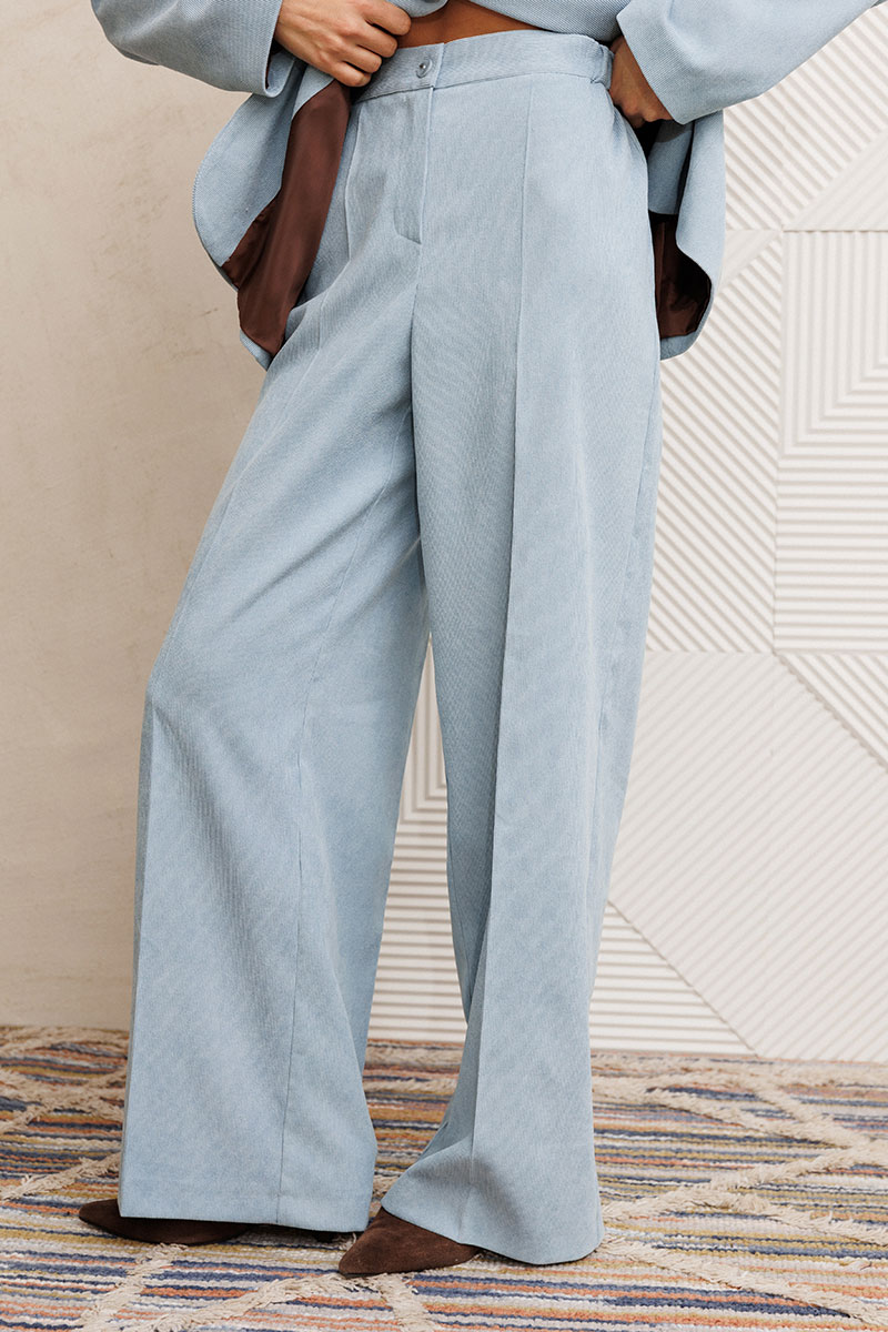 Брюки палаццо с притачным поясом из мягкой вельветовой ткани. Спереди застежка гульфик на молнии и петлей и пуговицей по поясу. По задней частям брюк вытачки. Пояс с резинкой в боковых частях. Брюки с заутюженными стрелками.