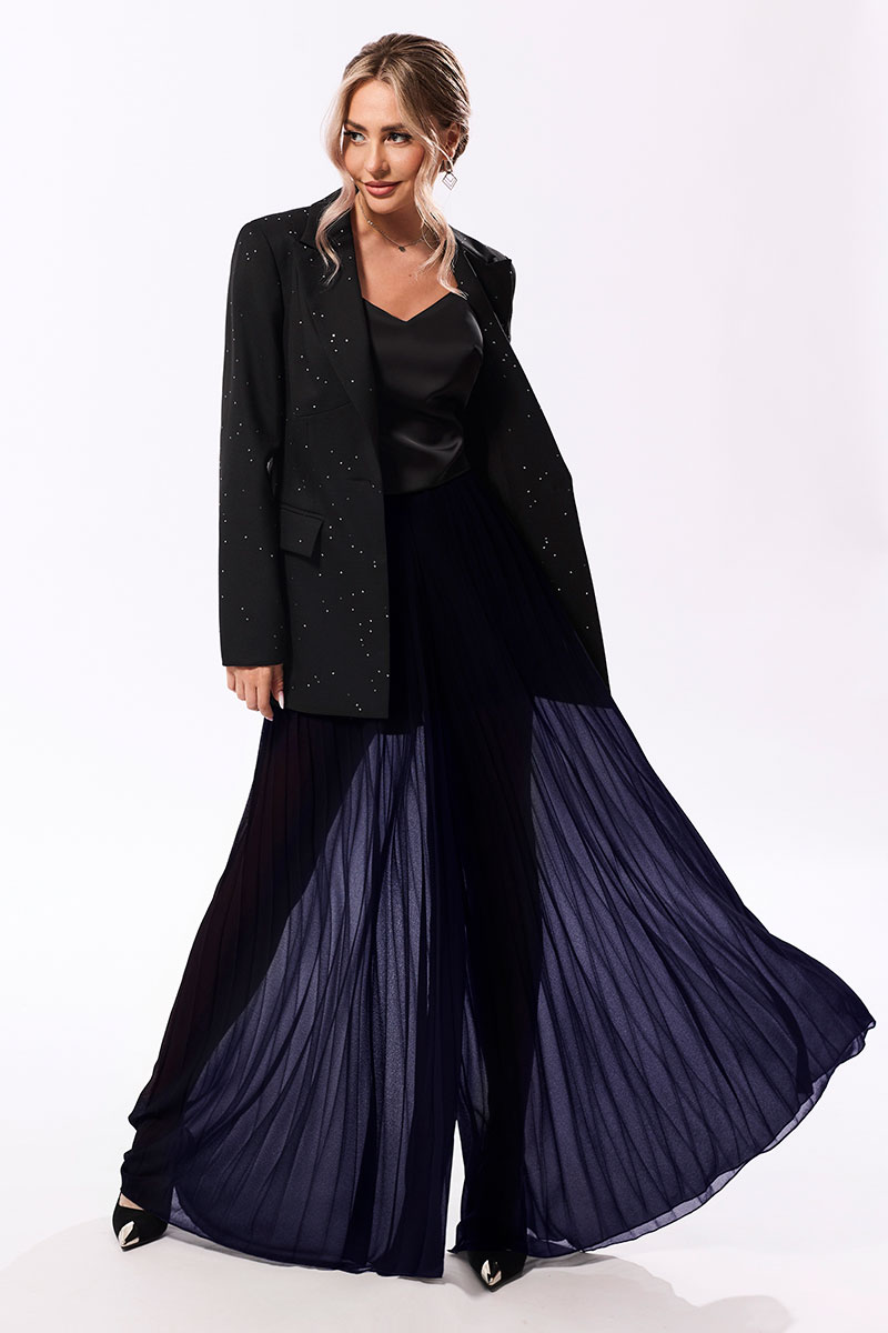 Брюки расширенного силуэта, с отрезным поясом, без застежки, верх брюк присборен на резинку. Брюки без боковых швов.