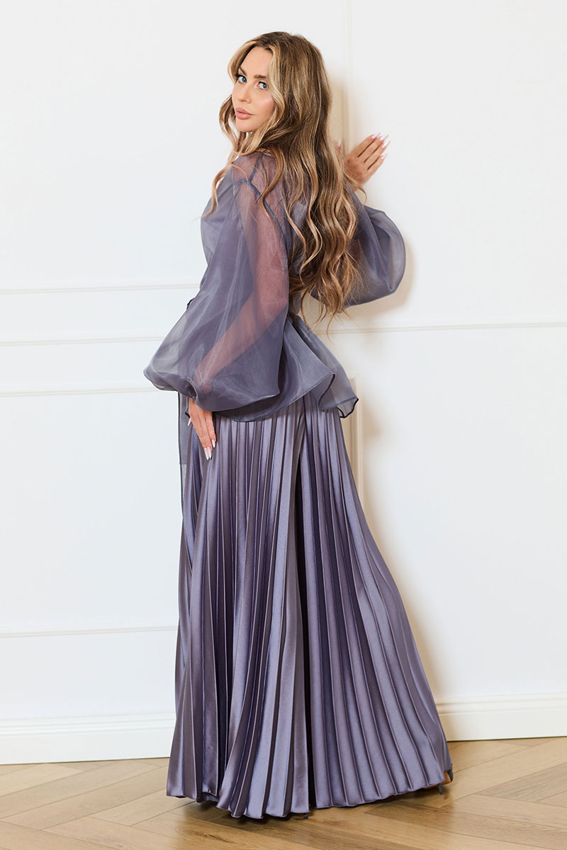 Брюки-гофре расширенного силуэта, с отрезным поясом, без застежки, верх брюк присборен на резинку. Брюки без боковых швов.