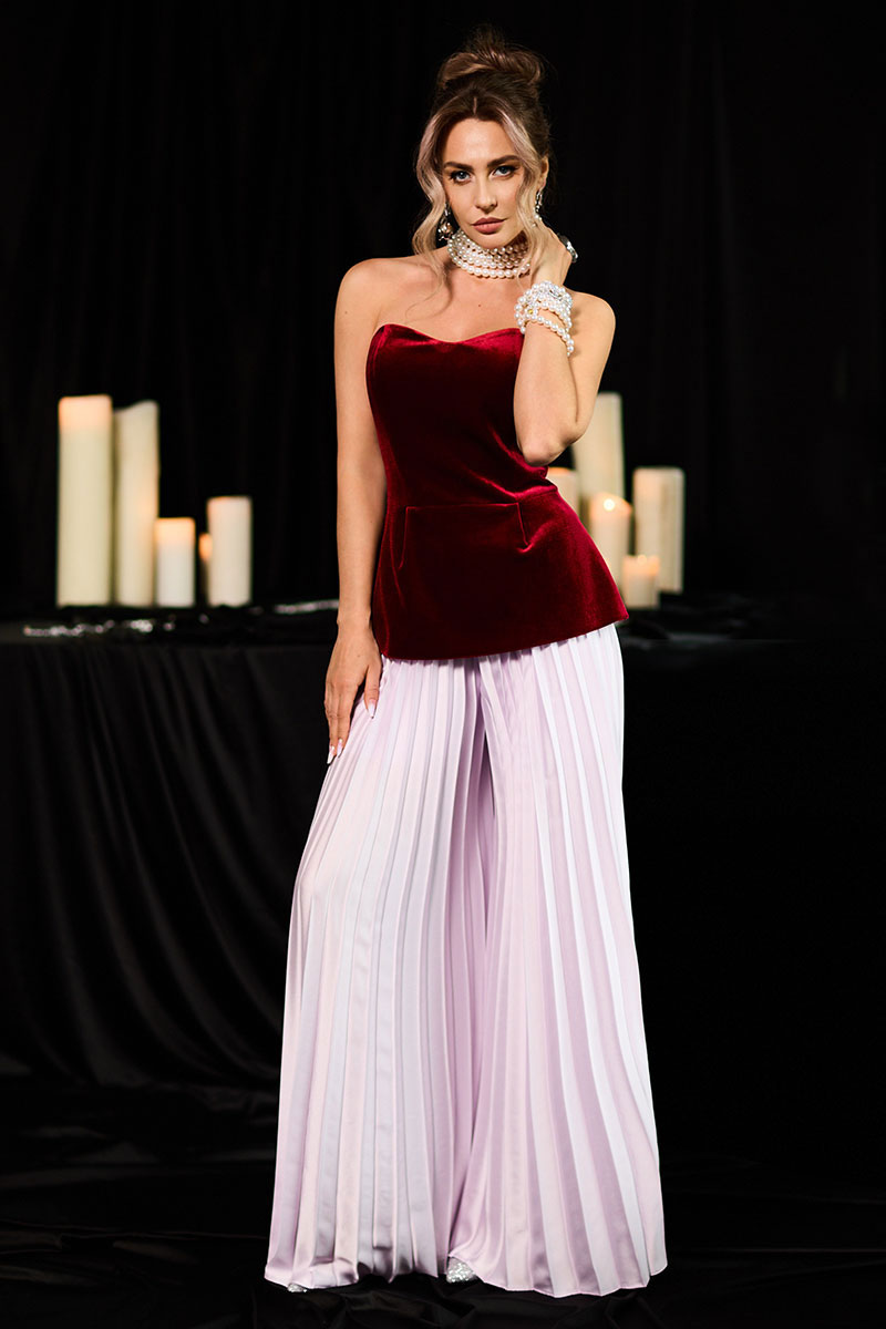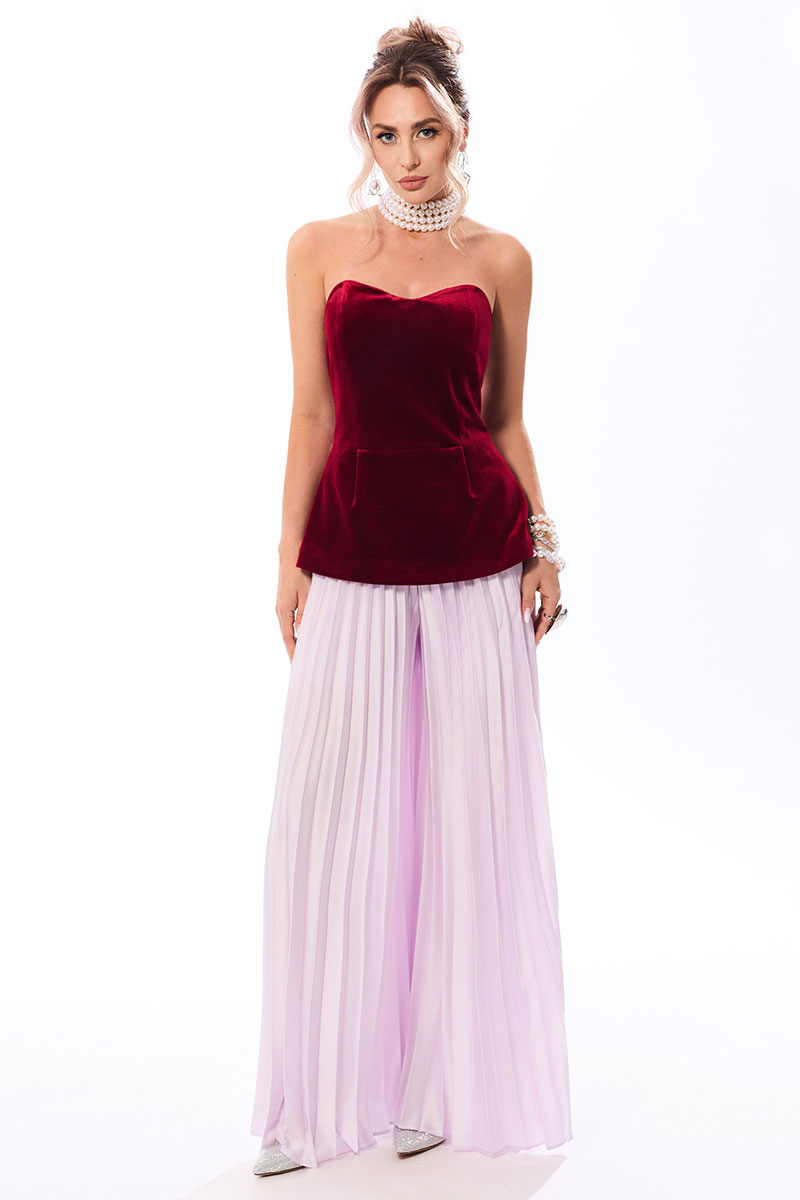 Брюки-гофре расширенного силуэта, с отрезным поясом, без застежки, верх брюк присборен на резинку. Брюки без боковых швов.