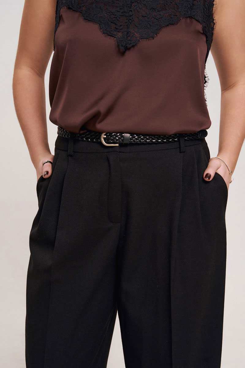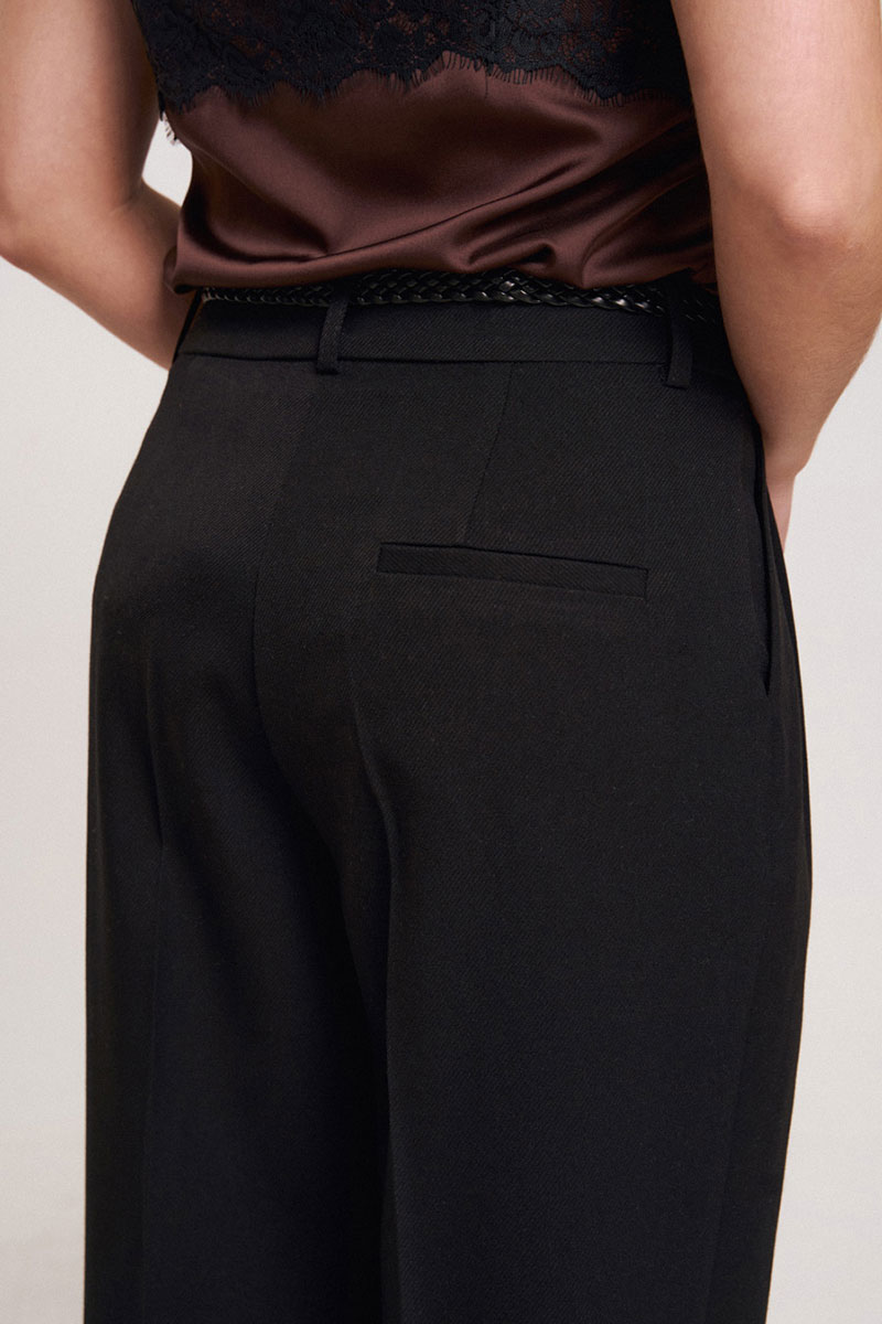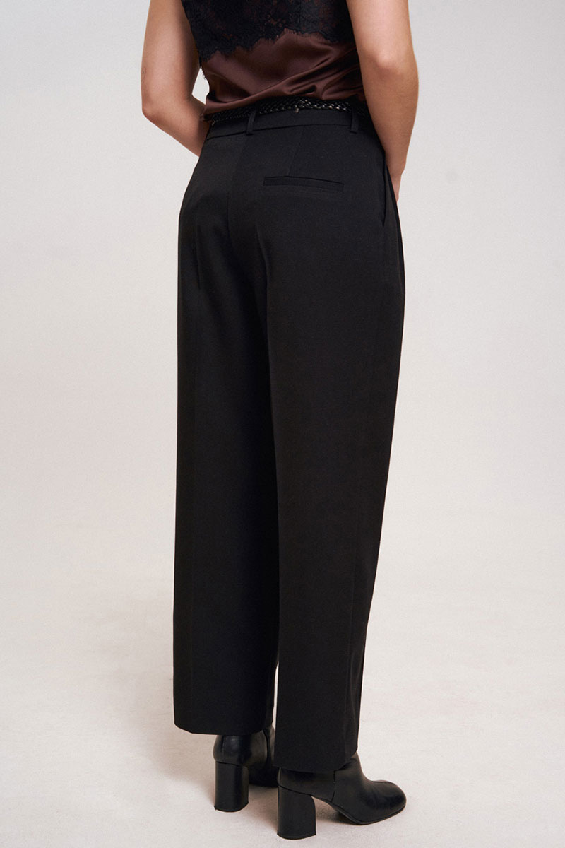 Брюки молодежные из ткани однотон ,на притачном поясе-кокетке прямого силуэта, перед с двумя складками и наклонными карманами и застежкой "гульфик" по переду, по ЗП 2 талиевые вытачки и горизонтальная листочка по правой стороне.