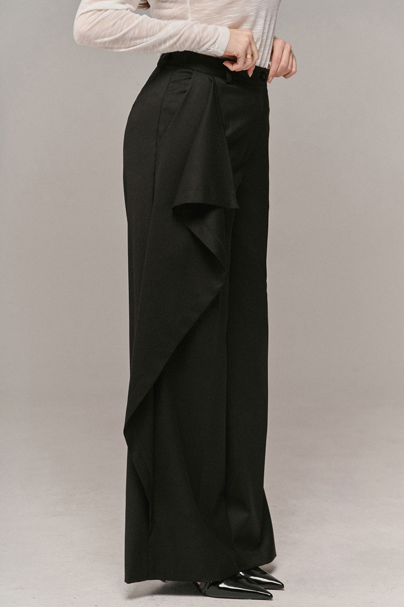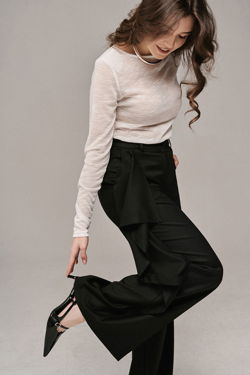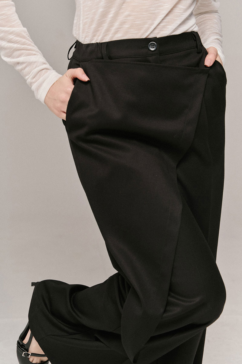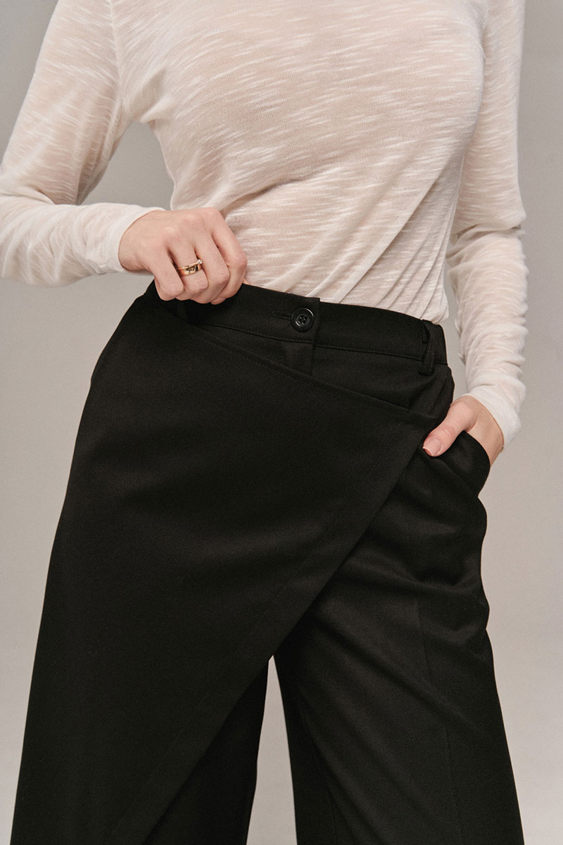 Брюки молодежные из ткани однотон, на притачном поясе прямого силуэта, с наклонными карманами и застежкой "гульфик" по переду, по ЗП 2 талиевые вытачки и эластичной тесьмой в поясе. По переду по правой части от бокового шва - отлетная деталь, частично вставлена в пояс и фиксируется на кнопку по левой передней половинке.