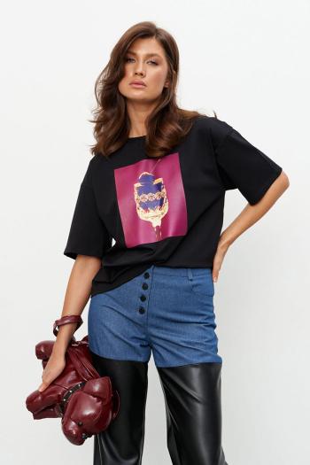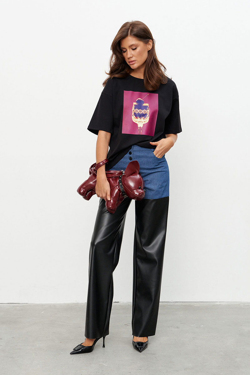 Брюки прямого силуэта выполнены на сочетании плотного джинса и экокожи. Брюки на поясе со шлёвками и застежкой на металлические пуговицы-болты. По переду два прорезных кармана, по спинке - два накладных.