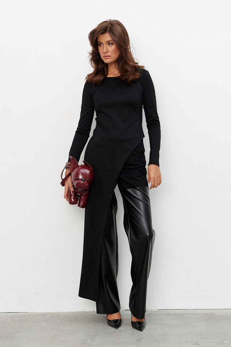 Брюки прямого силуэта выполнены на сочетании плотного джинса и экокожи. Брюки на поясе со шлёвками и застежкой на металлические пуговицы-болты. По переду два прорезных кармана, по спинке - два накладных.