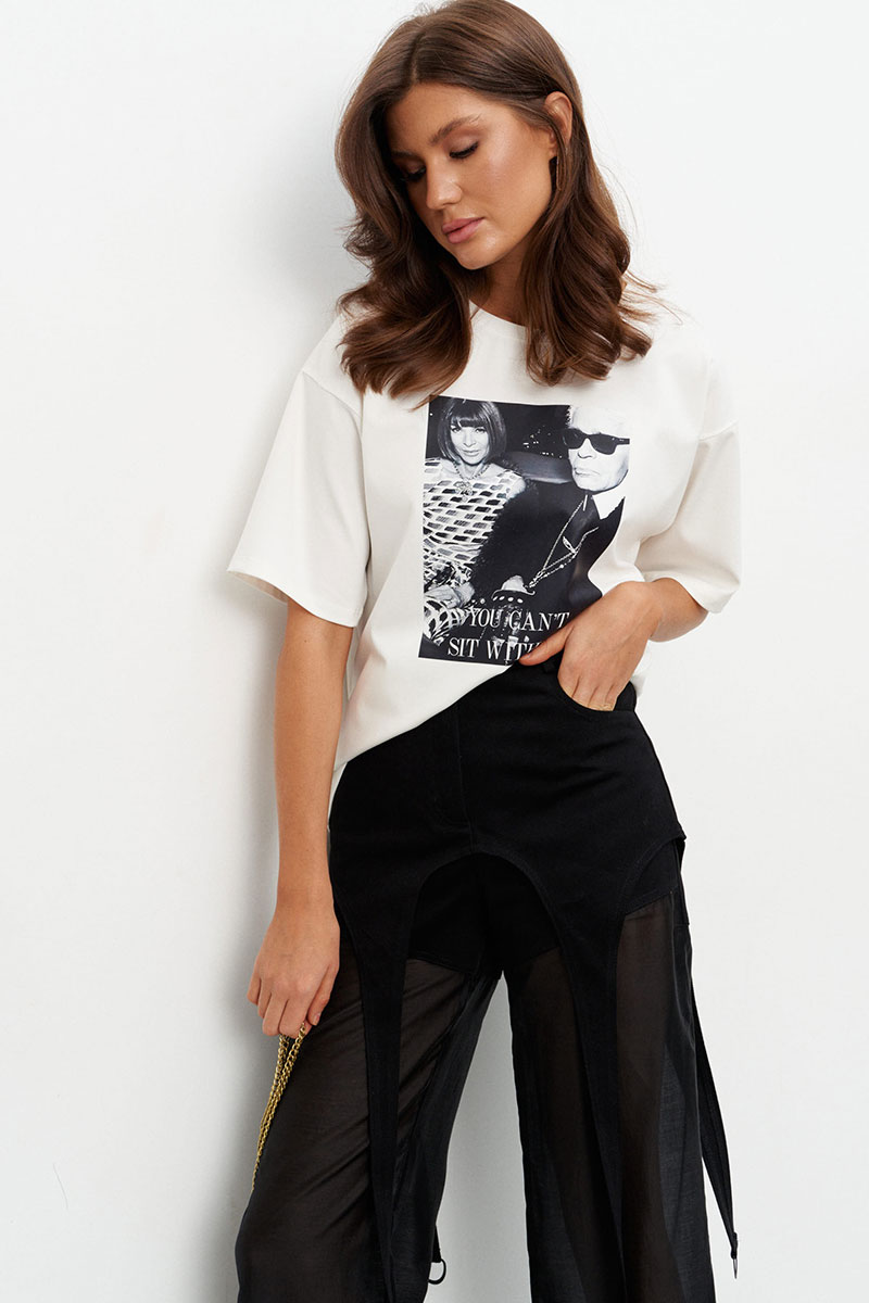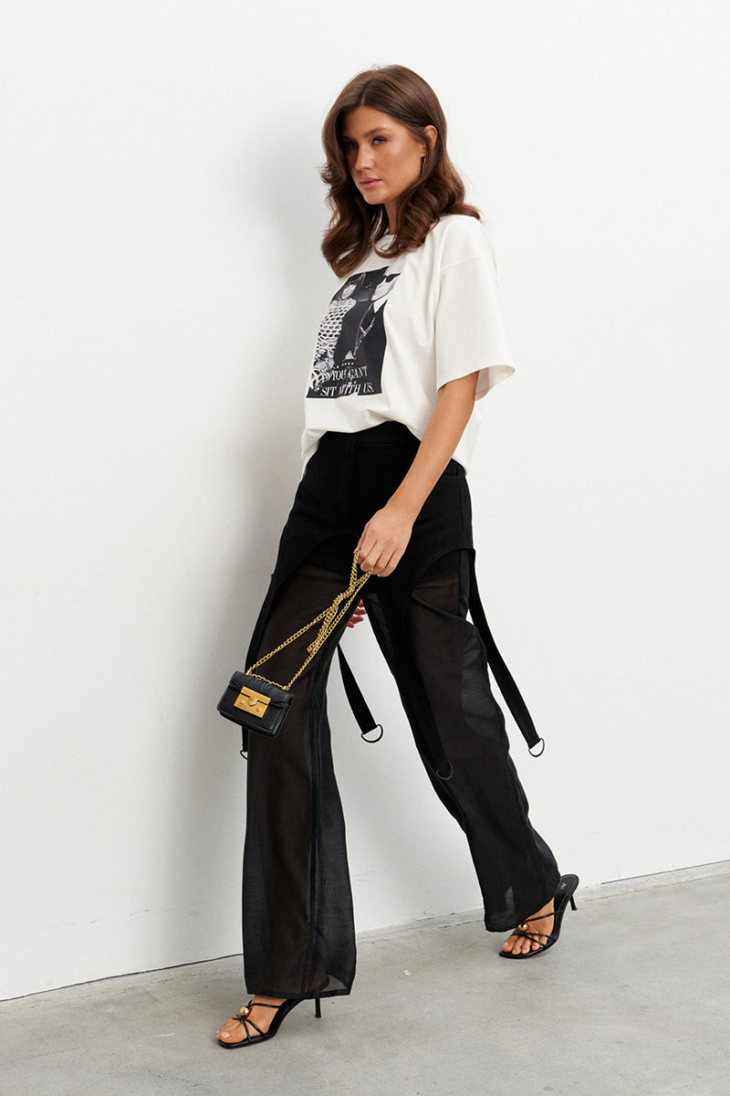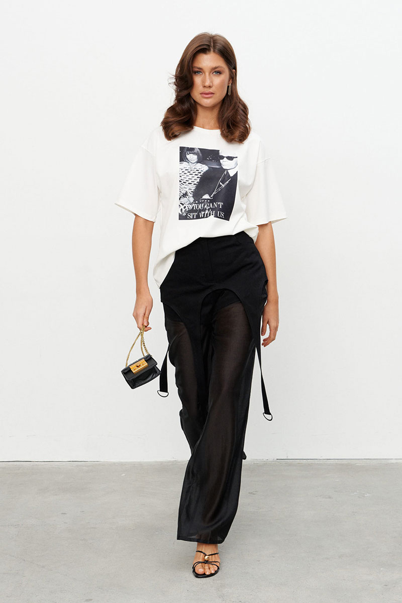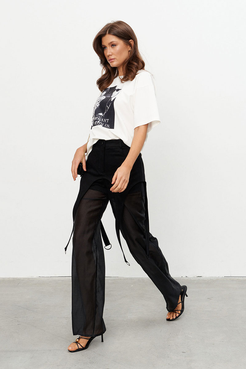 Брюки прямого силуэта с баской выполнены на сочетании плотного джинса и полупрозрачной вискозной вуали. Брюки на поясе со шлёвками и застёжкой на пуговицу-болт и молнию. Чуть ниже шва сидения идут подрезы имитирующие по форме мини-шорты. От подрезов вниз брюки выполнены из вуали. По переду два прорезных кармана, по спинке - два накладных.