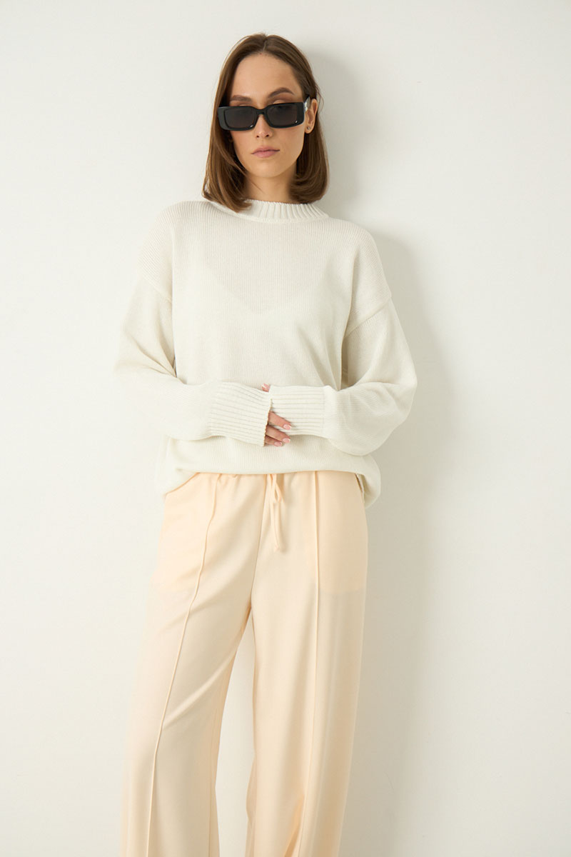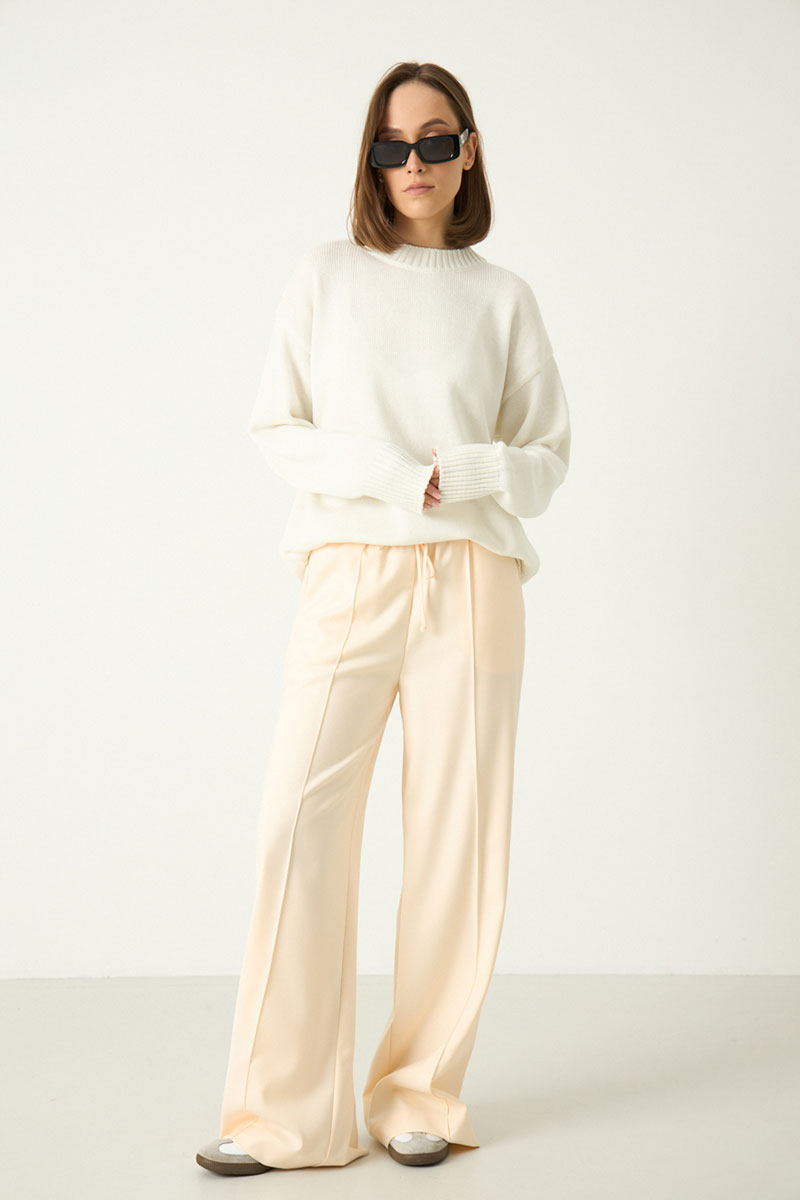 Широкие брюки с отстроченными стрелками по передним деталям. Пояс притачной с эластичной тесьмой и шнурком. В боковых швах обработаны наклонные карманы.