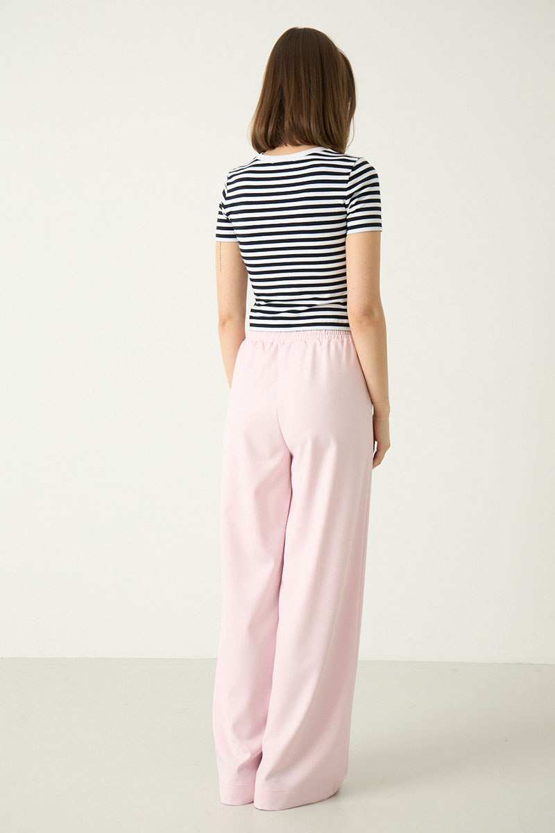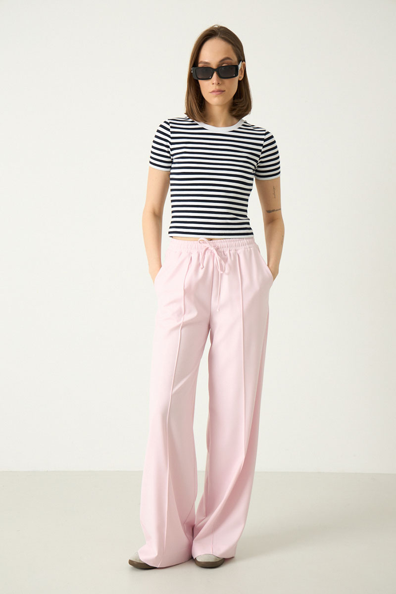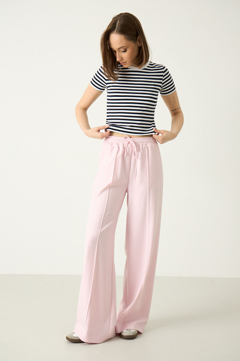 Широкие брюки с отстроченными стрелками по передним деталям. Пояс притачной с эластичной тесьмой и шнурком. В боковых швах обработаны наклонные карманы.