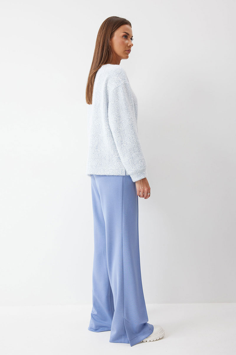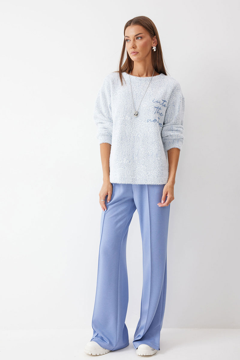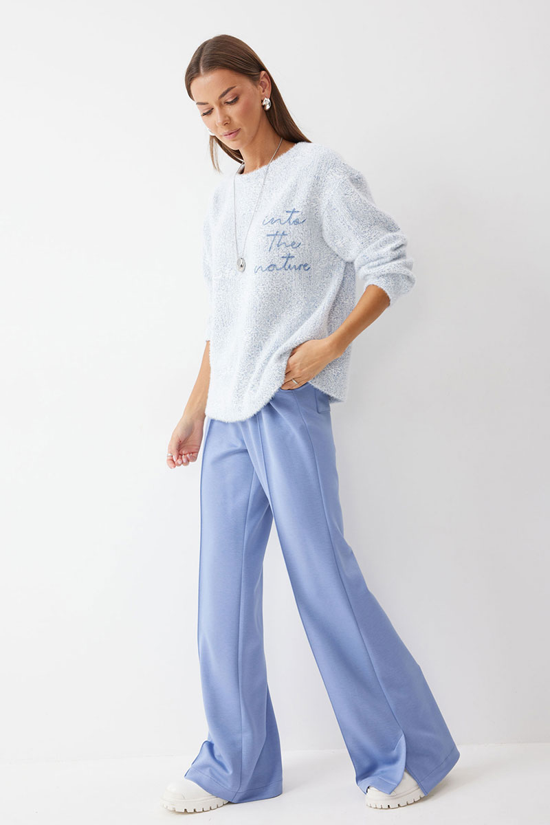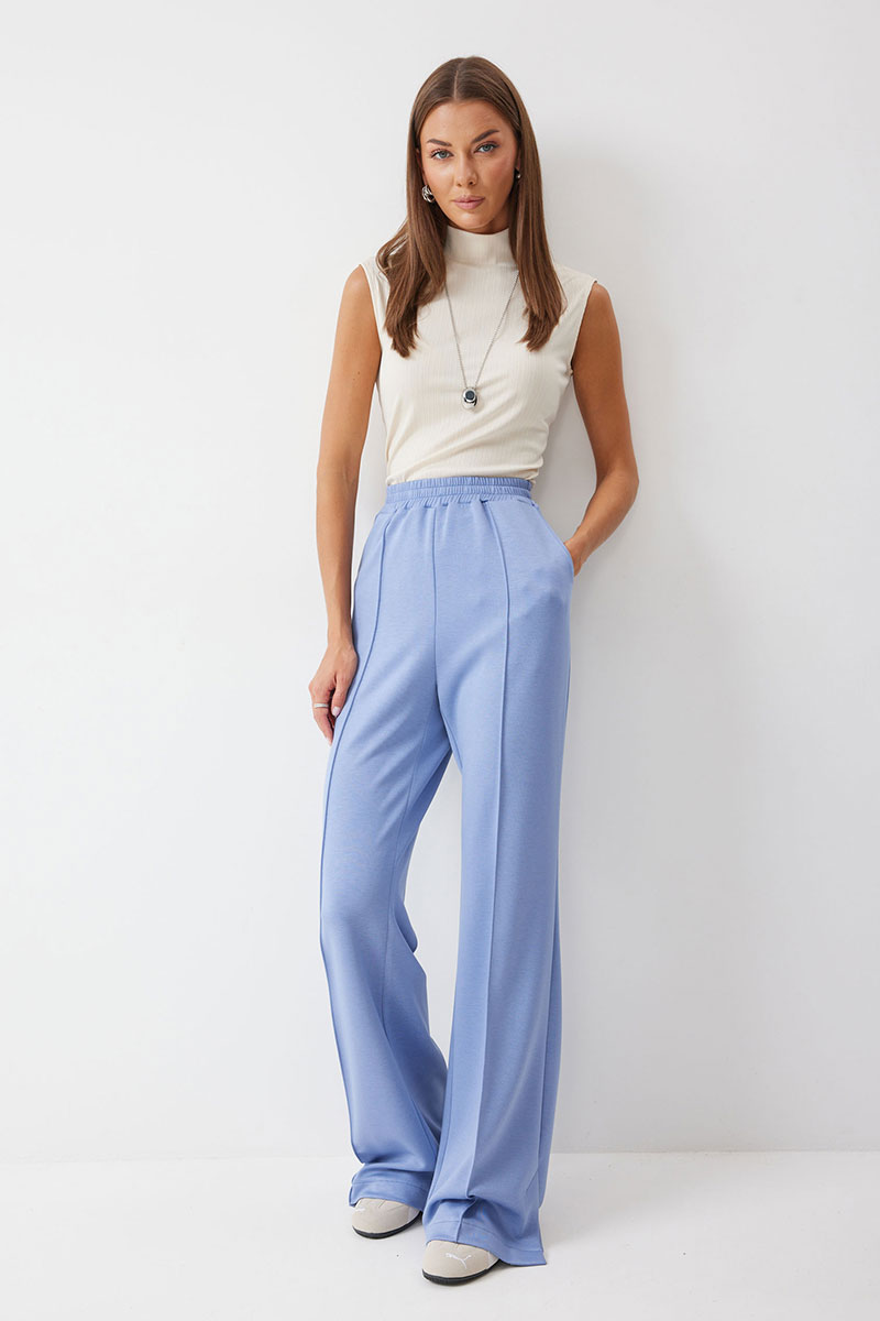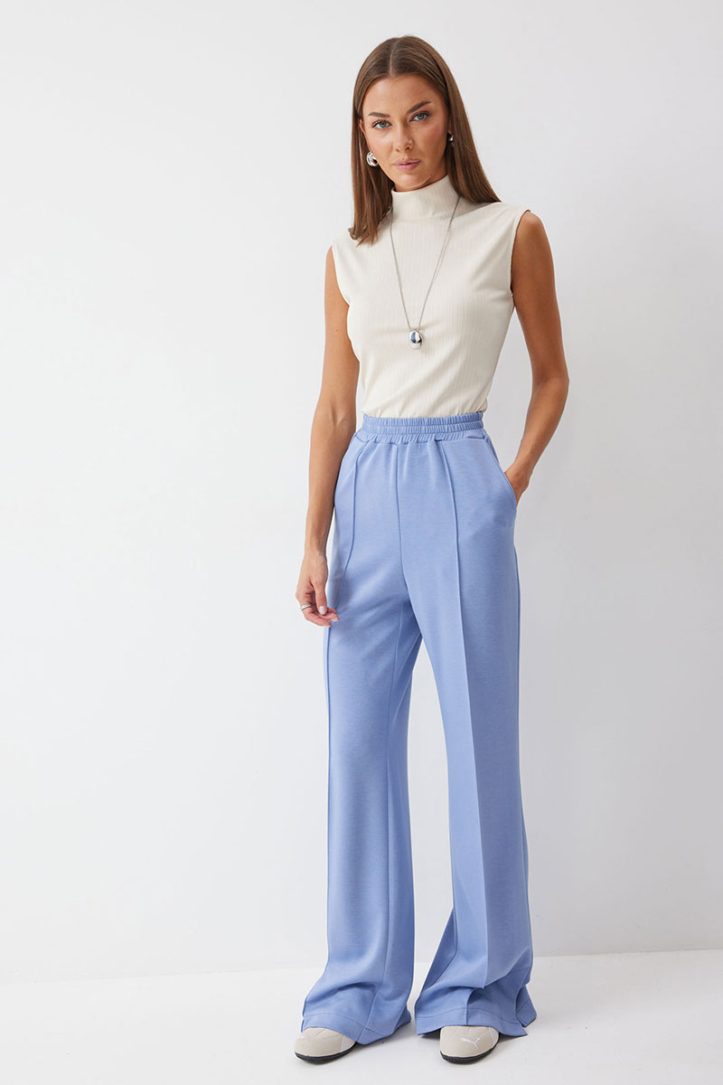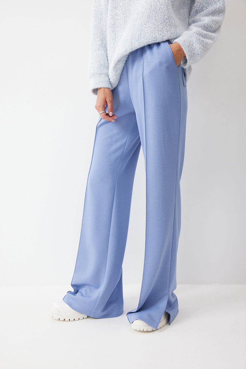 Брюки прямого силуэта из трикотажного полотна. По верху брюк притачной пояс на резинке. На передних половинках брюк обработаны карманы и защипы. На задних – карманы. По низу внешнего шва брюк шлицы.