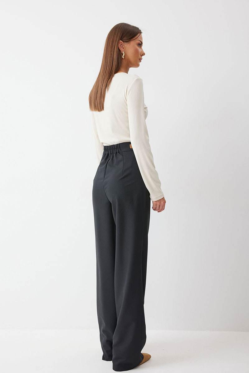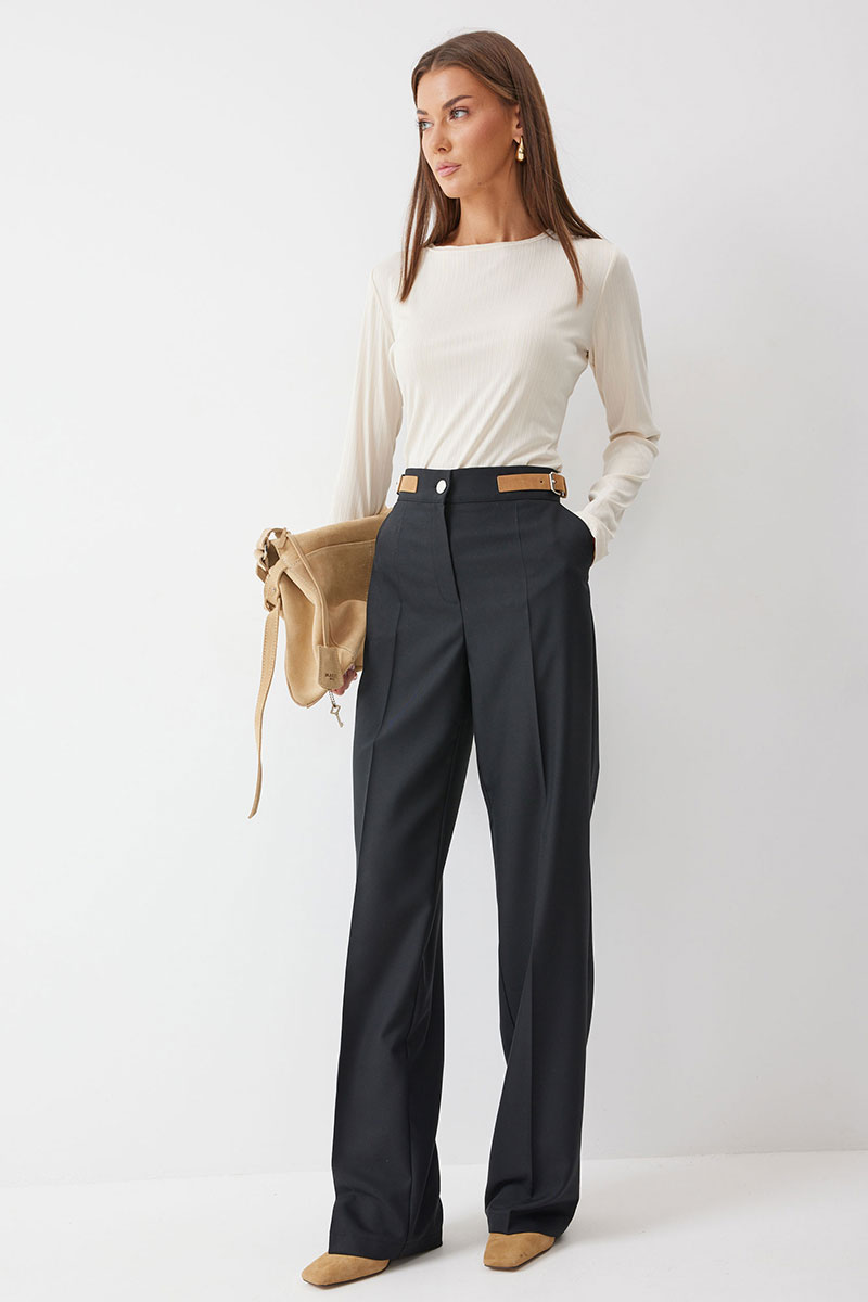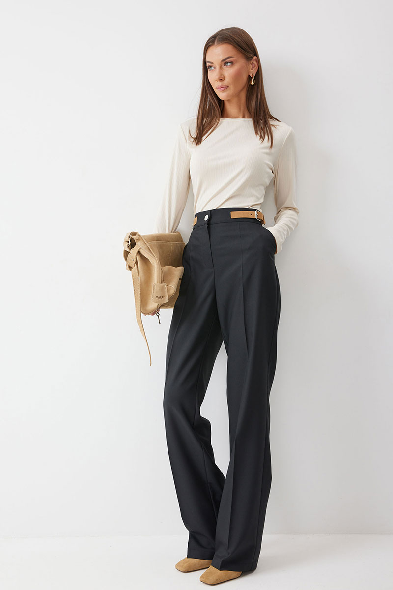 Брюки прямого силуэта из костюмной ткани. По верху брюк притачной пояс с застежкой на петлю и пуговицу, по верху пояса ,на боковых швах, расположены декоративные пряжки. На передних половинках обработаны карманы и застежка молния в среднем шве. На задних половинках вытачки. По поясу задних половинок брюк резинка.