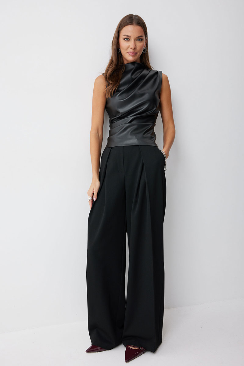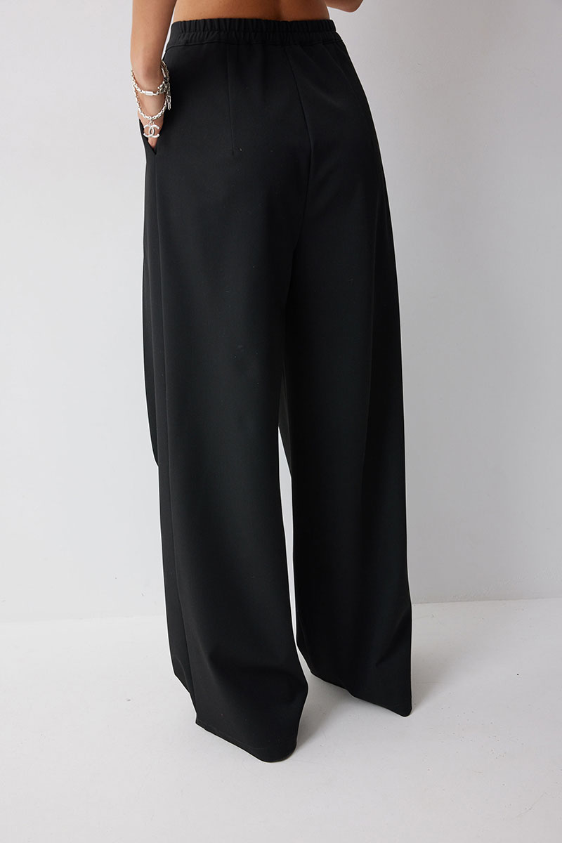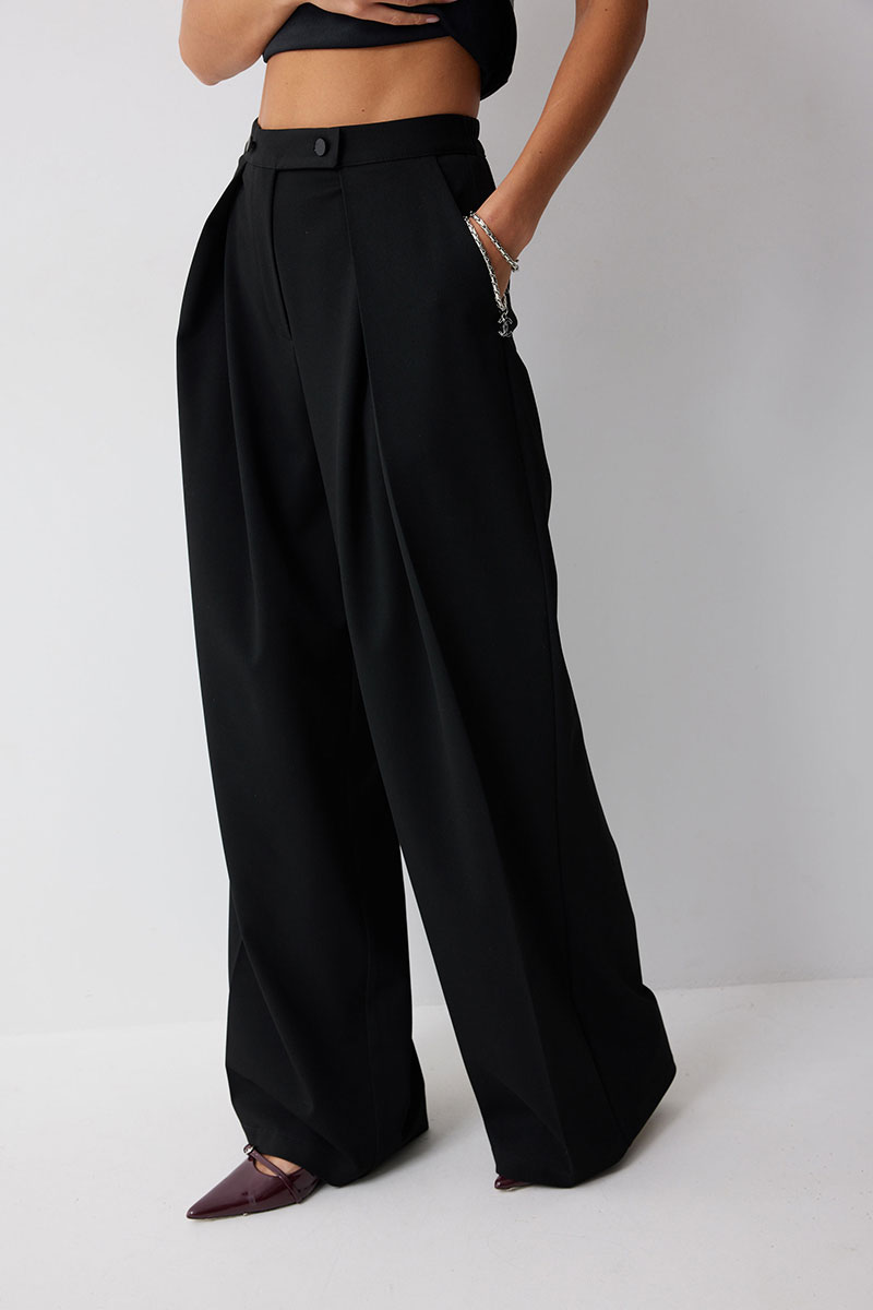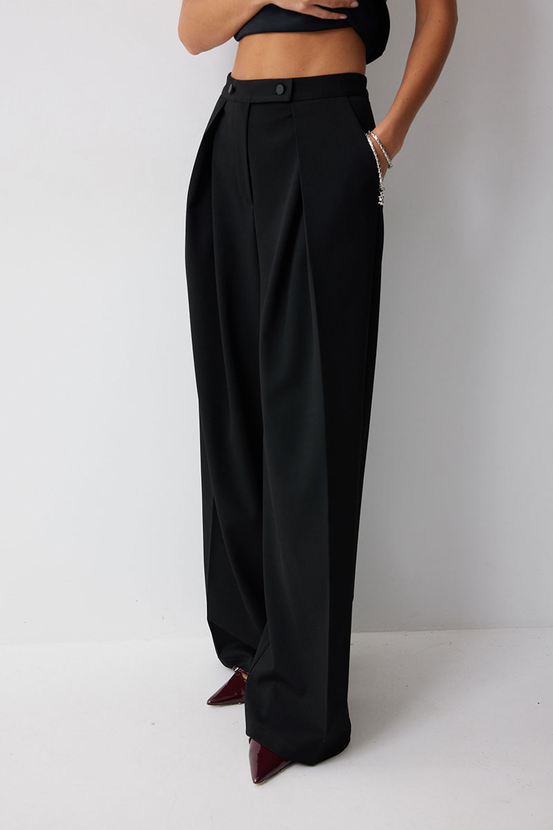 Брюки прямого силуэта расширенные книзу из костюмной ткани. По верху брюк  притачной пояс с застежкой на петли и пуговицы. На передних половинках обработана застежка молния в среднем шве. На передних половинках карманы и декоративные складки. По поясу задних половинок брюк резинка и вытачки. Обращаем ваше внимание, что фурнитура может отличаться от фото.