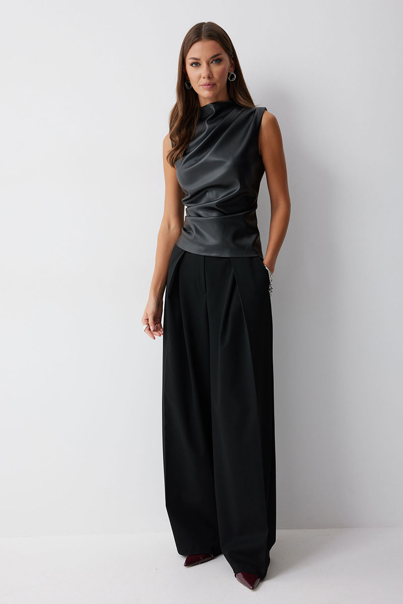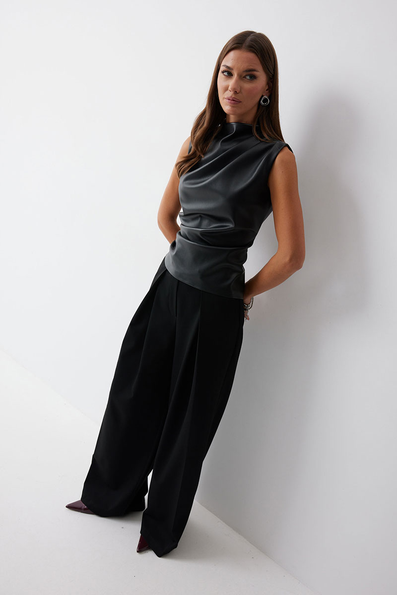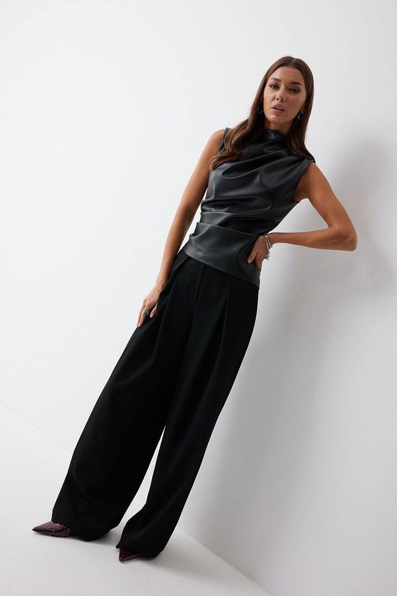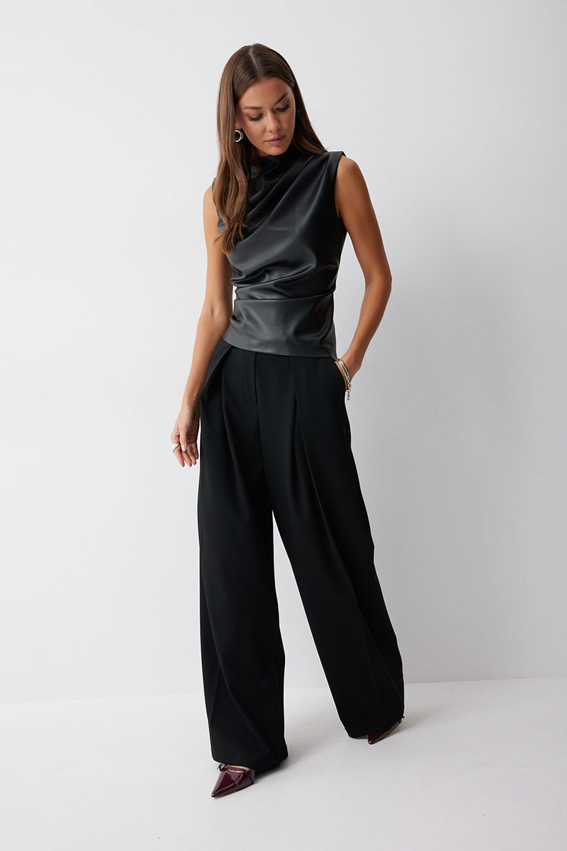 Брюки прямого силуэта расширенные книзу из костюмной ткани. По верху брюк  притачной пояс с застежкой на петли и пуговицы. На передних половинках обработана застежка молния в среднем шве. На передних половинках карманы и декоративные складки. По поясу задних половинок брюк резинка и вытачки. Обращаем ваше внимание, что фурнитура может отличаться от фото.