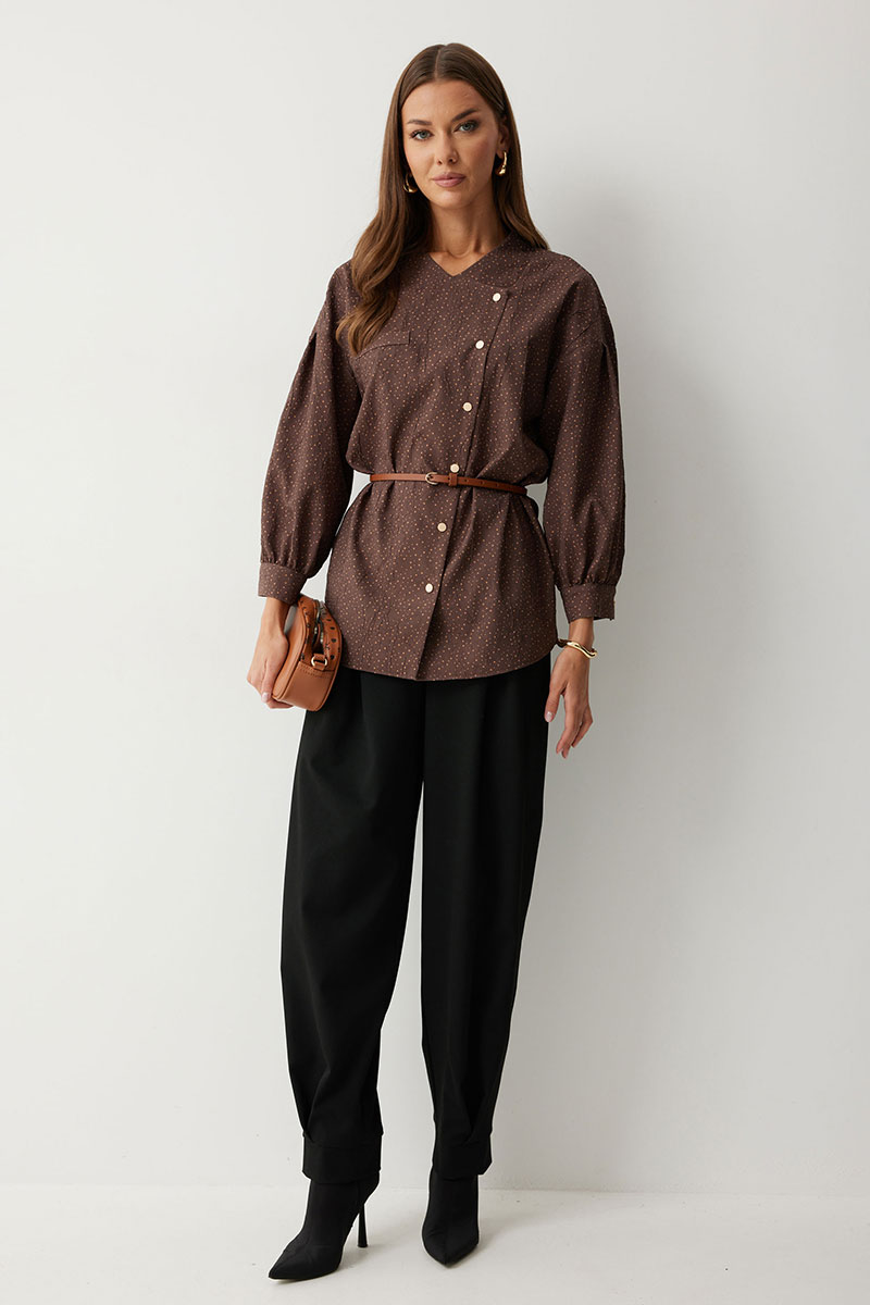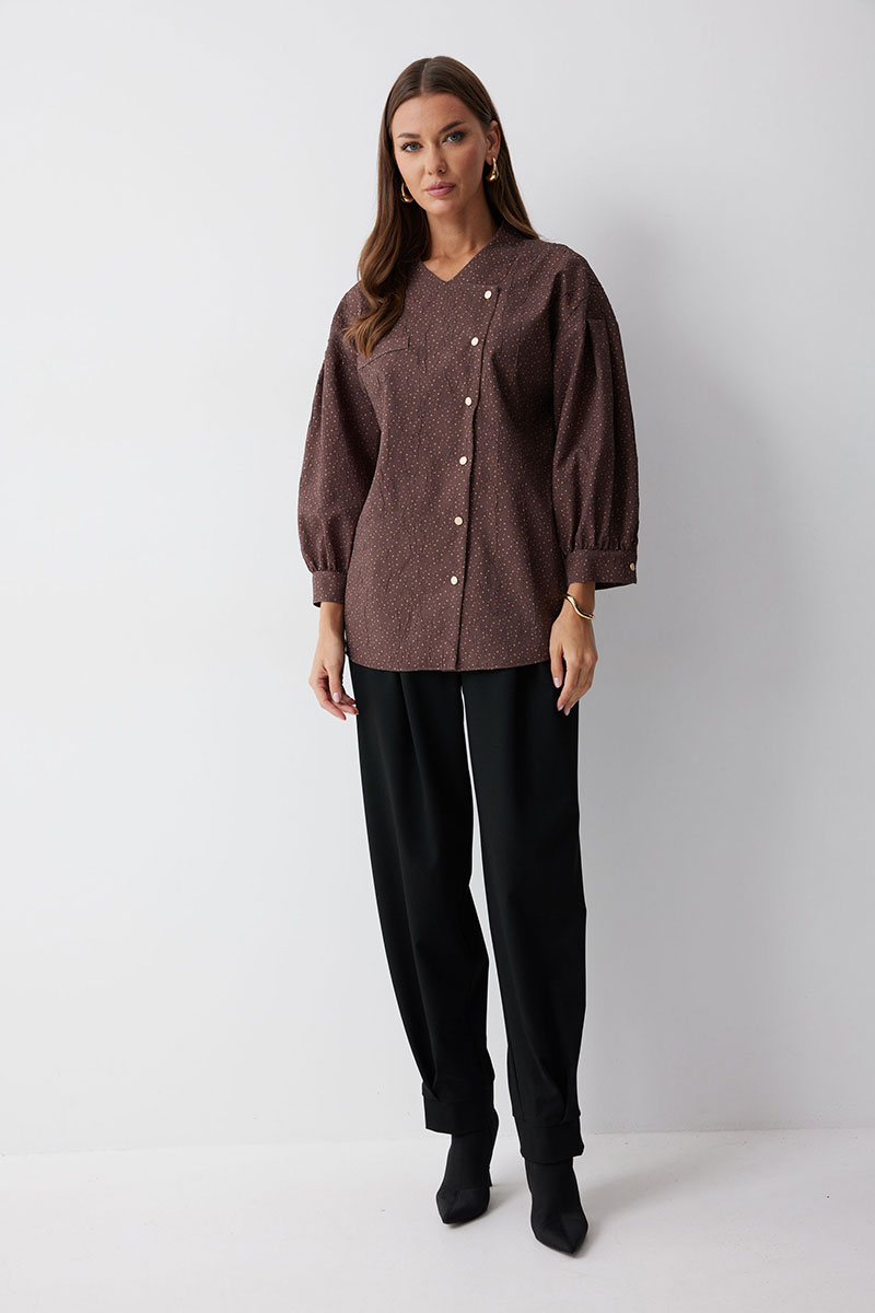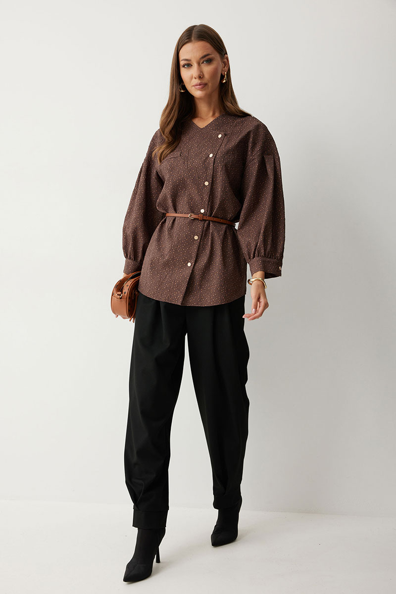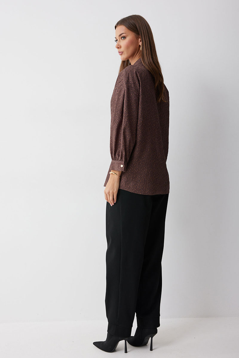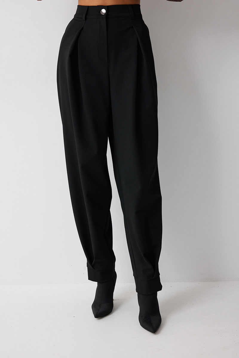 Брюки из костюмной ткани, зауженные книзу. По верху брюк притачной пояс с застежкой на петлю и пуговицу и шлевками для ремня. По поясу задних половинок брюк резинка. На передних половинках обработаны боковые карманы и застежка молния в среднем шве. По верху и низу брюк расположены встречные складки. По низу брюк – манжеты. На задних половинках накладные карманы.