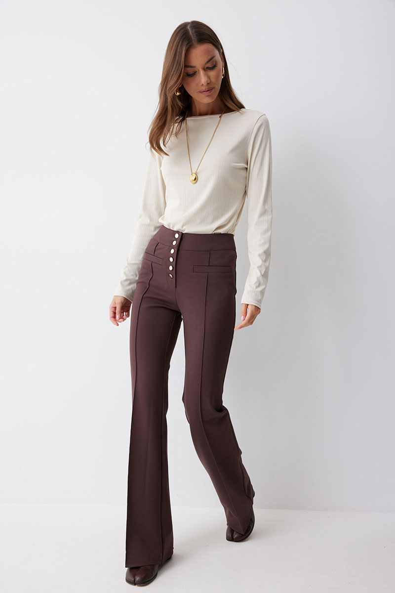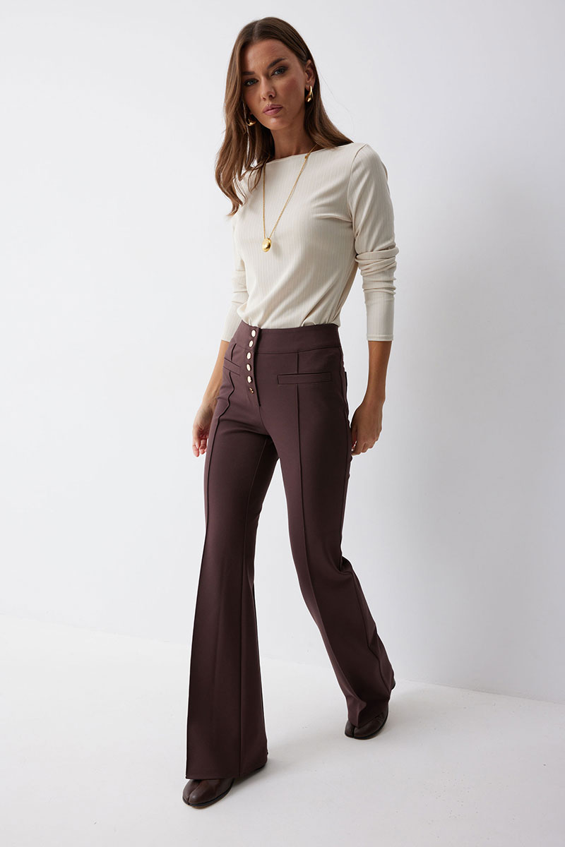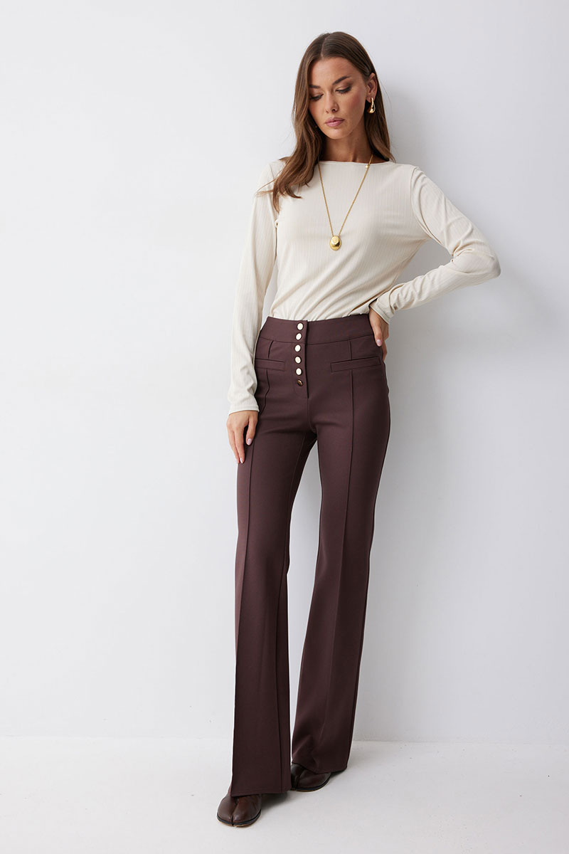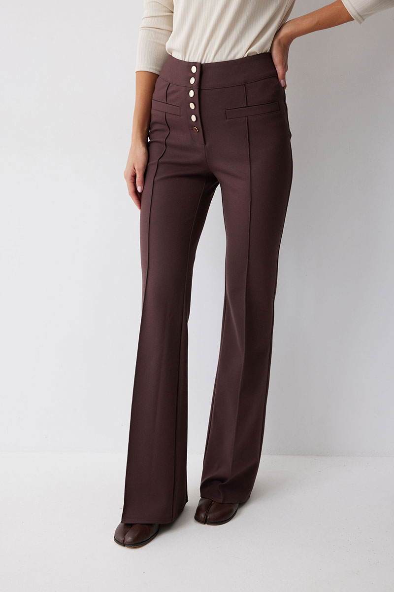 Брюки прямого силуэта с защипами из трикотажного полотна. По верху брюк притачной пояс и центральная застежка на петли и пуговицы. На передних половинках защипы и декоративные листочки. На задних половинках брюк накладные карманы. Обращаем ваше внимание, что фурнитура может отличаться от фото.