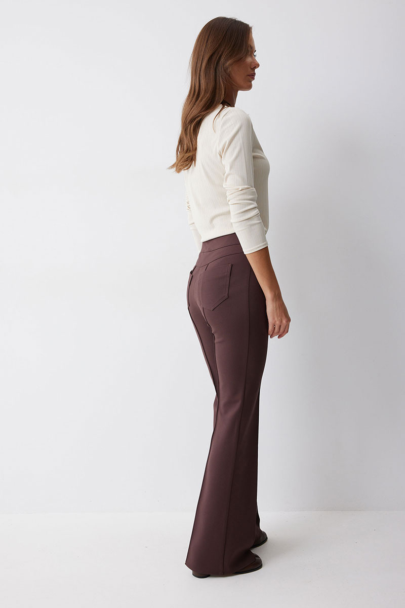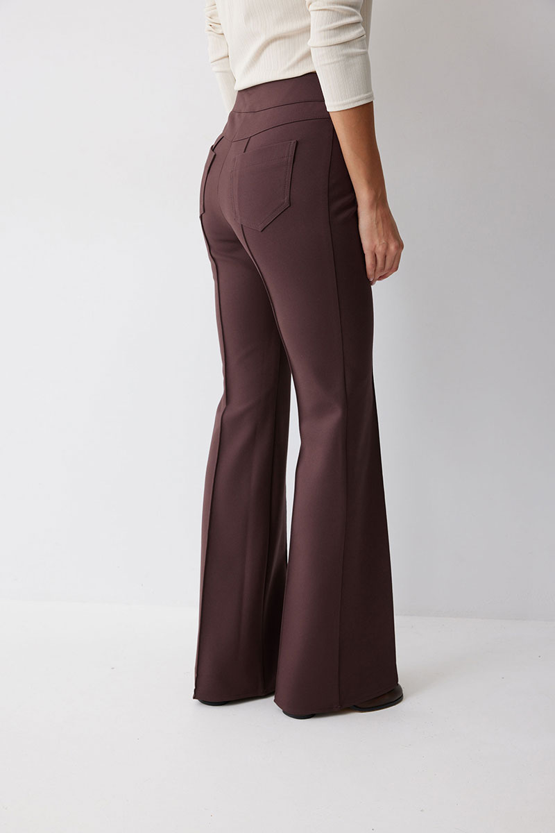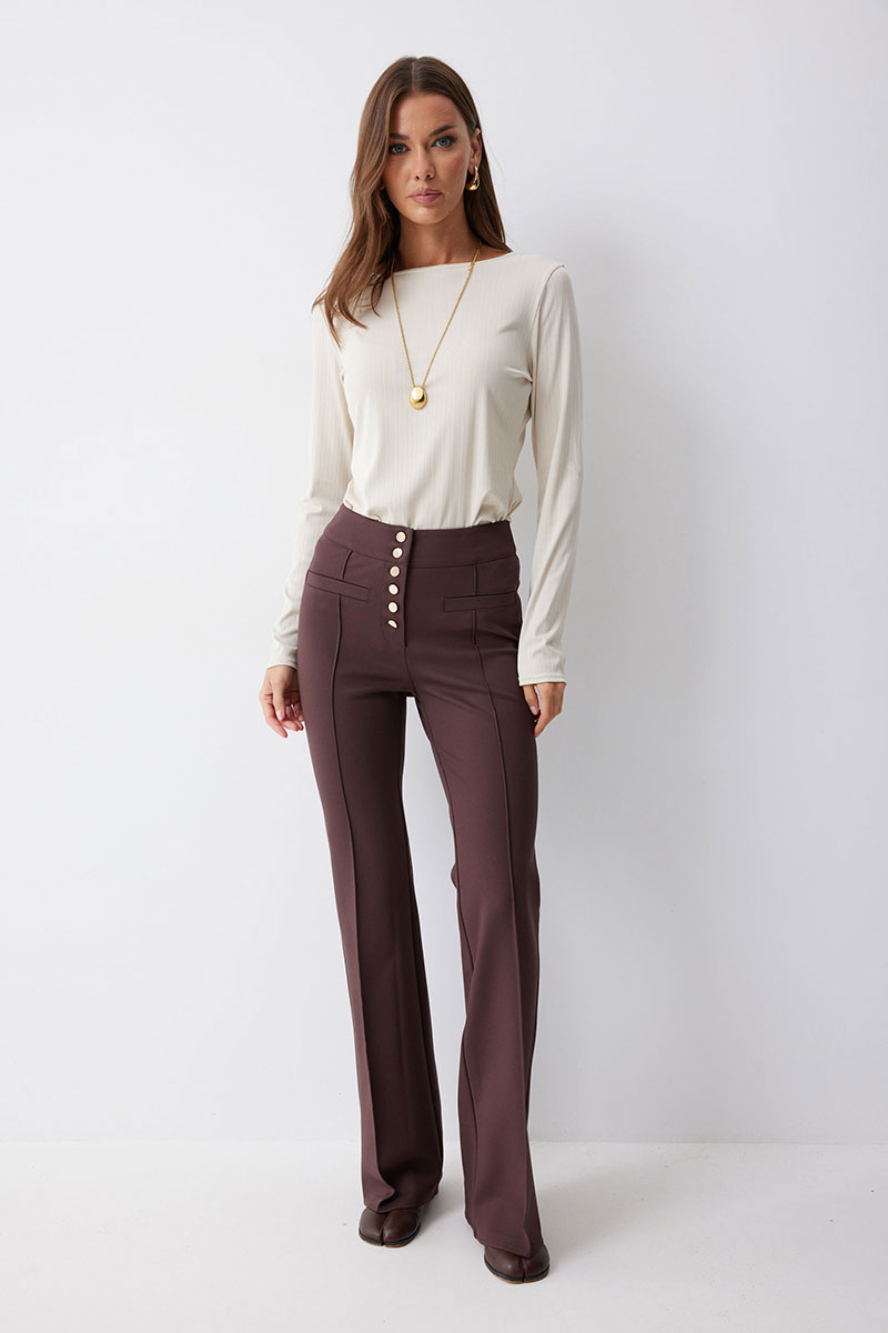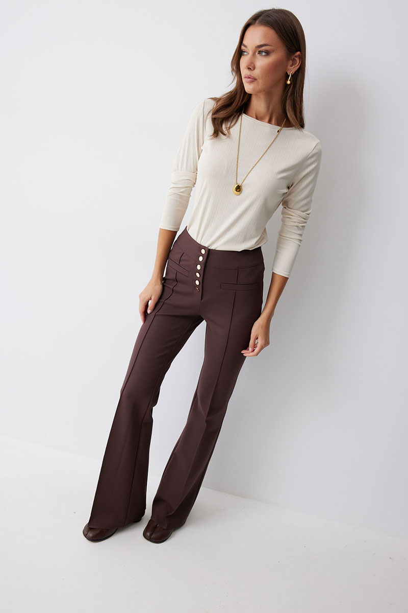 Брюки прямого силуэта с защипами из трикотажного полотна. По верху брюк притачной пояс и центральная застежка на петли и пуговицы. На передних половинках защипы и декоративные листочки. На задних половинках брюк накладные карманы. Обращаем ваше внимание, что фурнитура может отличаться от фото.