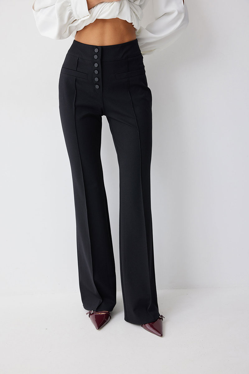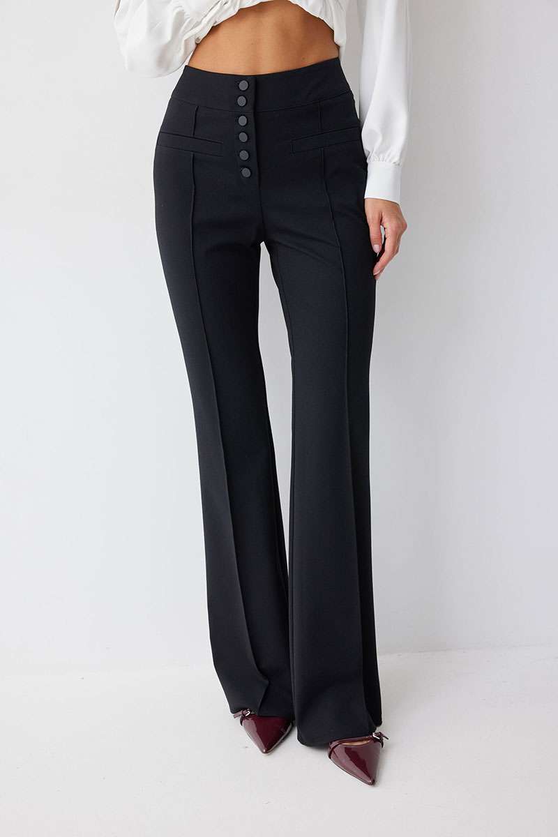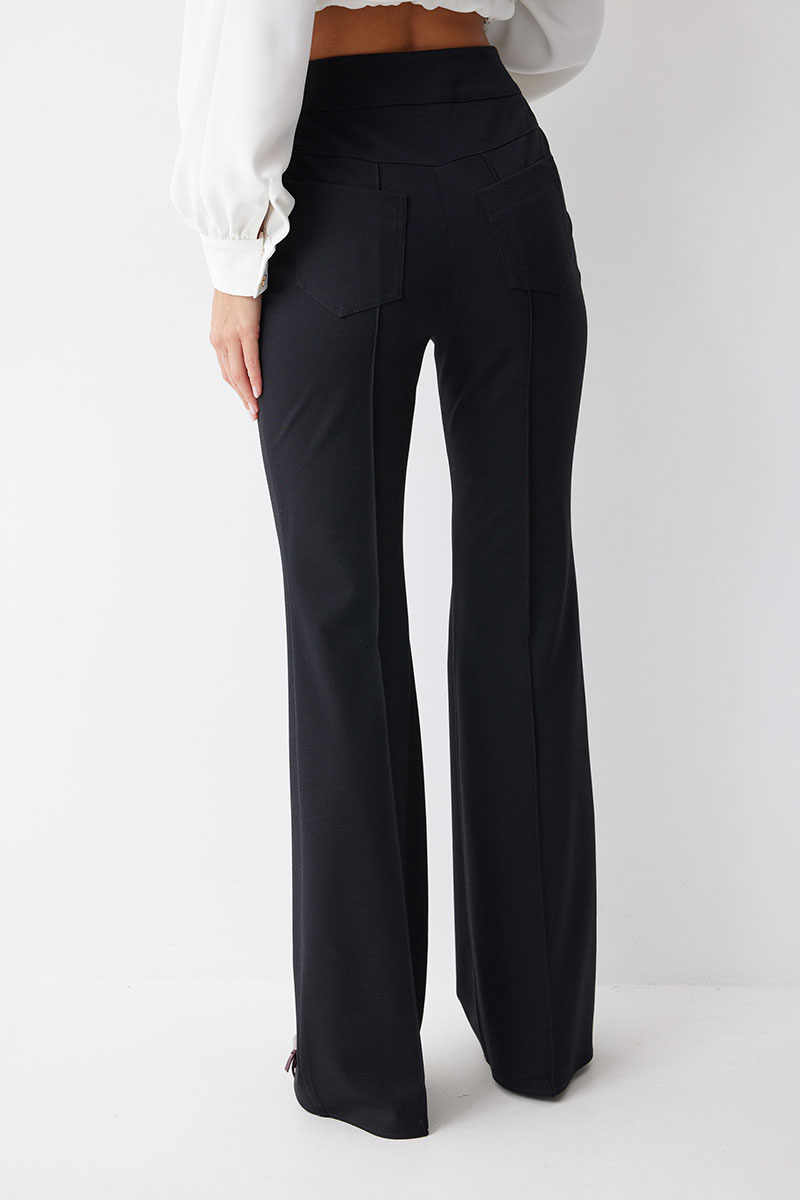 Брюки прямого силуэта  с защипами из трикотажного полотна. По верху брюк  притачной пояс и центральная застежка на петли и пуговицы. На передних половинках защипы и декоративные листочки. На задних половинках брюк накладные карманы.  Обращаем ваше внимание, что фурнитура может отличаться от фото.
