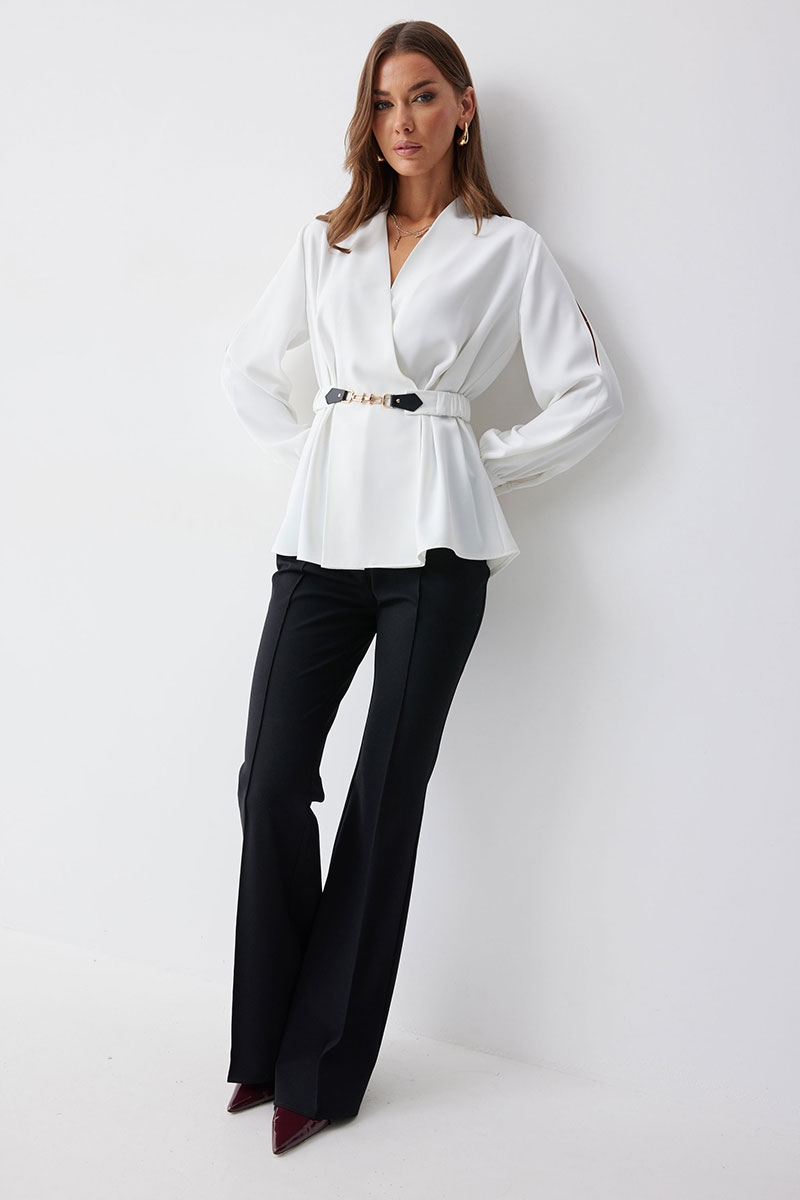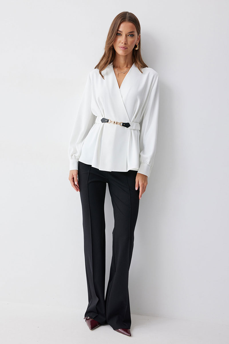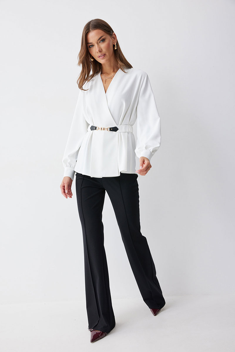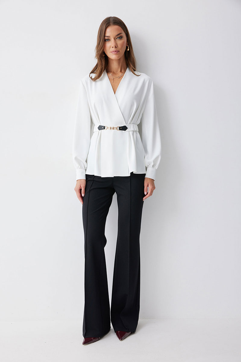 Брюки прямого силуэта  с защипами из трикотажного полотна. По верху брюк  притачной пояс и центральная застежка на петли и пуговицы. На передних половинках защипы и декоративные листочки. На задних половинках брюк накладные карманы.  Обращаем ваше внимание, что фурнитура может отличаться от фото.