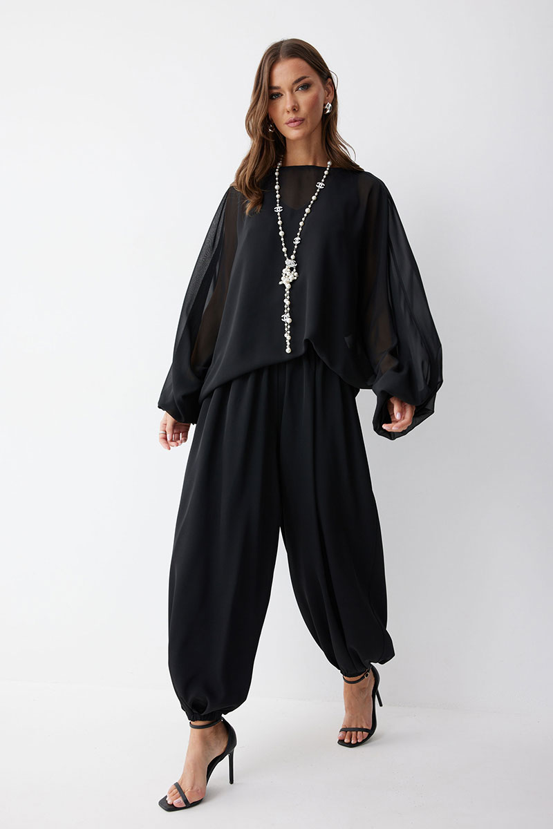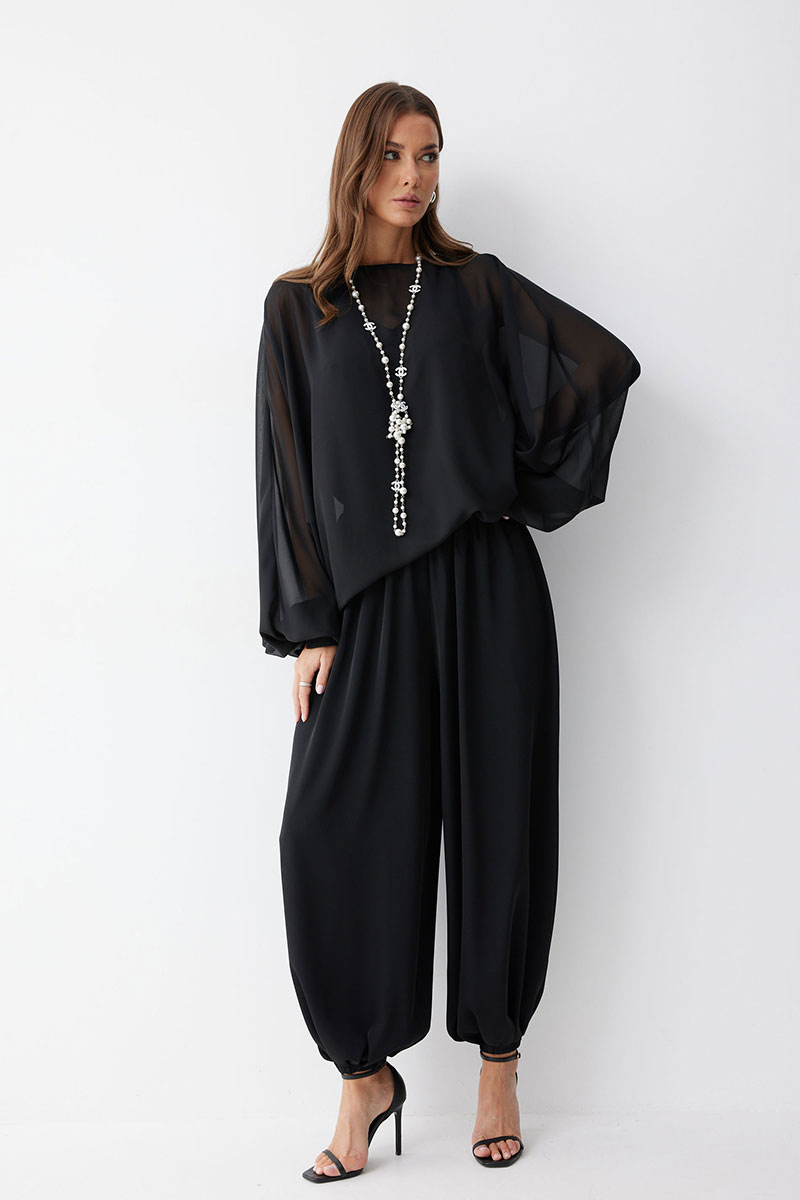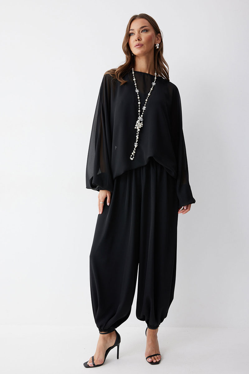 Брюки шаровары свободного, расширенного силуэта, по низу со сборкой. Из струящейся ткани. Пояс с резинкой. По низу манжеты с резинкой.