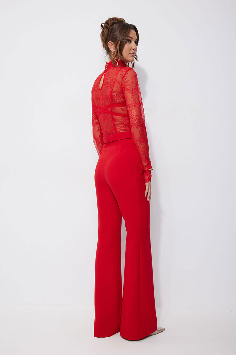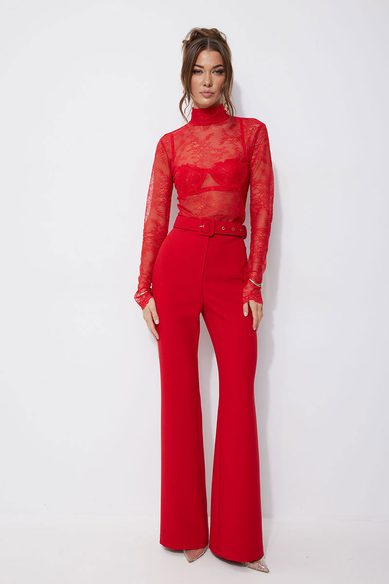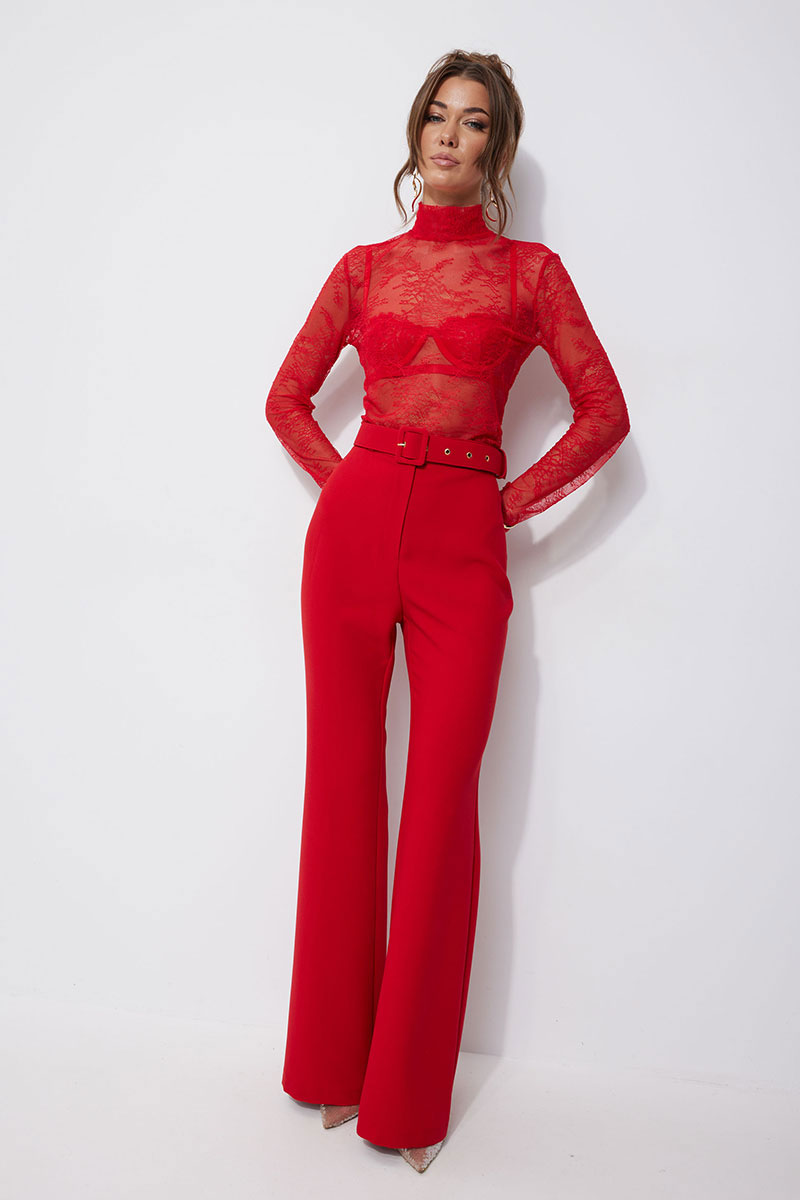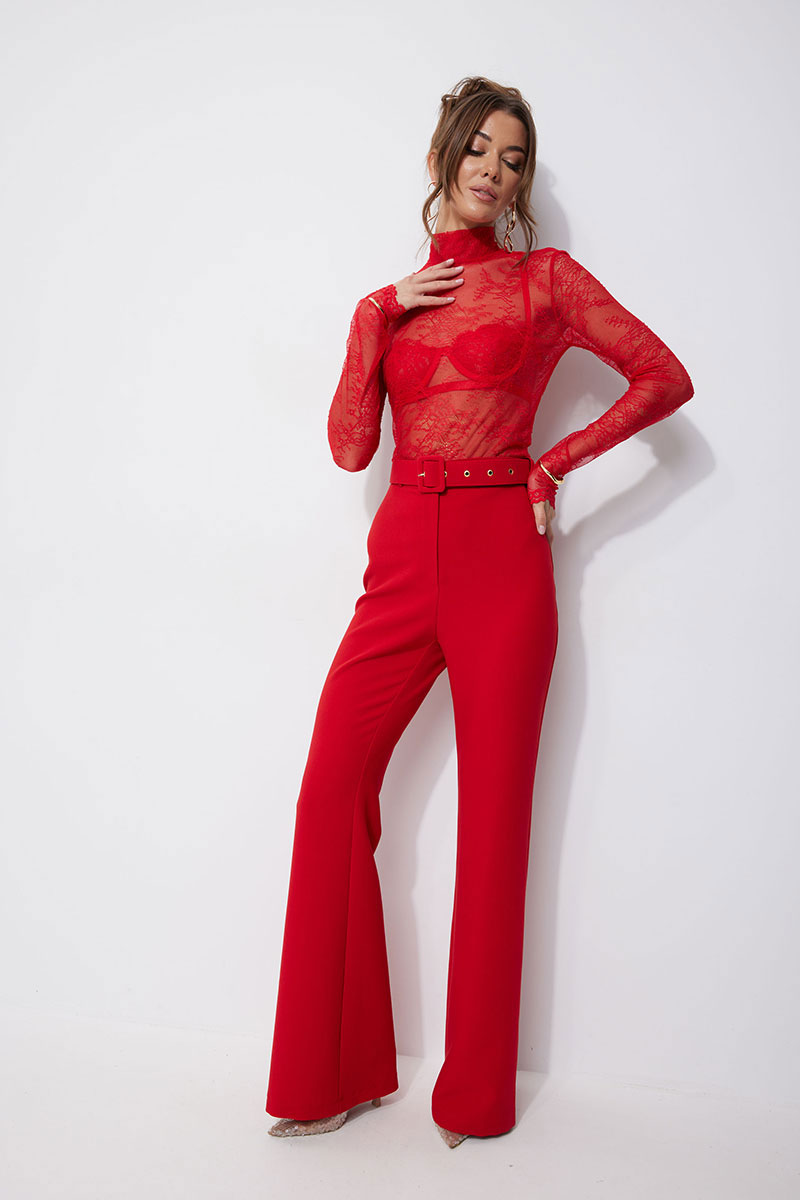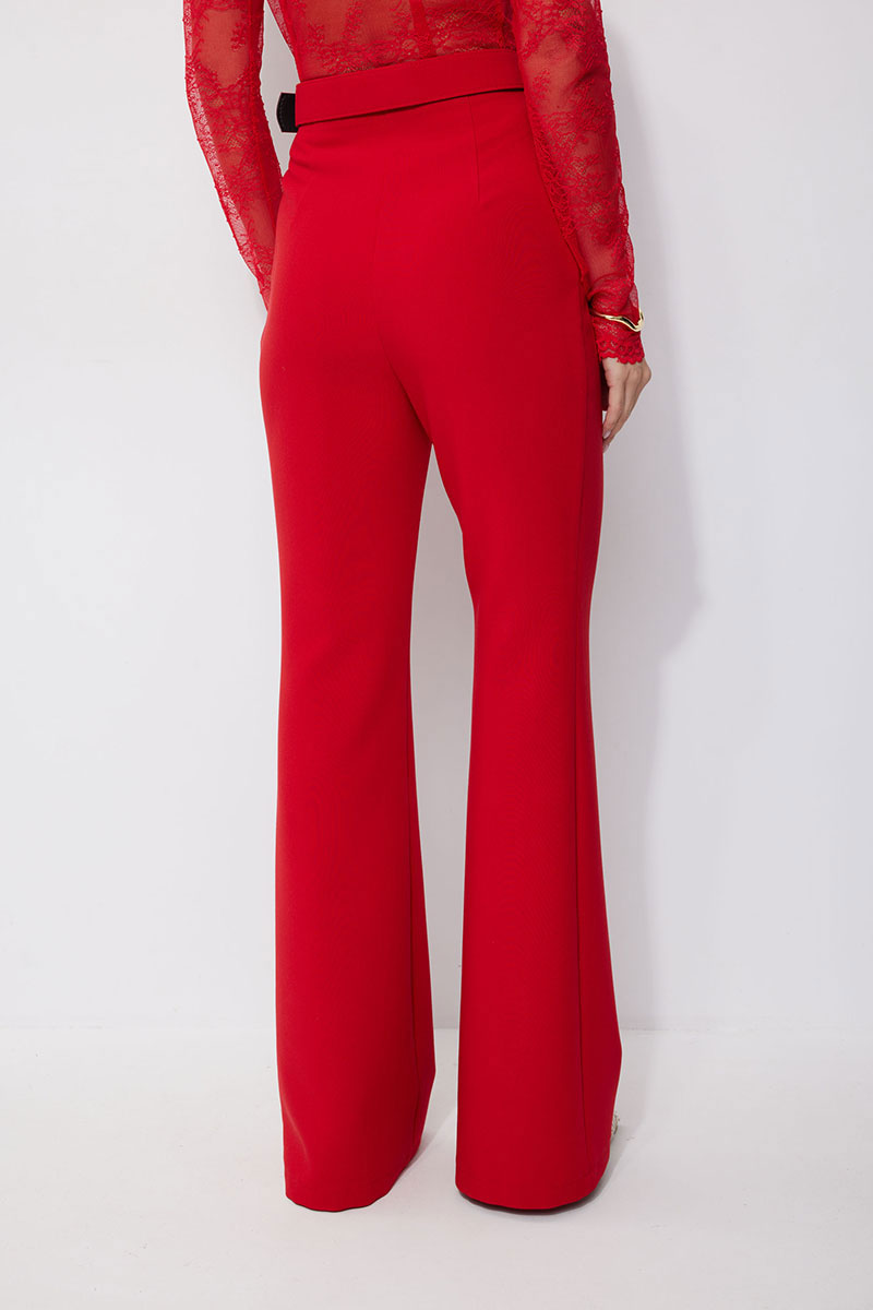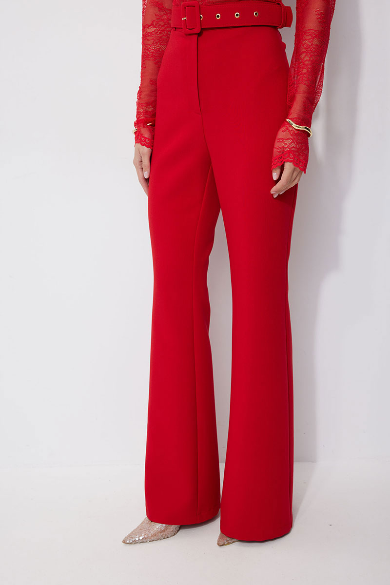 Брюки прилегающего силуэта расширенные книзу из костюмной ткани. По верху притачной пояс с застежкой на петлю и пуговицу и шлевками для ремня. На передних половинках обработана застежка молния в среднем шве. В комплект входит съемный ремень. Обращаем ваше внимание, что фурнитура может отличаться от фото.