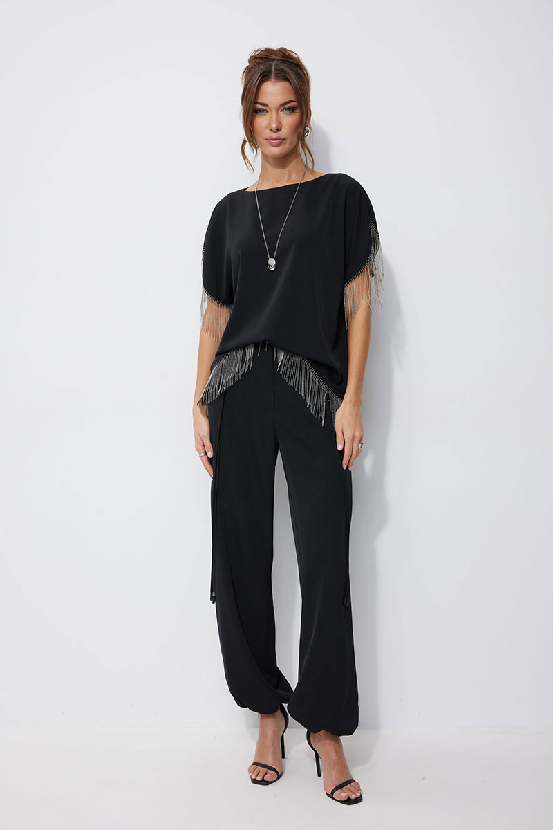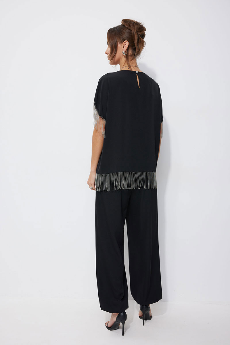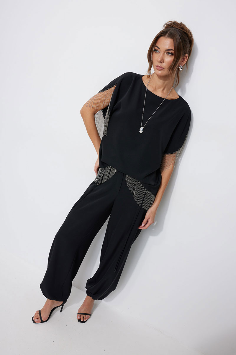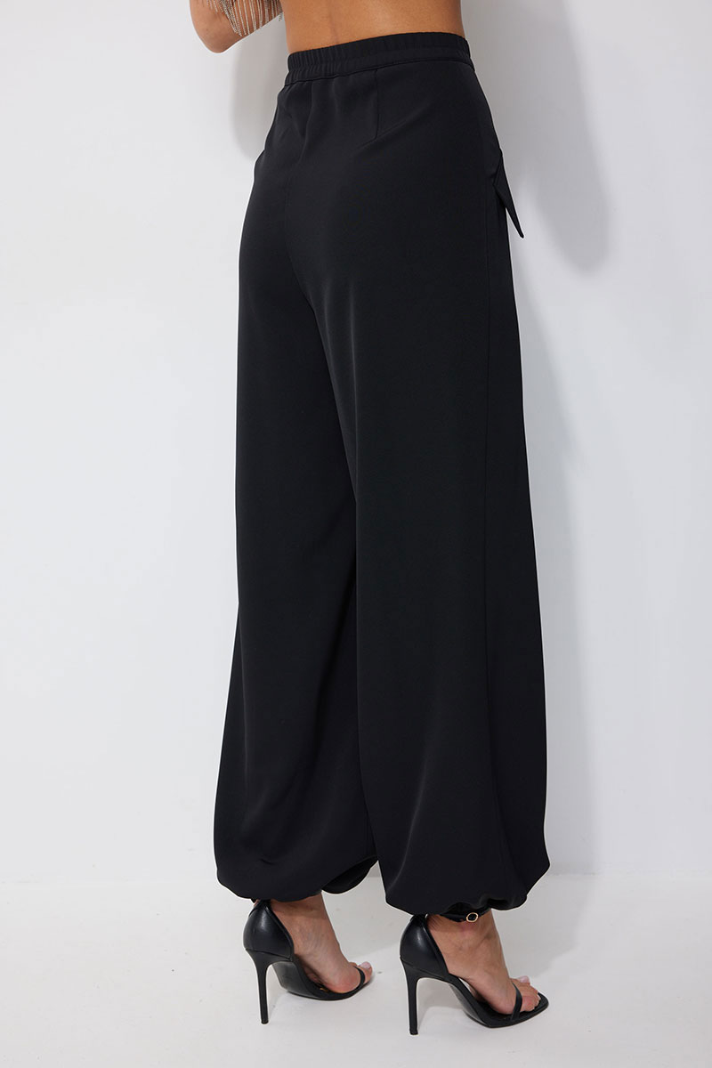 Брюки свободного силуэта из струящейся ткани. По верху брюк притачной пояс с застежкой на петлю и пуговицу. На передних половинках обработана застежка молния в среднем шве. На передних половинках декоративные клапаны. По поясу задних половинок брюк резинка и вытачки. Обращаем ваше внимание, что фурнитура может отличаться от фото.